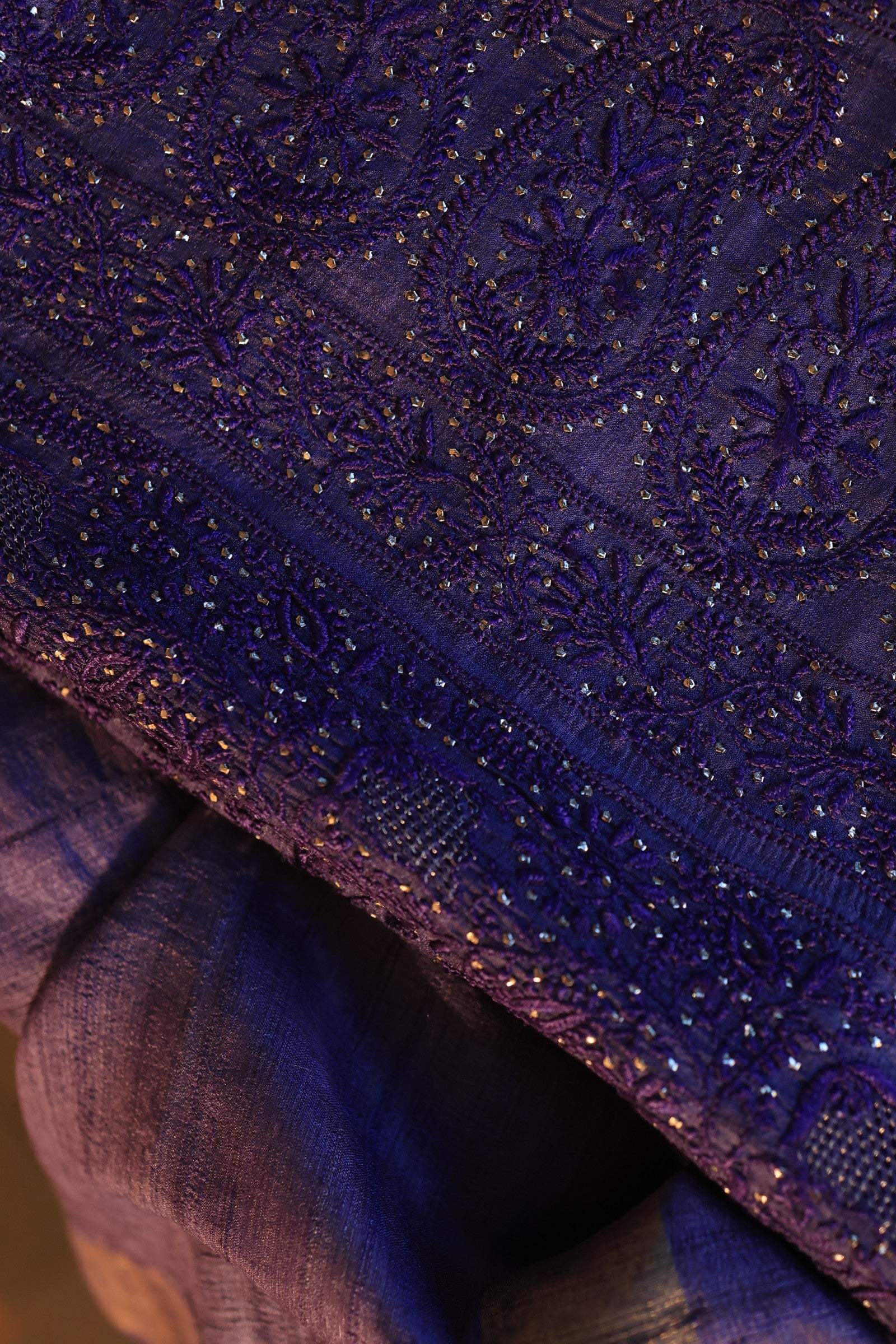 Tussar silk ensembles with impeccable dark-colour needle craft Chikankankari with timeless silk look with mukaish kamdani.
