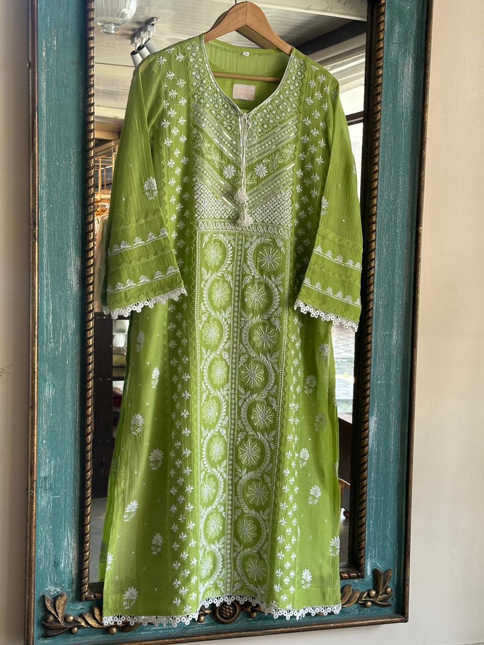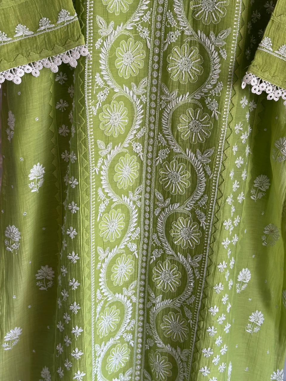This exquisite A line Kurta is a masterpiece of traditional craftsmanship, featuring intricate tone-to-tone Chikankari embroidery, pearl, and sequin work on luxurious mal chanderi fabric.
