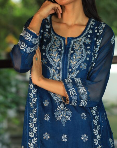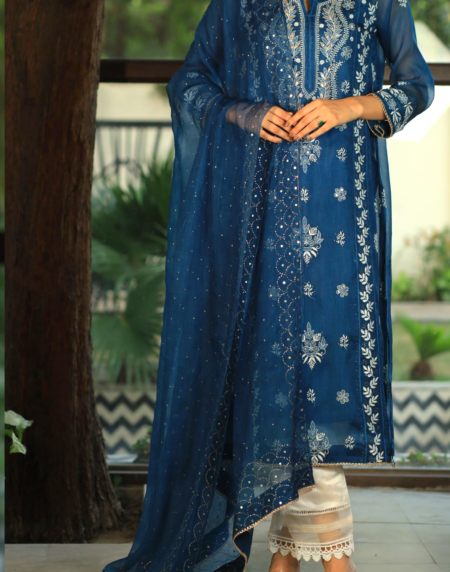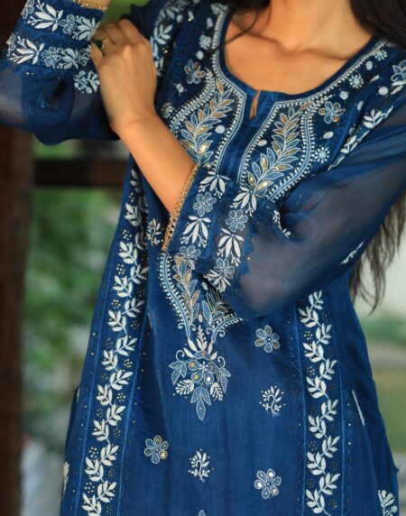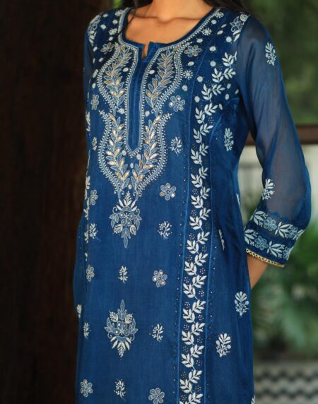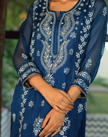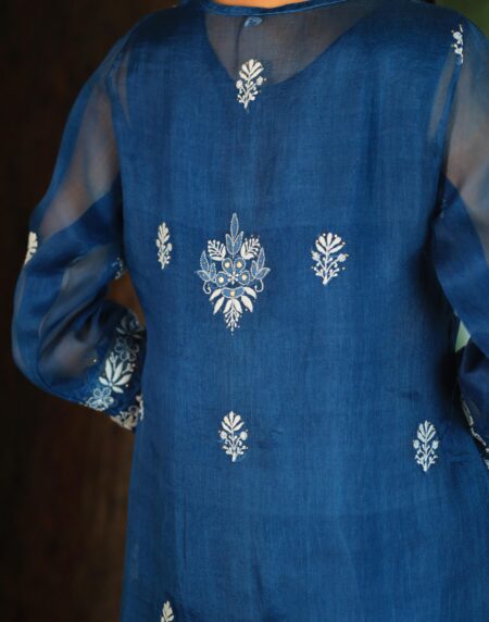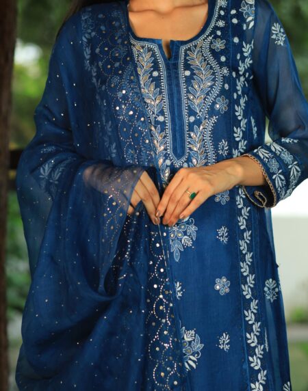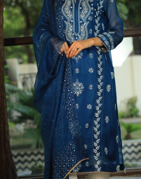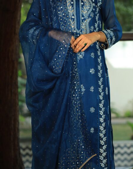 Noor Organza Chikankari Applique Kurta Set | Prussian Blue