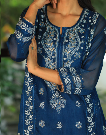Each piece is crafted with intricate hand-embroidered Chikankari, featuring different traditional embellishments: