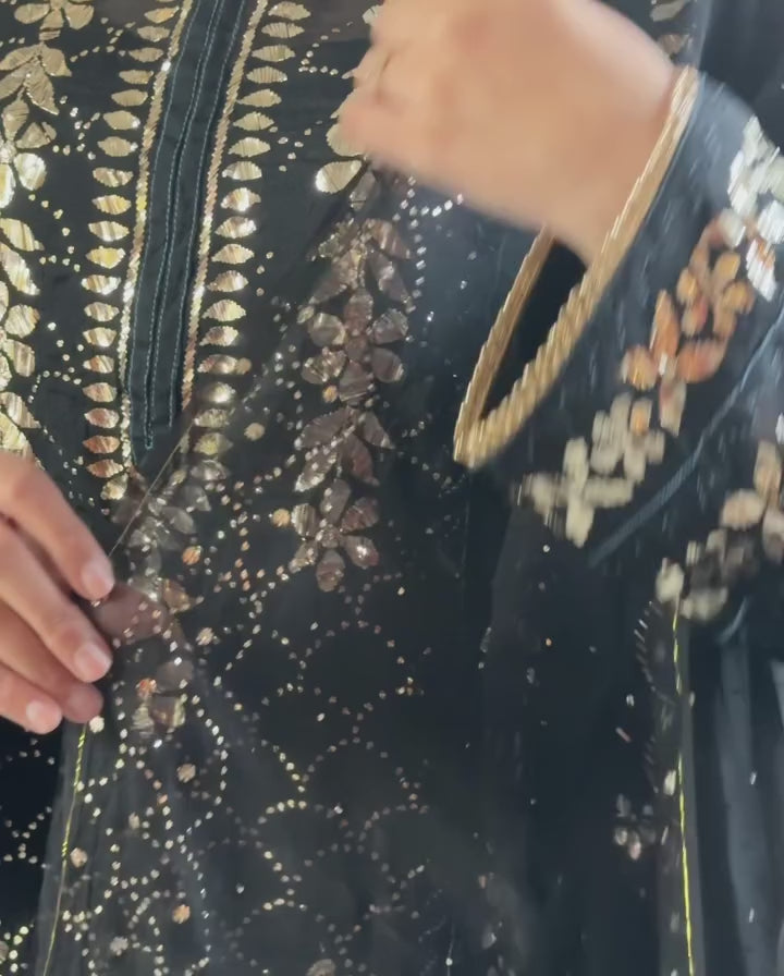 Elegant organza with mukaish embroidery done with the combination of appliqué work clubbed with Organza dupatta.