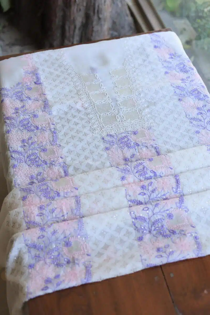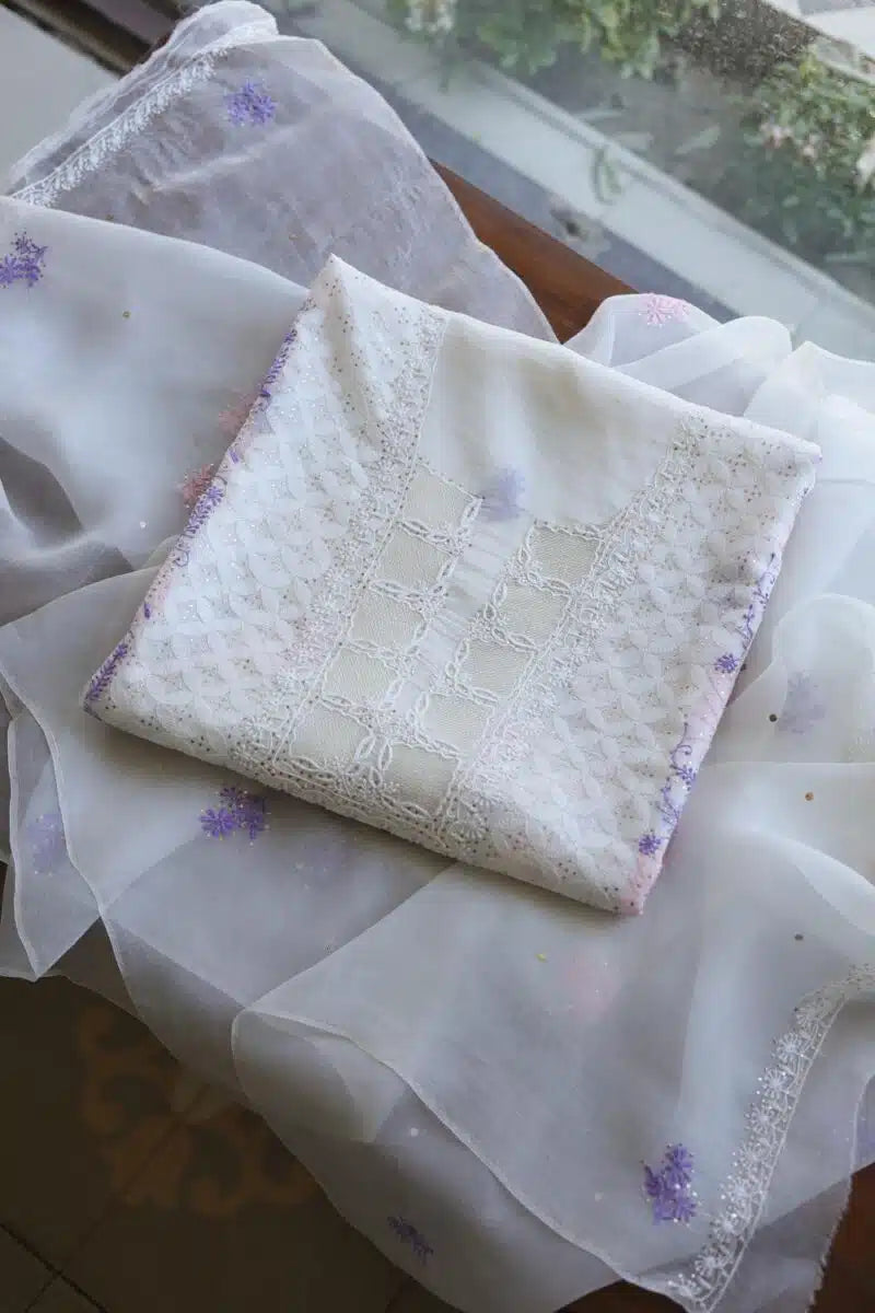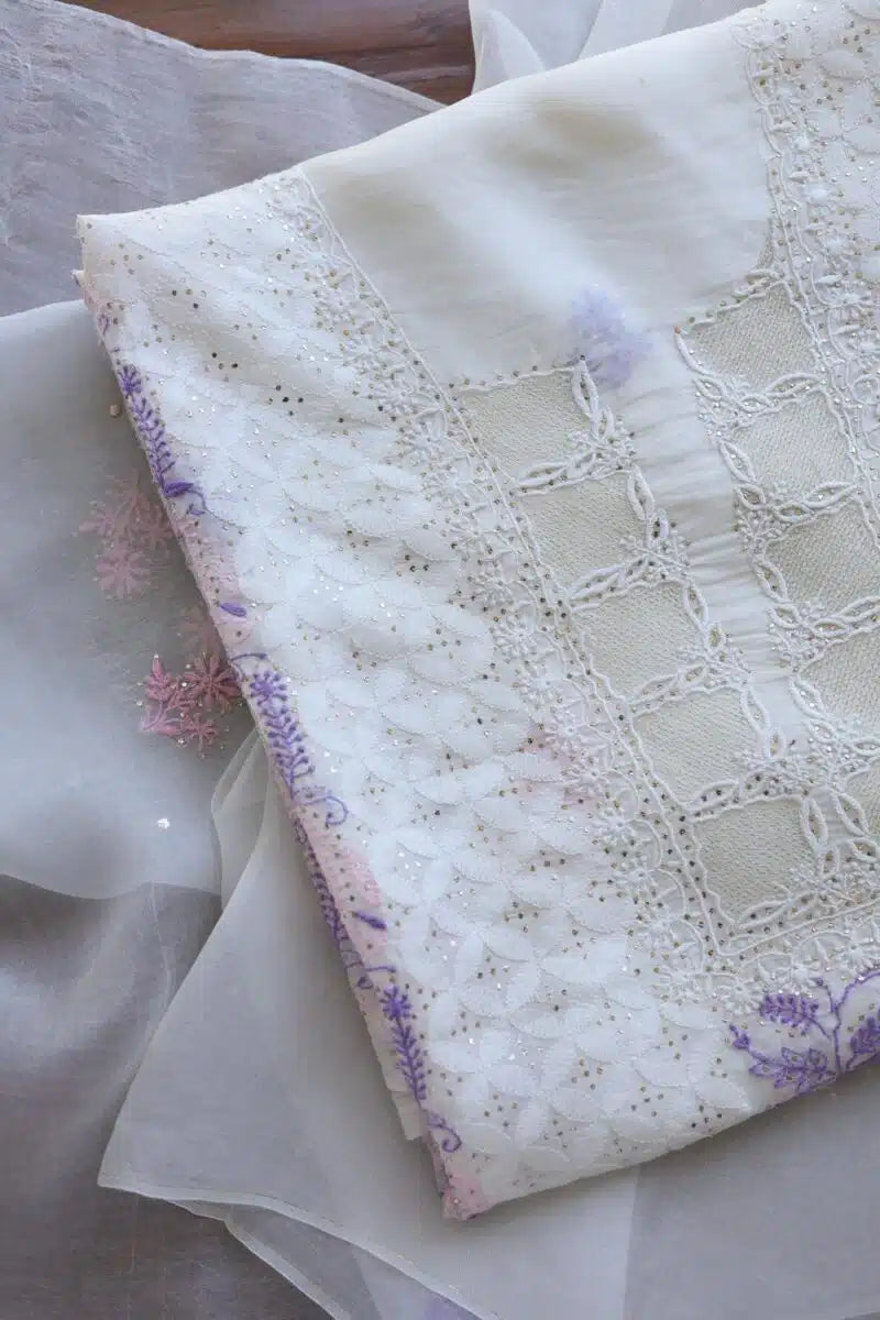 Each piece is crafted with intricate hand-embroidered Chikankari, featuring different traditional embellishments: