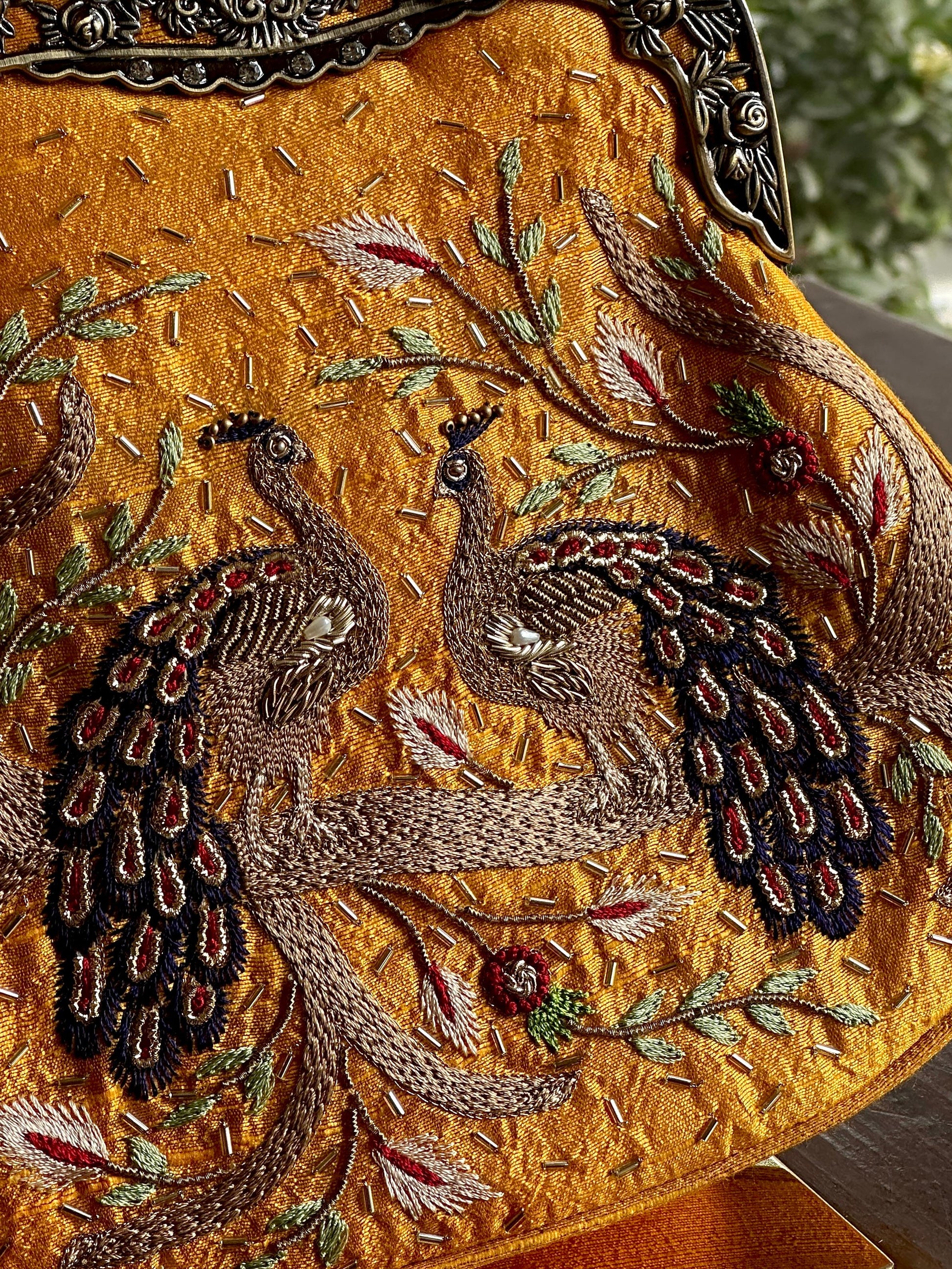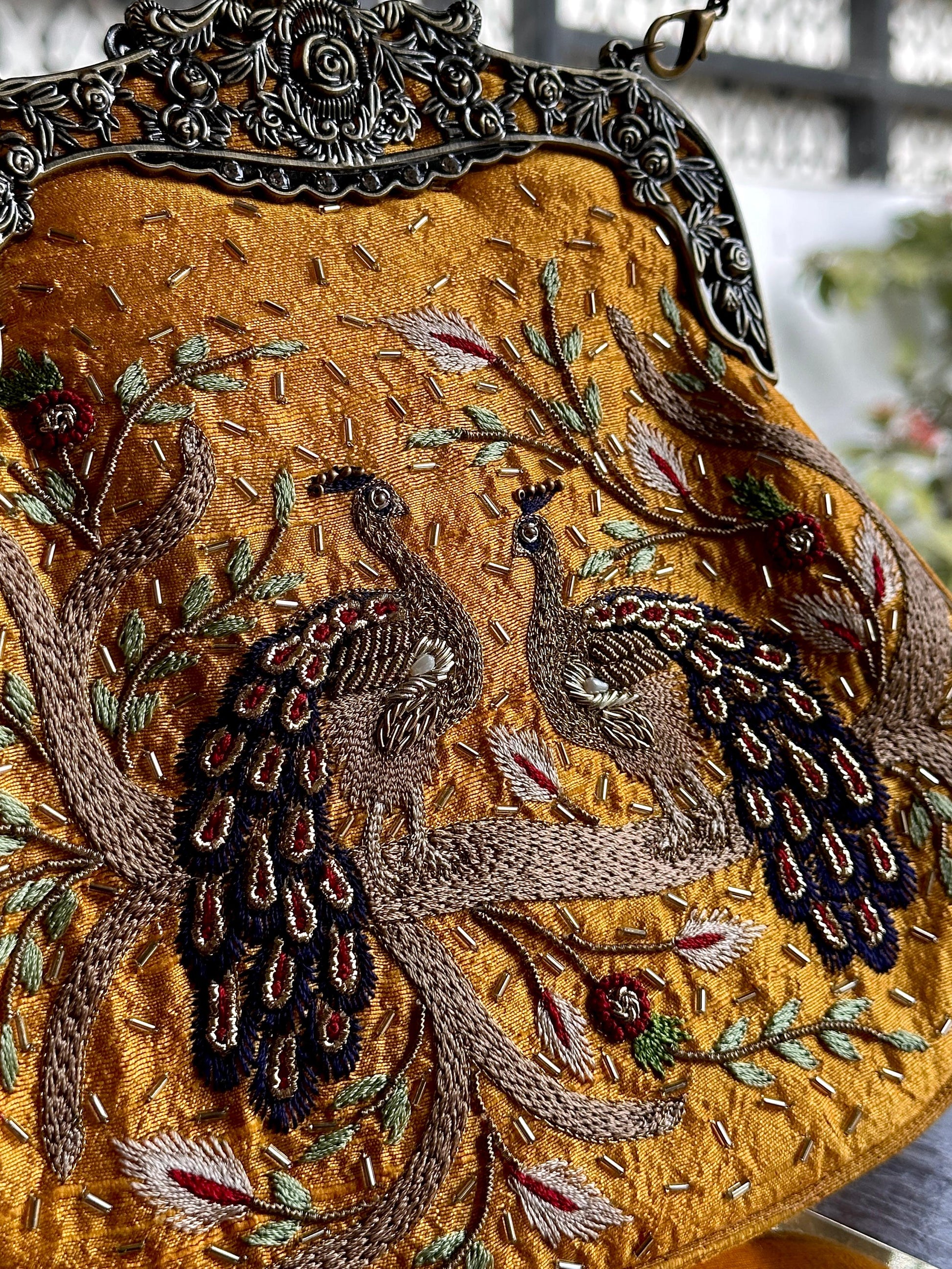 Ari and mukaish work done on the classic vintage sling bag for the everlasting look. Comes with A satin silk beace handle and metal chain.