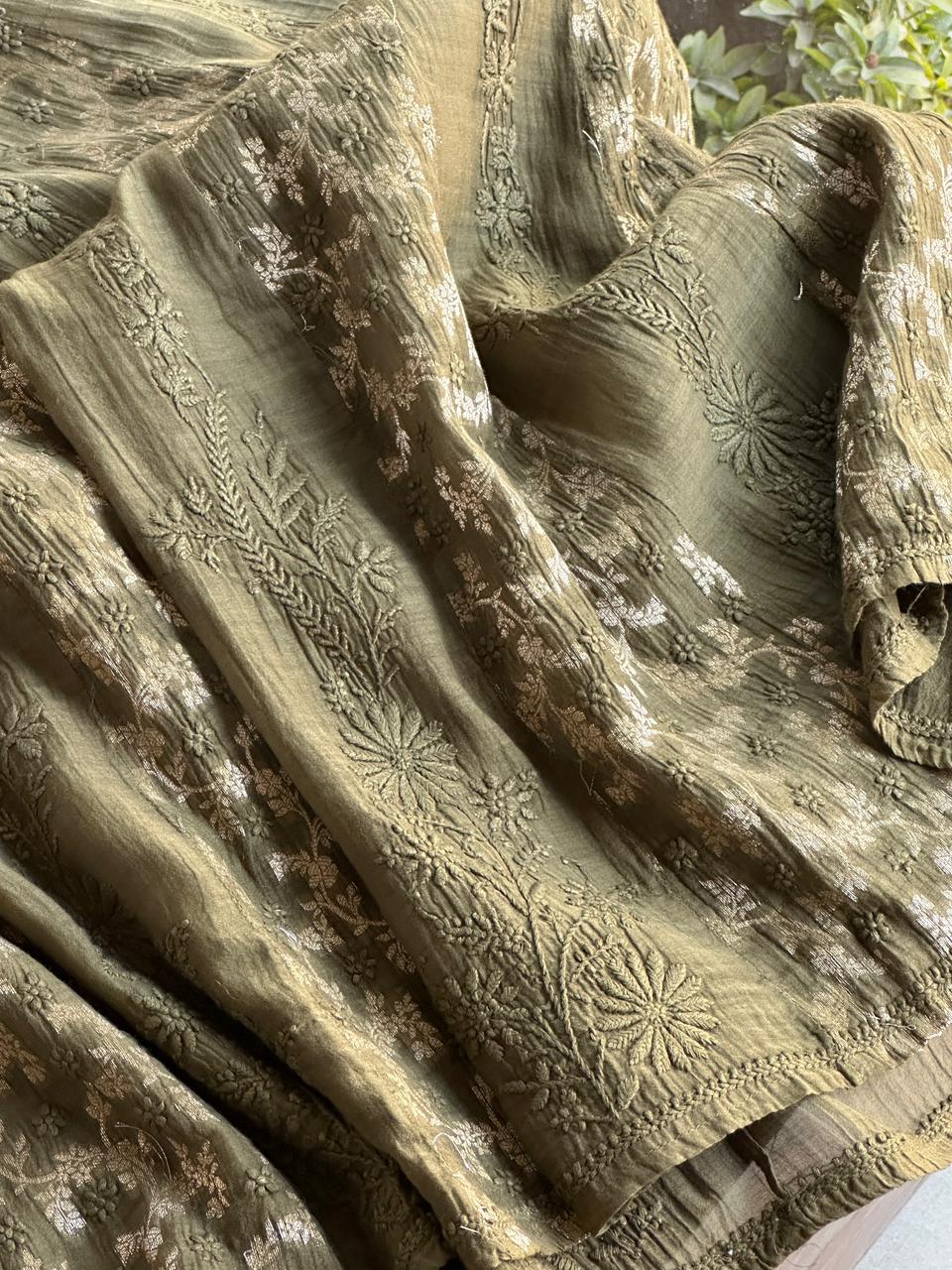Crafted in fine, lightweight Chanderi fabric, this kurta features delicate zari buti motifs woven across the surface, adding a subtle shimmer and refined charm. The soft olive green hue enhances its understated elegance, while the beautifully detailed neckline and sleeve borders reflect timeless craftsmanship. Breathable and graceful, this kurta is perfect for festive celebrations, intimate gatherings, and elegant daywear.