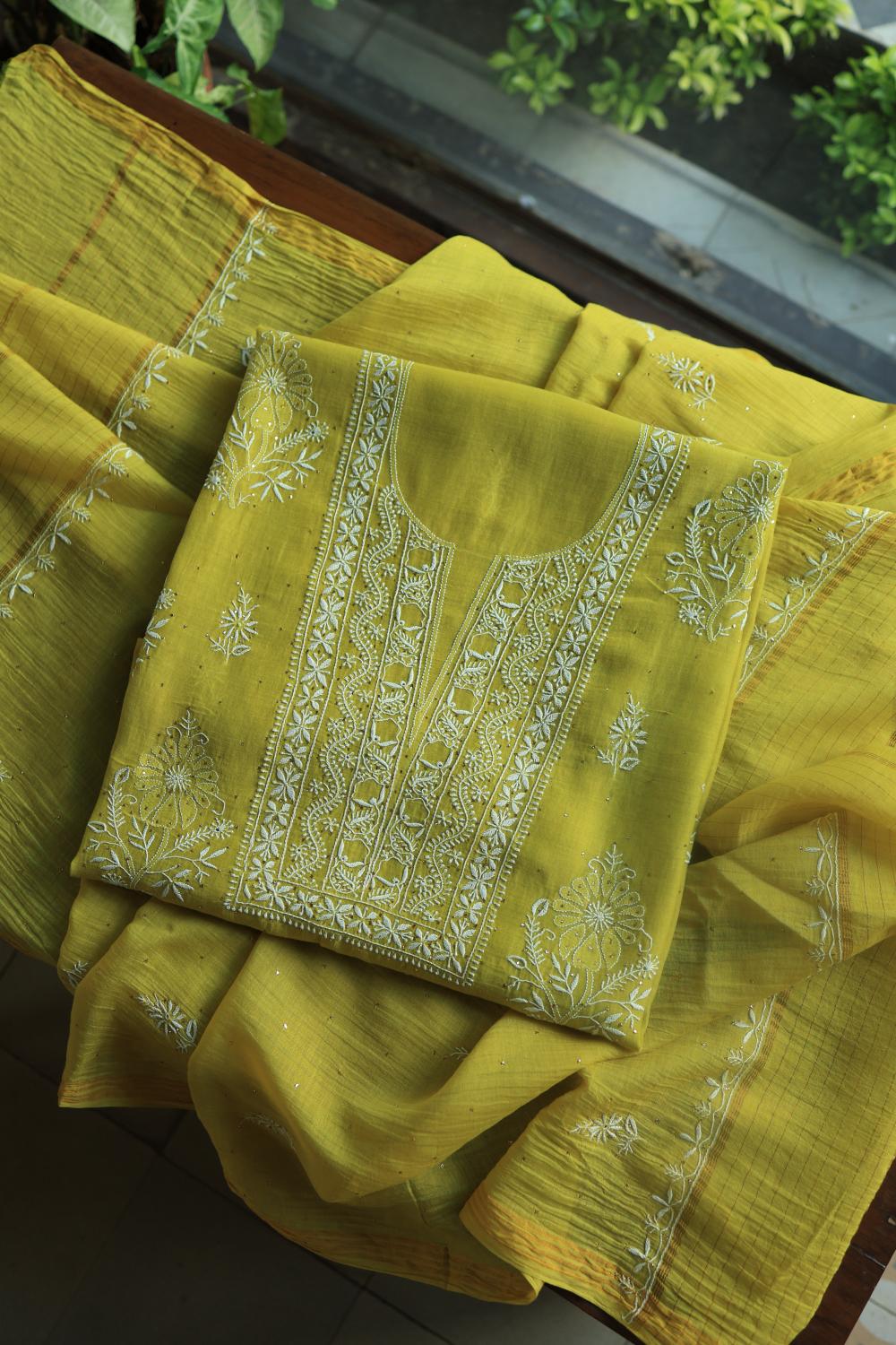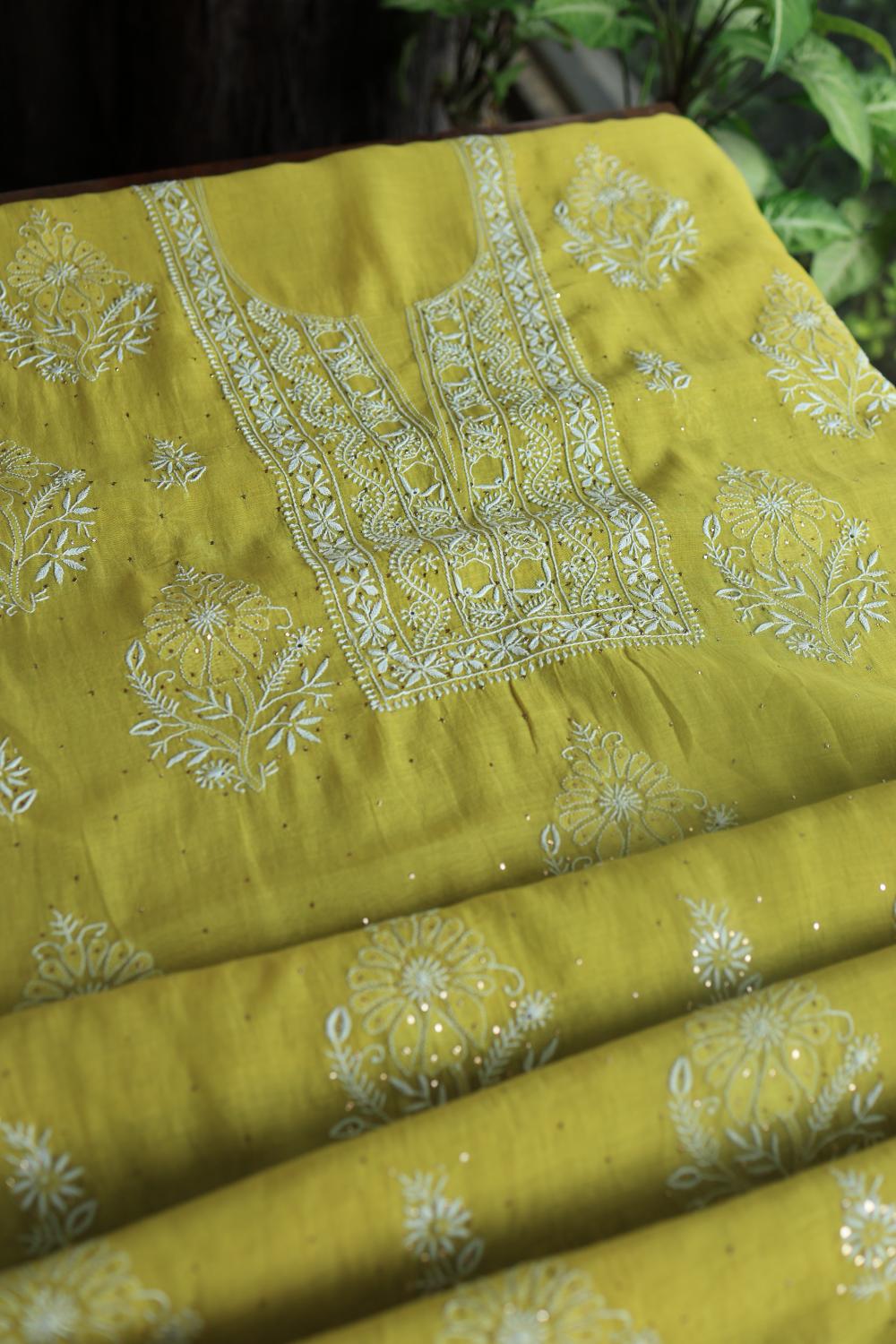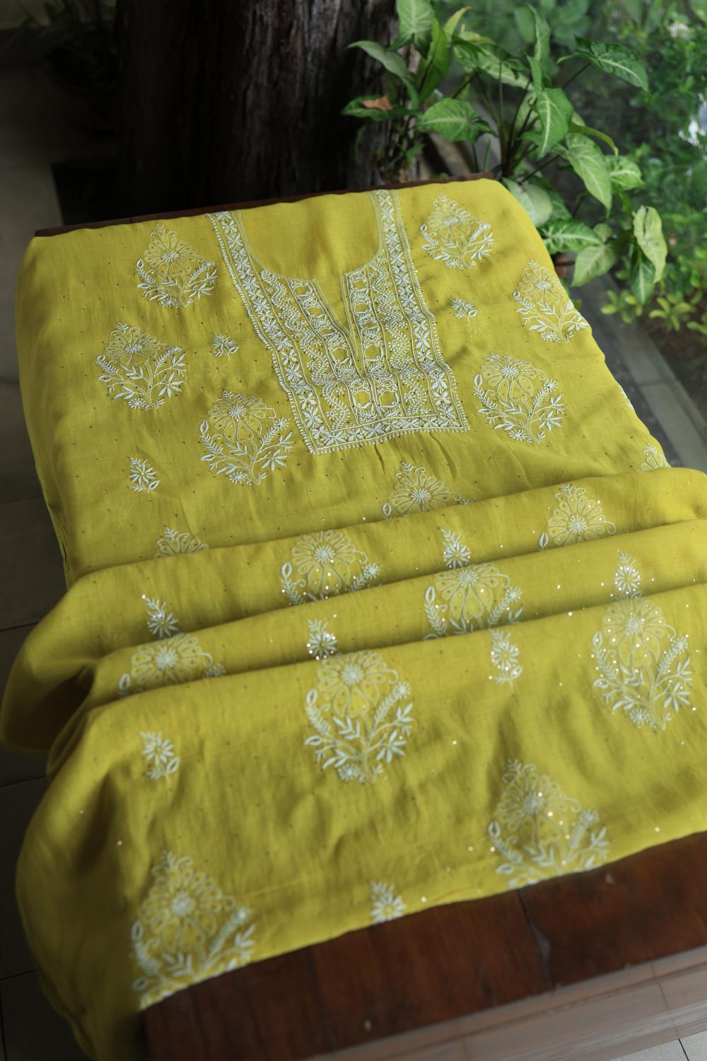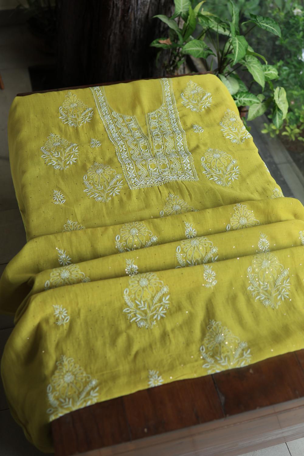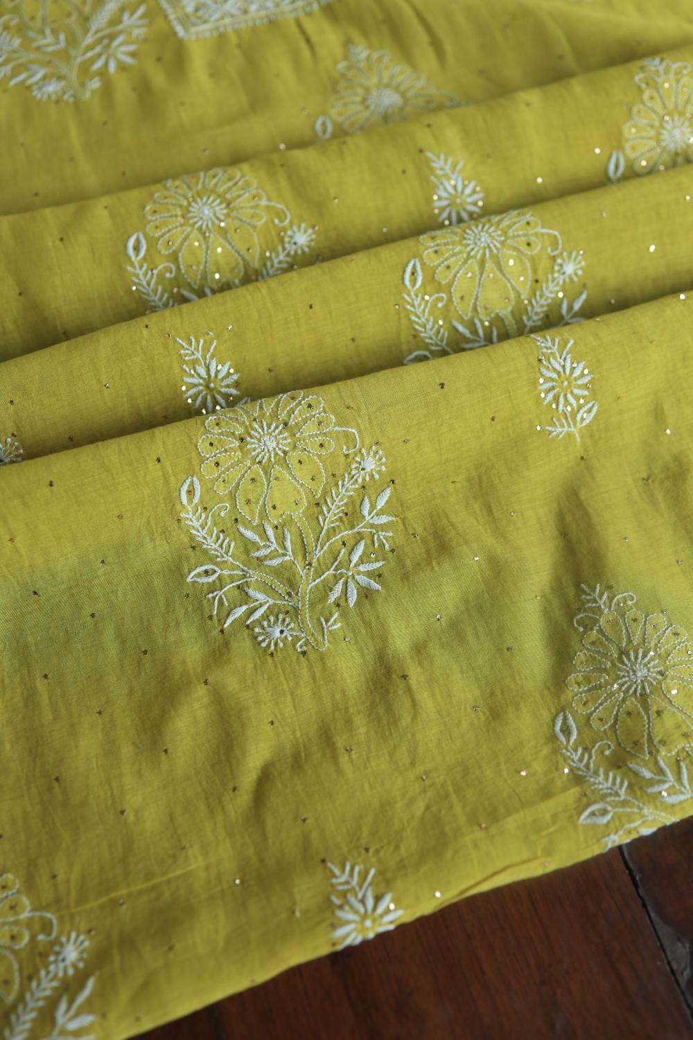 Olive Green Mal Cotton Fine Chikankari With Kamdani Work Unstitched Fabric