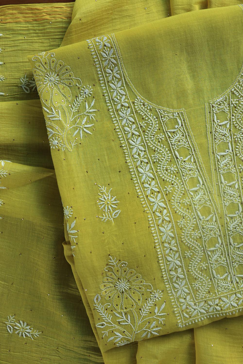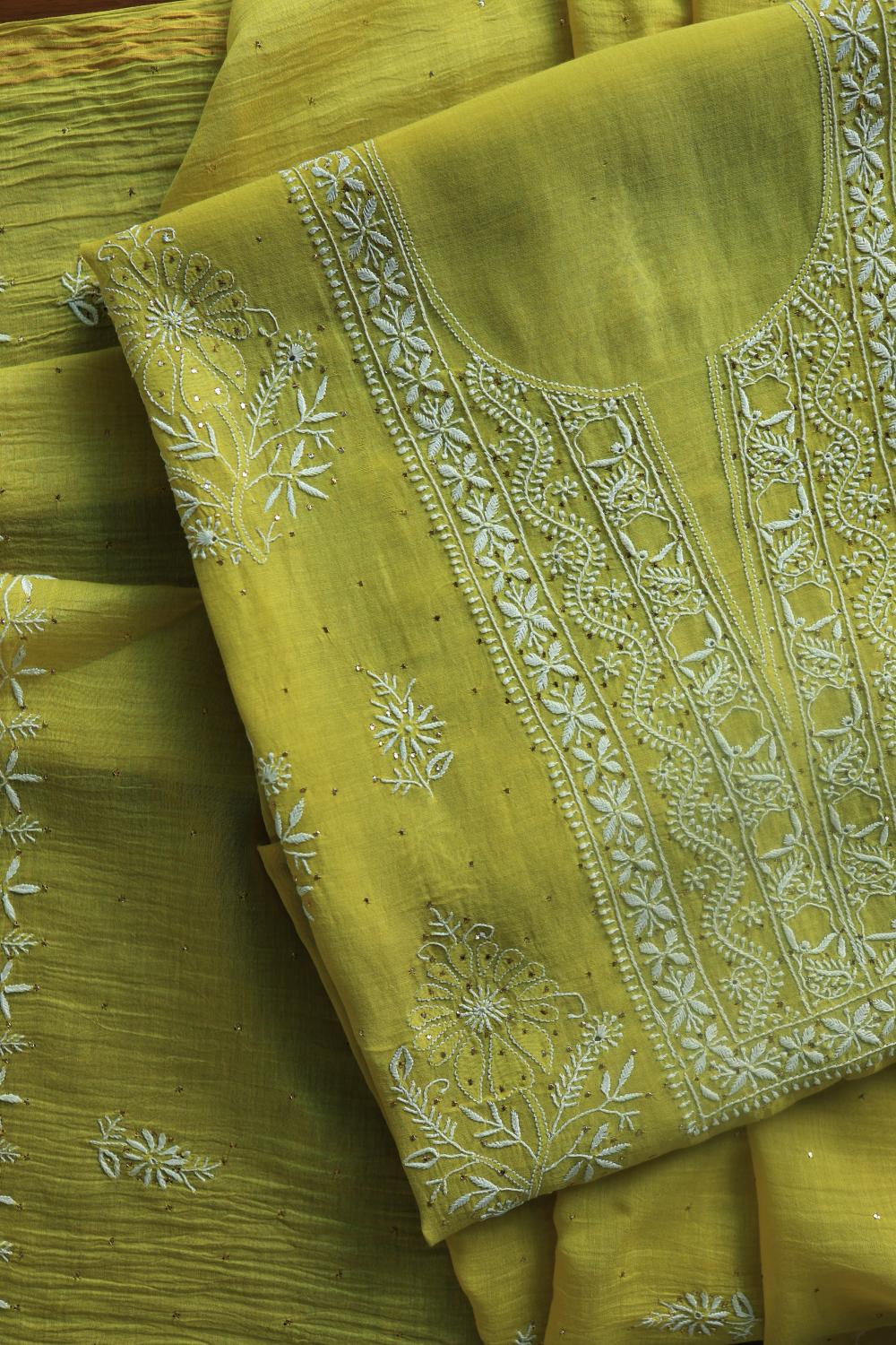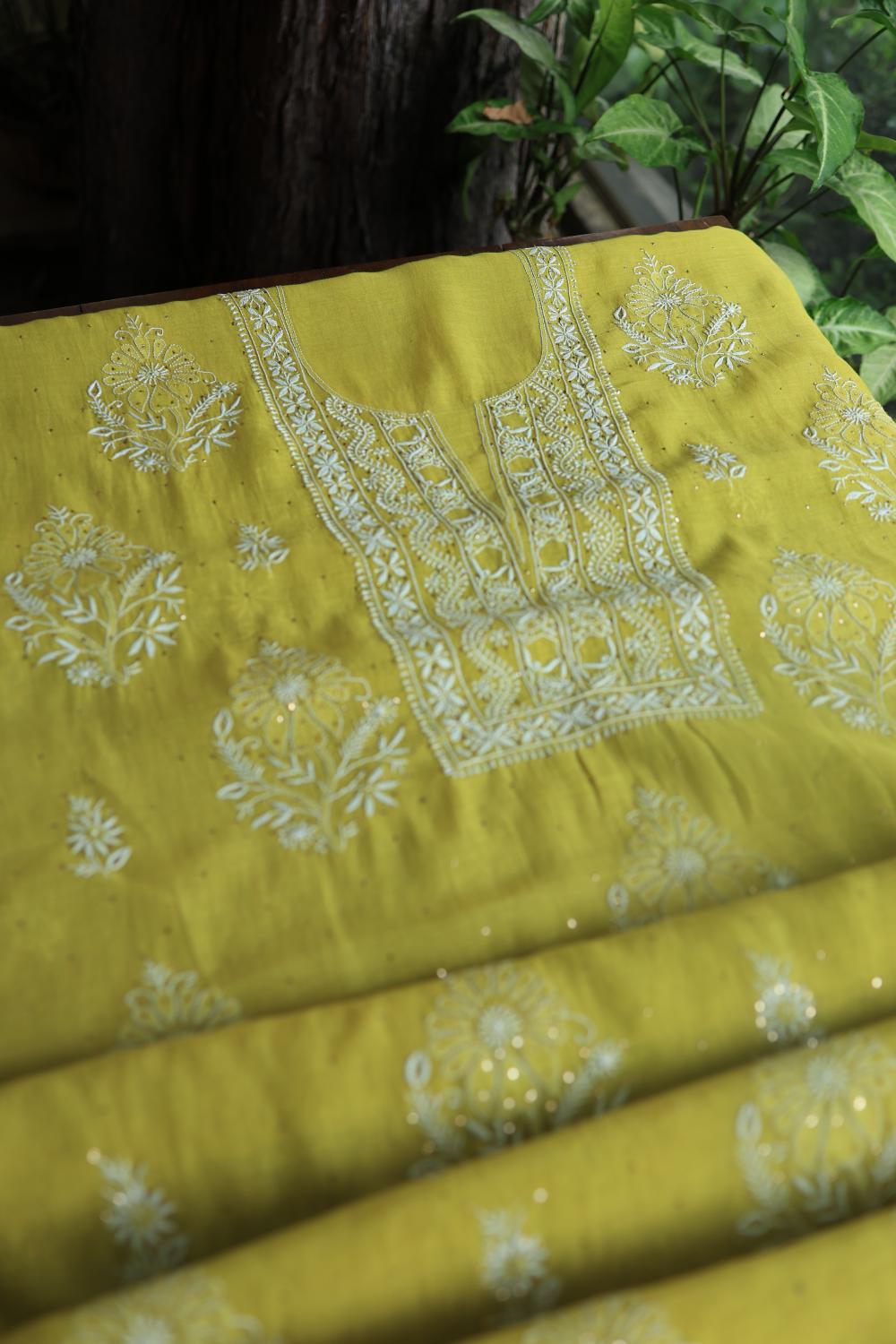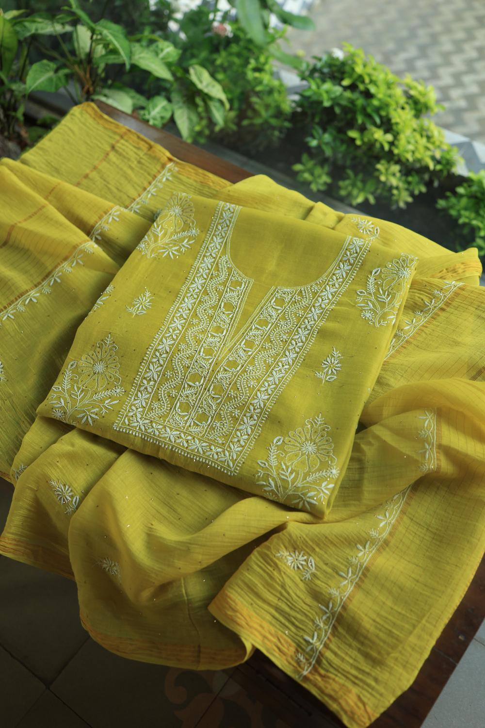 Olive Green Mal Cotton Fine Chikankari With Kamdani Work Unstitched Fabric