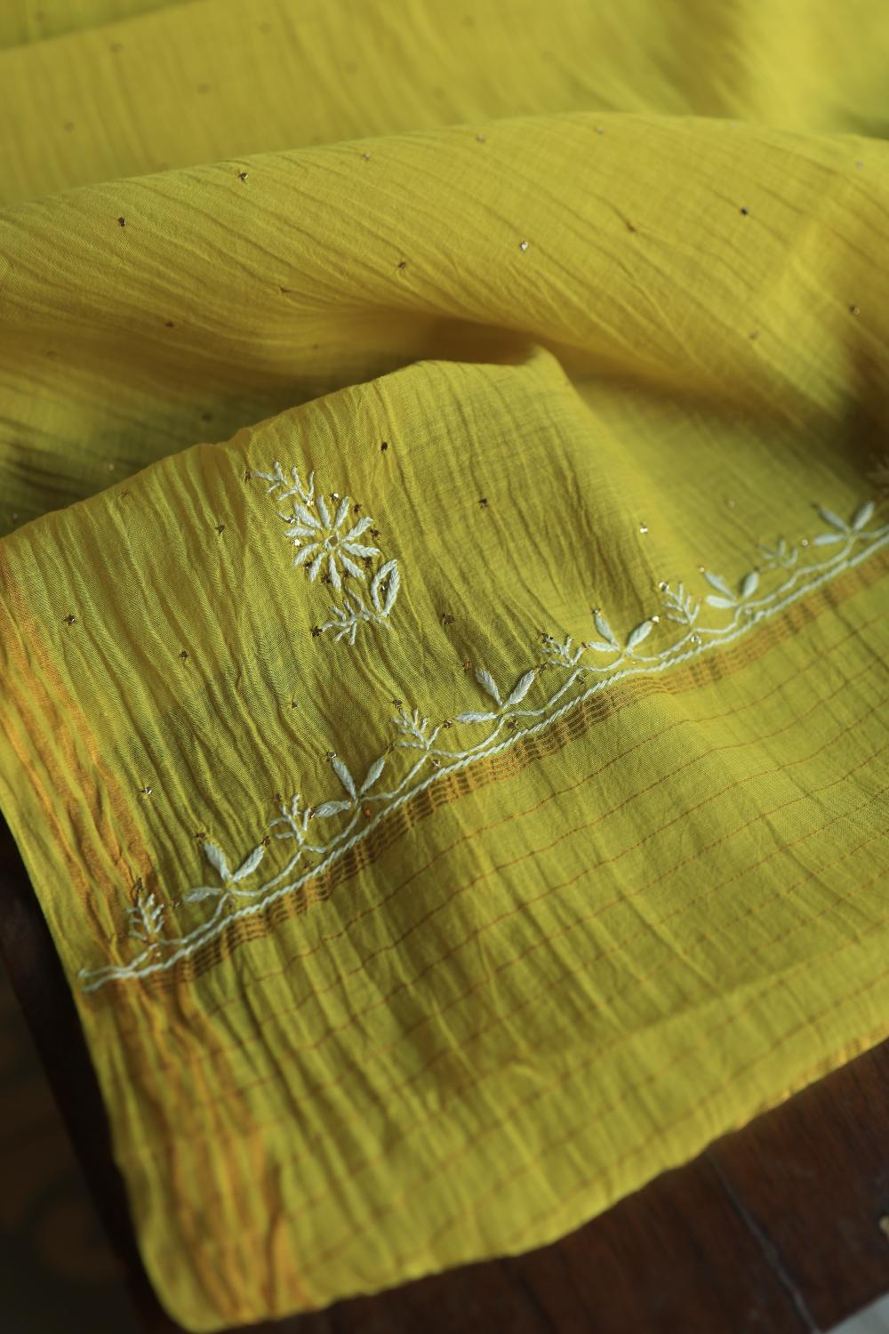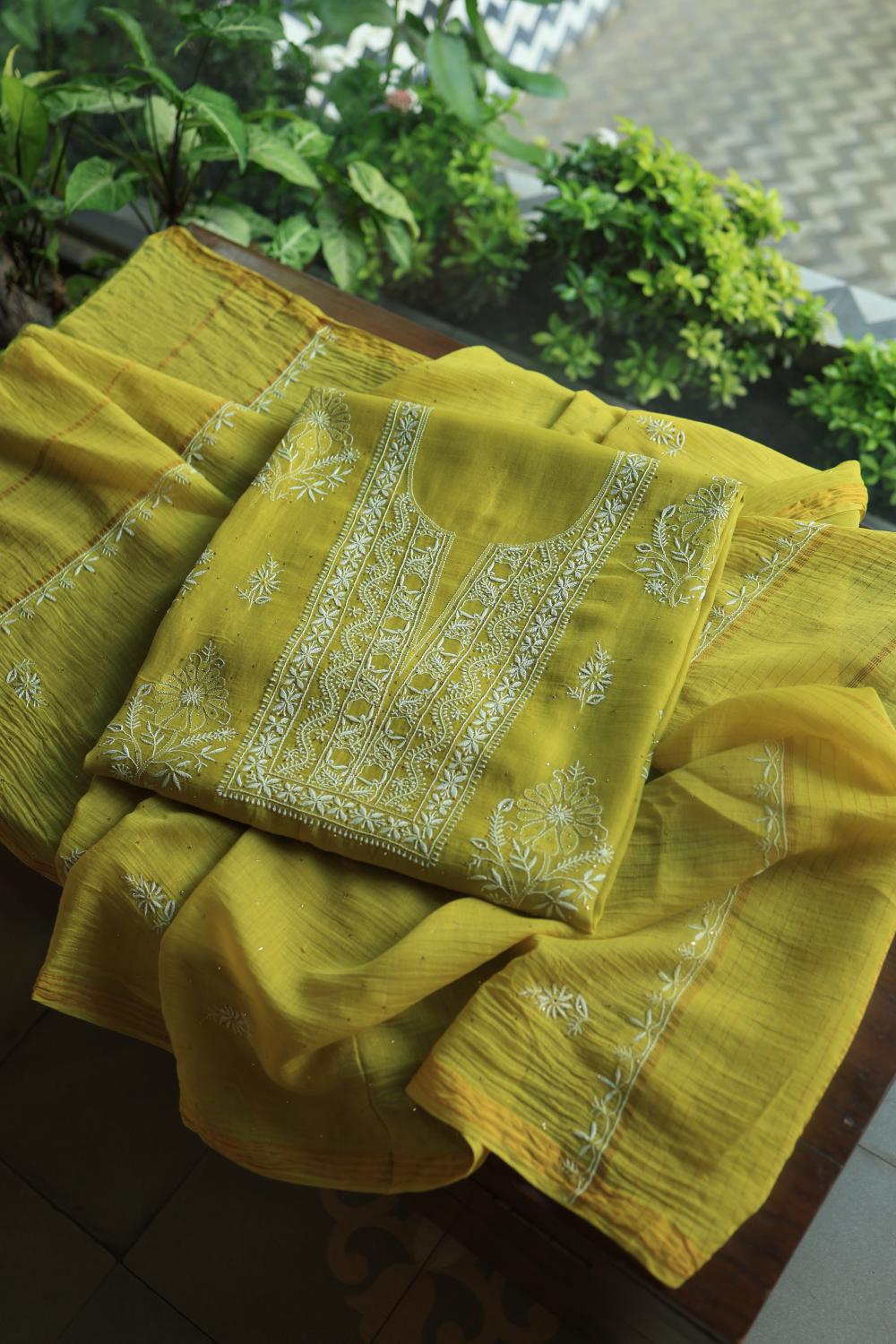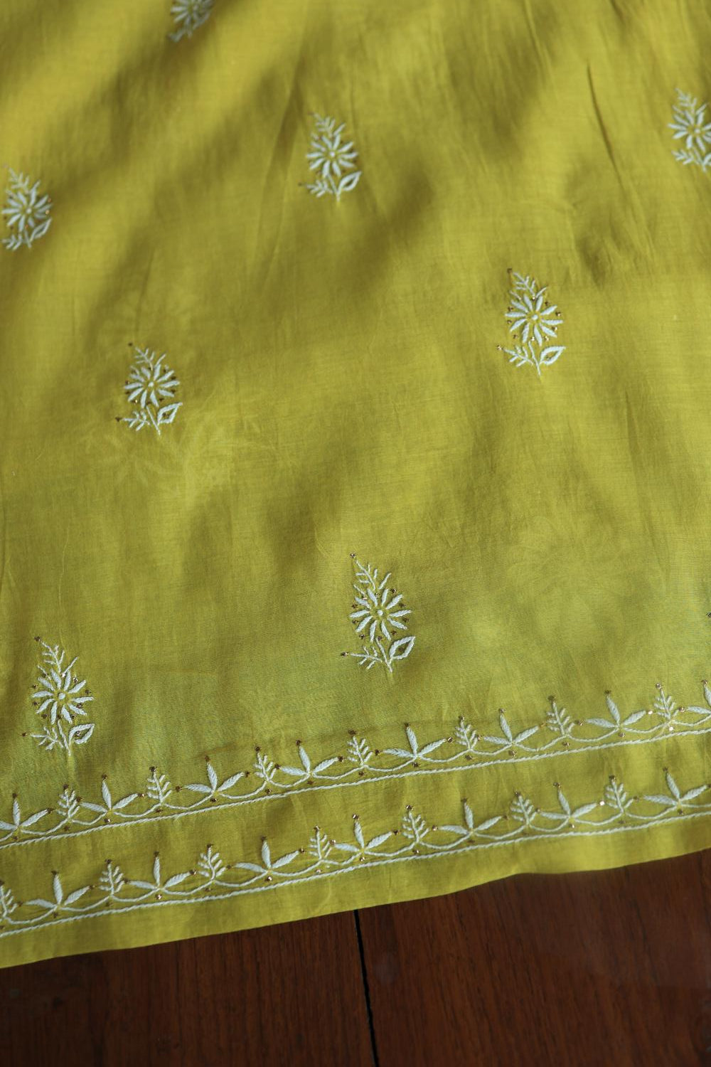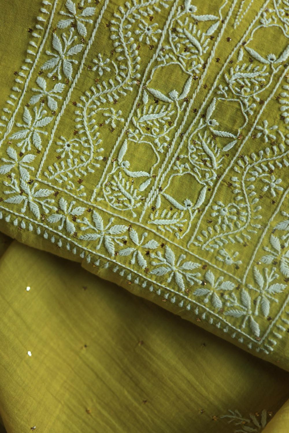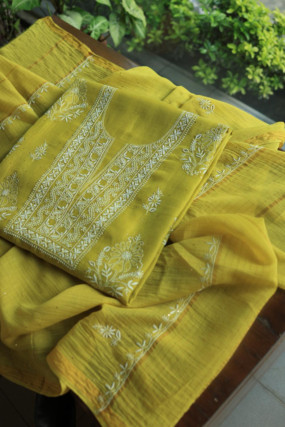 Olive Green Mal Cotton Fine Chikankari With Kamdani Work Unstitched Fabric