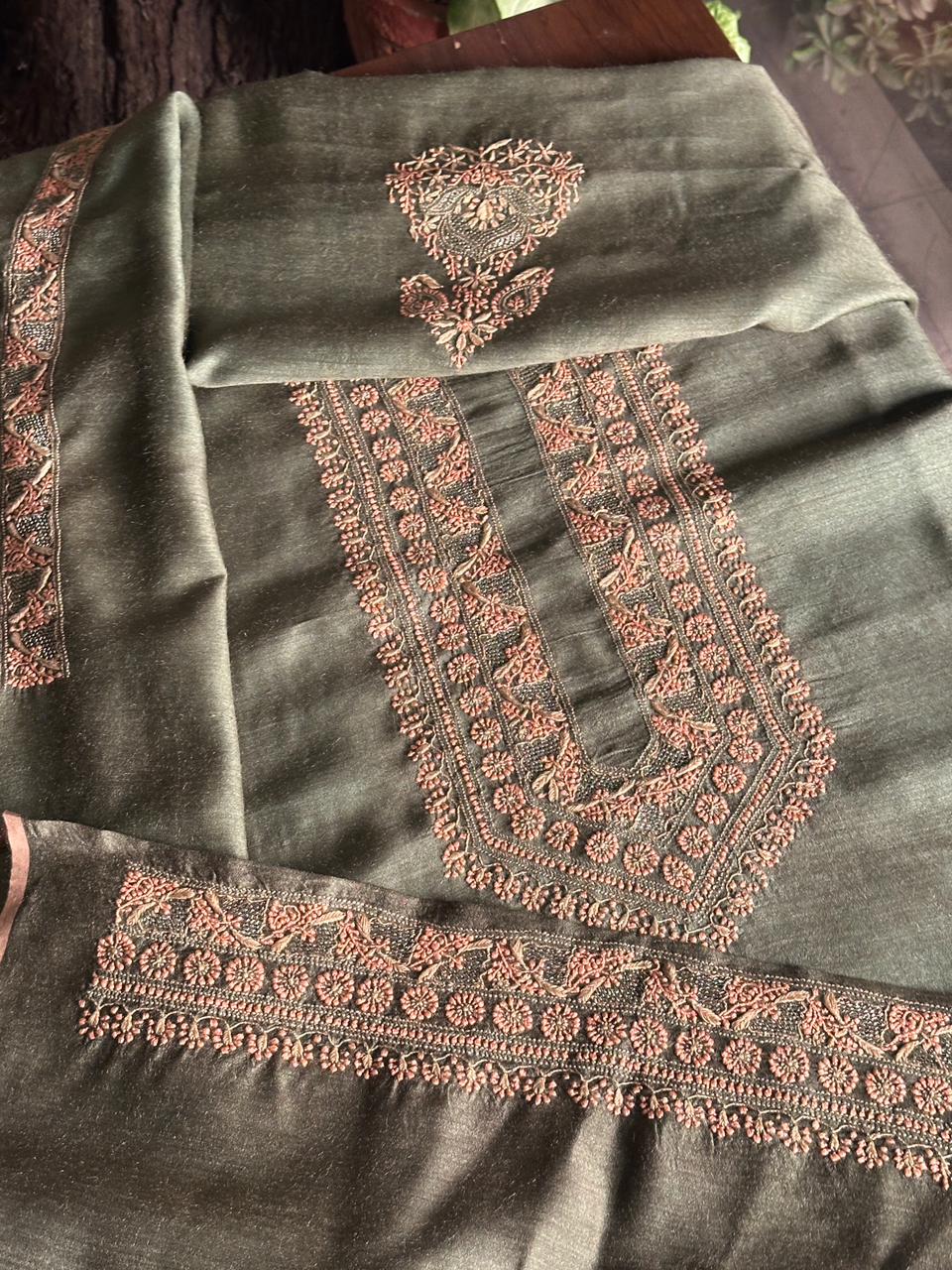 Olive Green Moonga Silk Chikankari Men’s Kurta Fabric
