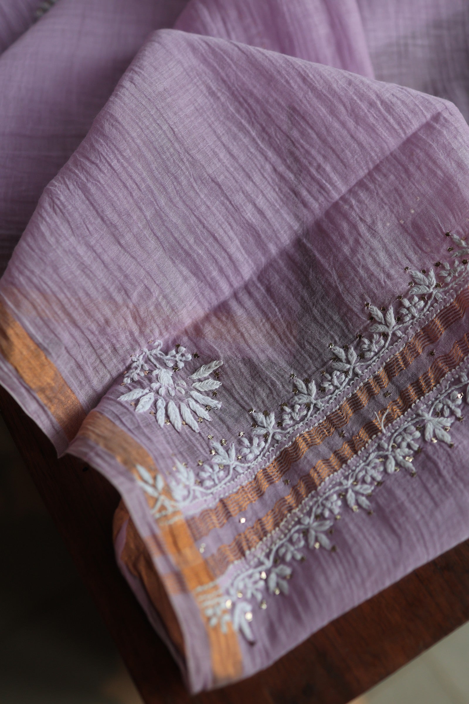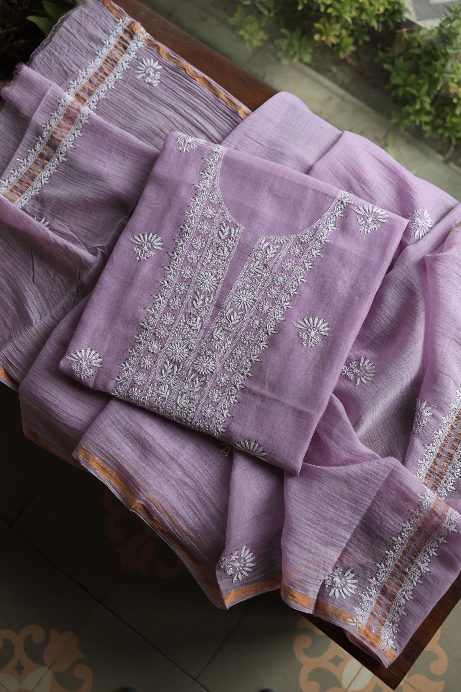 Mal Cotton, Mal Chanderi or Cotton by Cotton is a super breezy and summer-friendly fabric that you can wear anytime of day. These unstitched Kurta Dupatta sets are elegant and comfortable to wear for home or office. Done with fine Chikankari of modern motifs all over and a sprinkle of Mukaish Kamdani work.