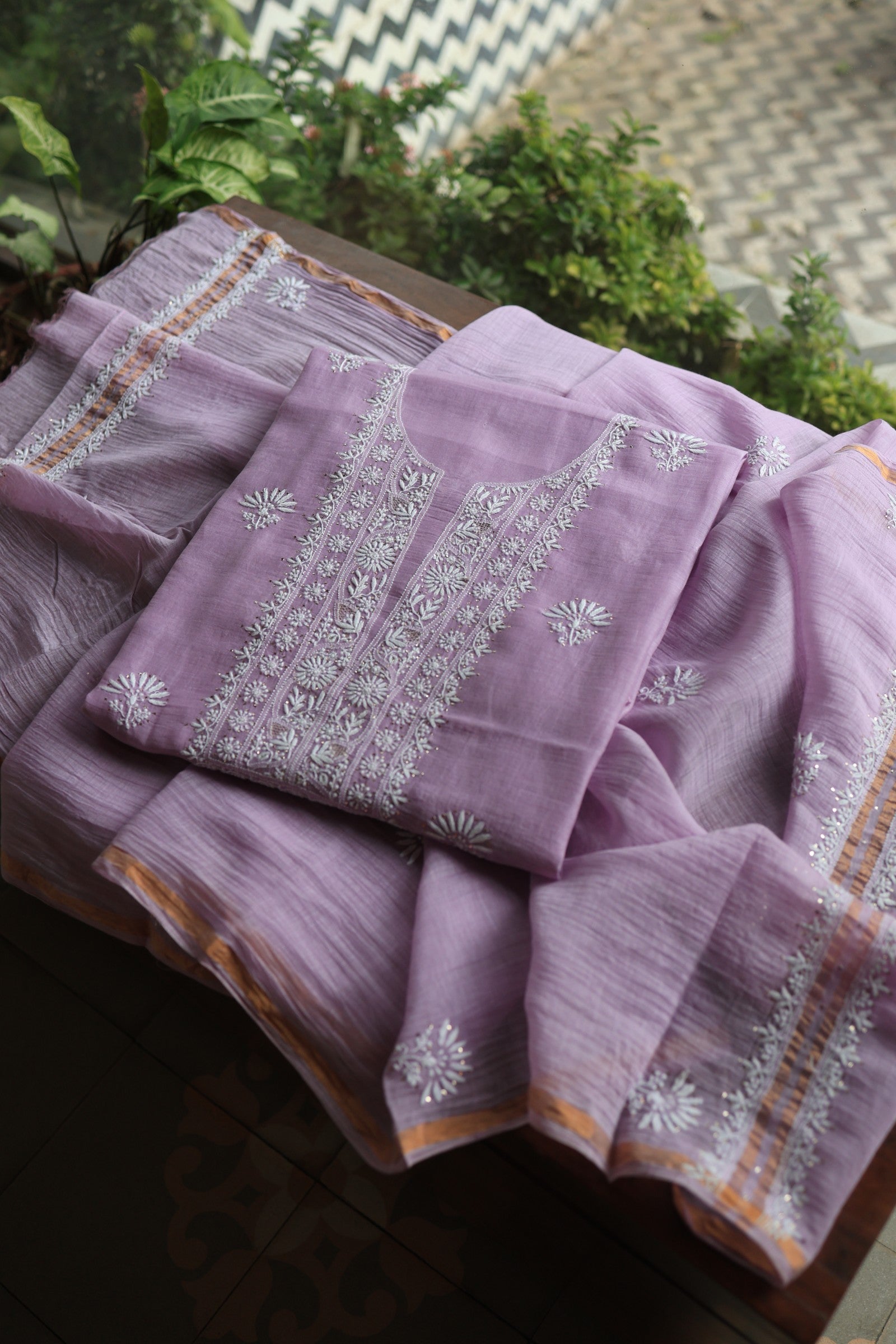 Each piece is crafted with intricate hand-embroidered Chikankari, featuring different traditional embellishments:
