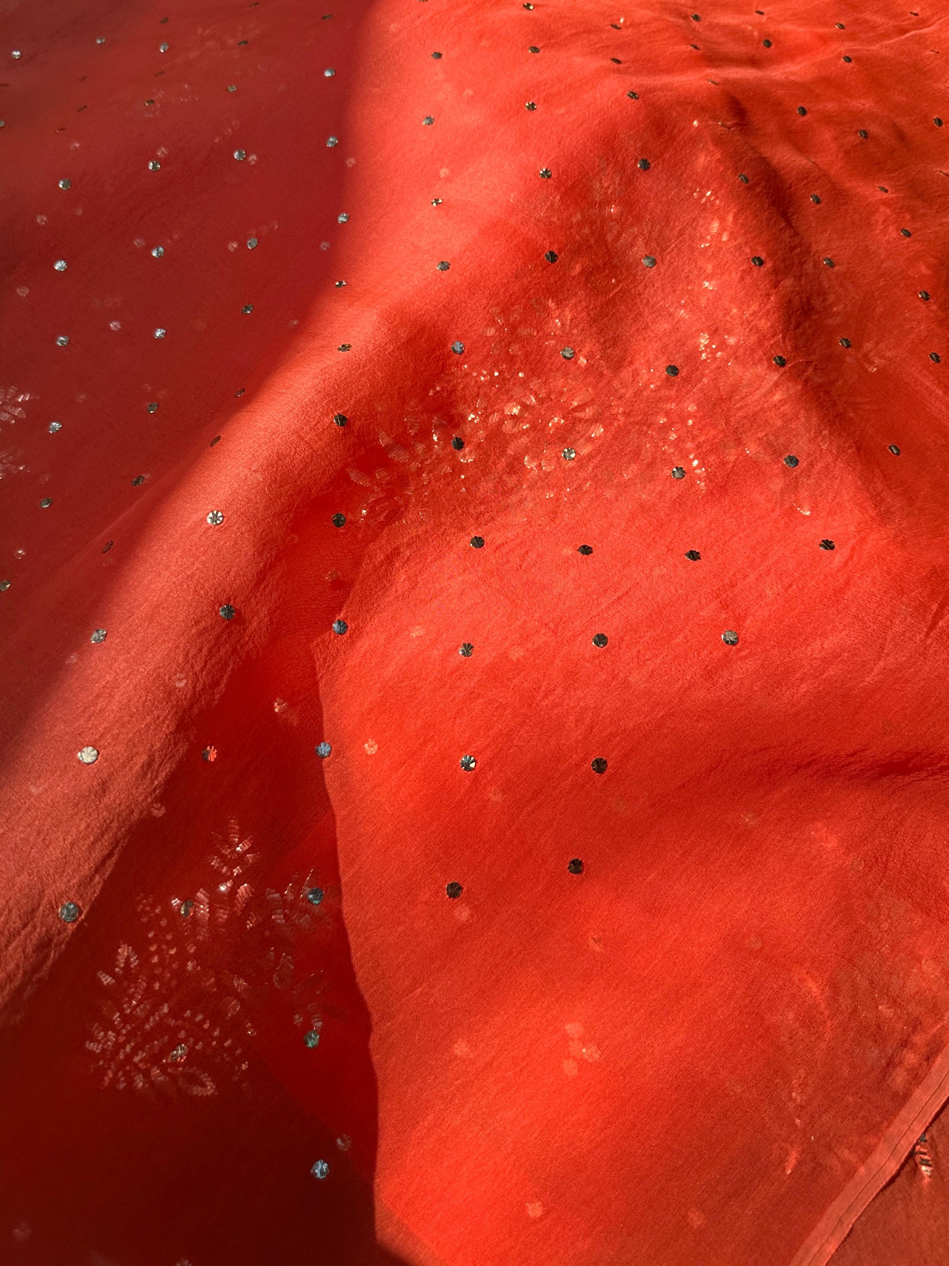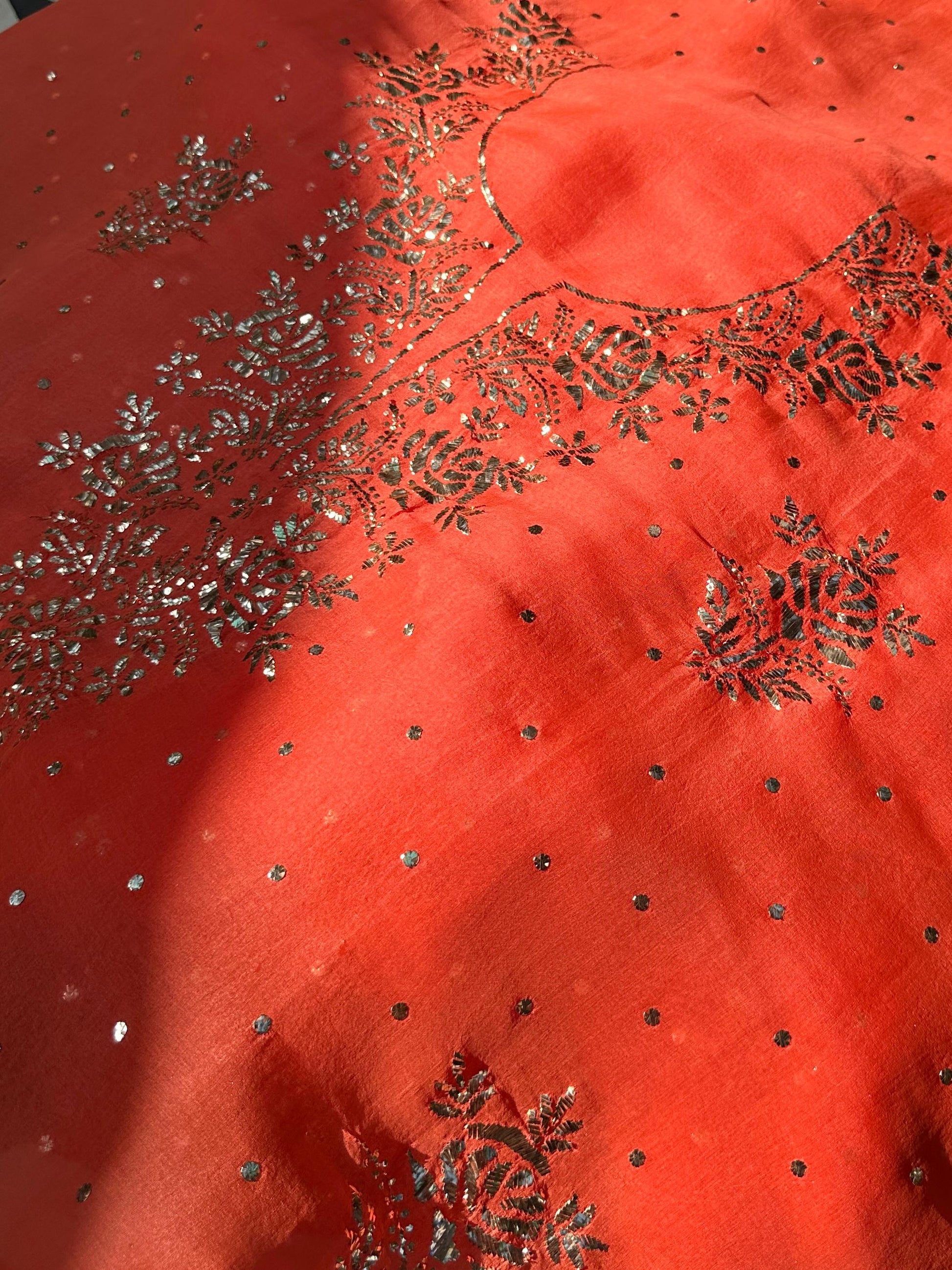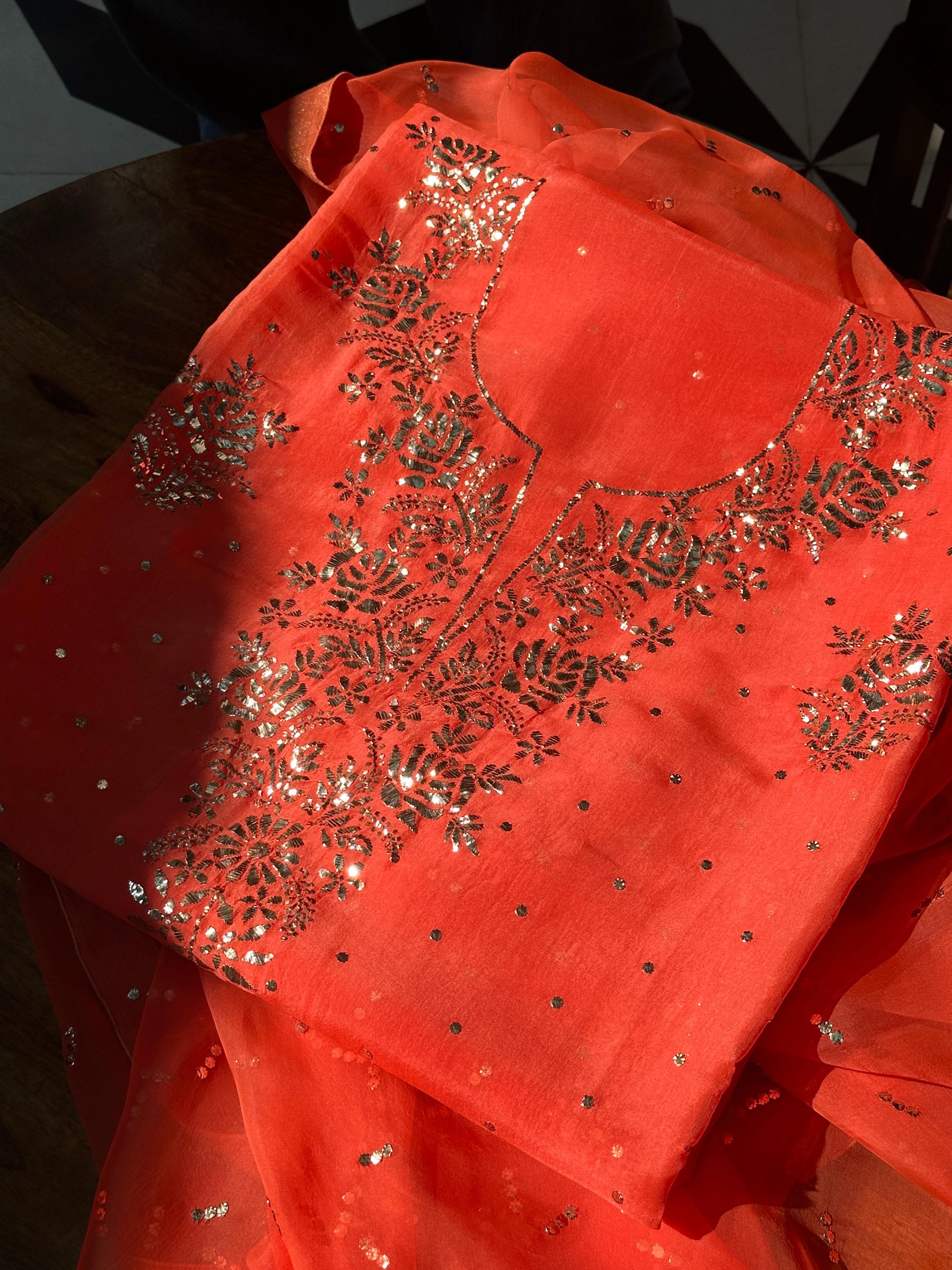 Neon Orange Noor Organza Silk Mukaish Badla Unstitched Kurta Dupatta Set
