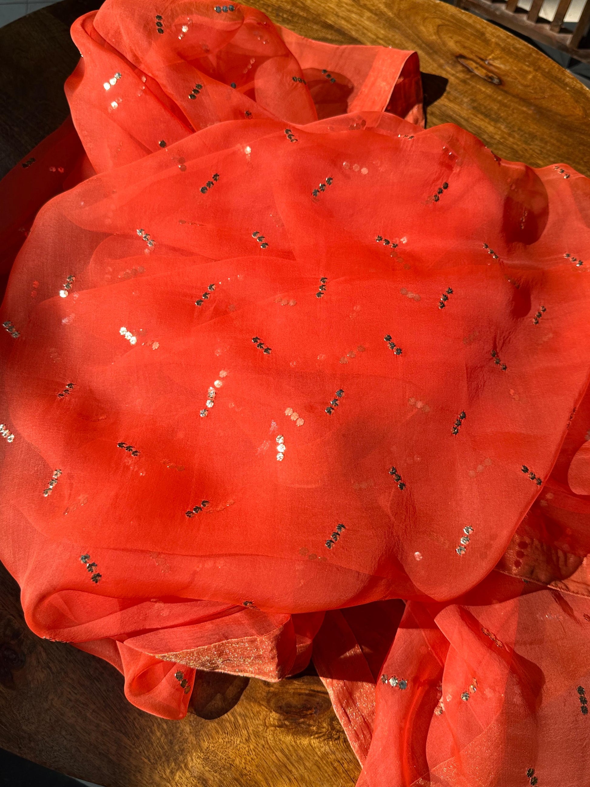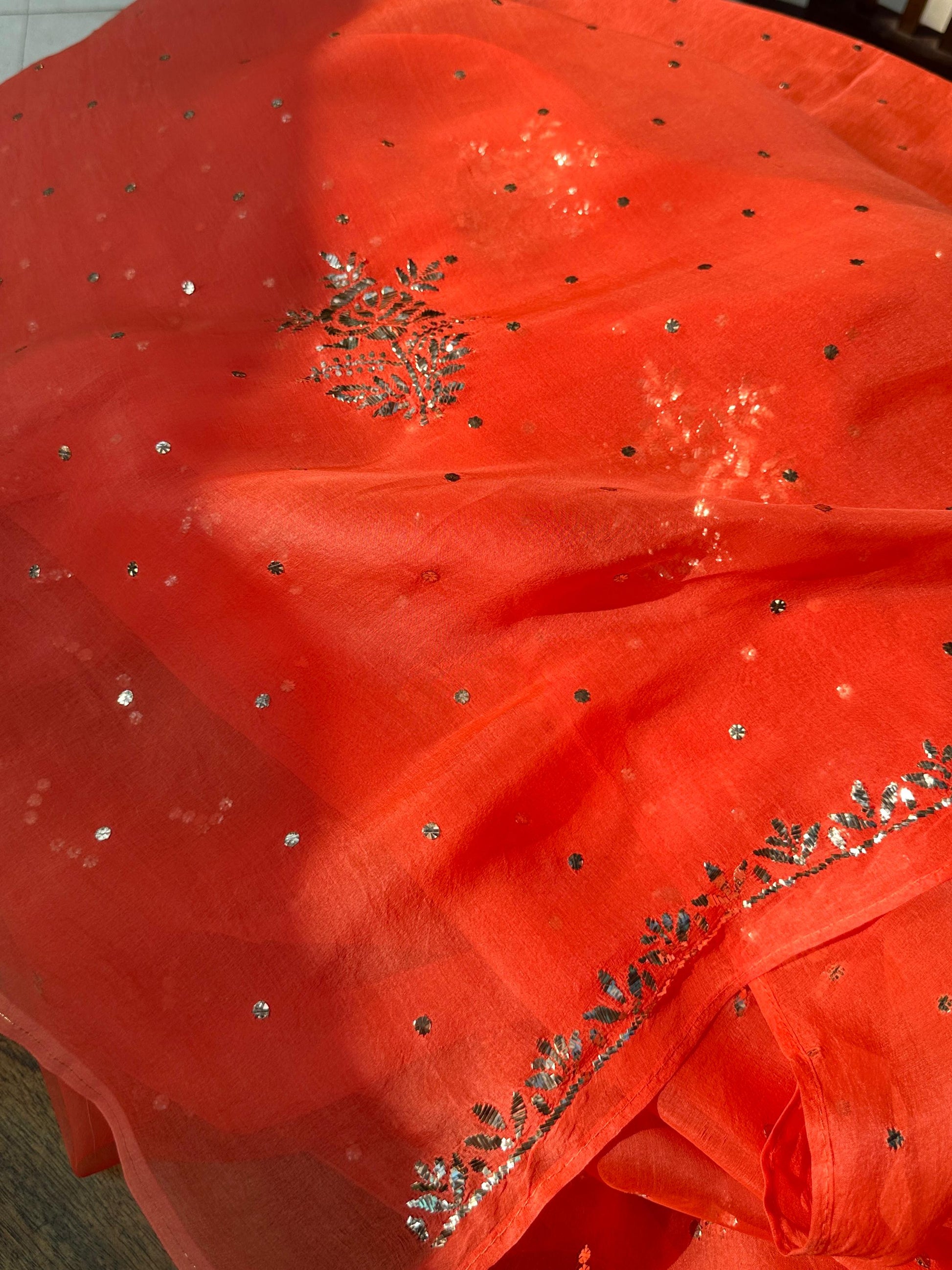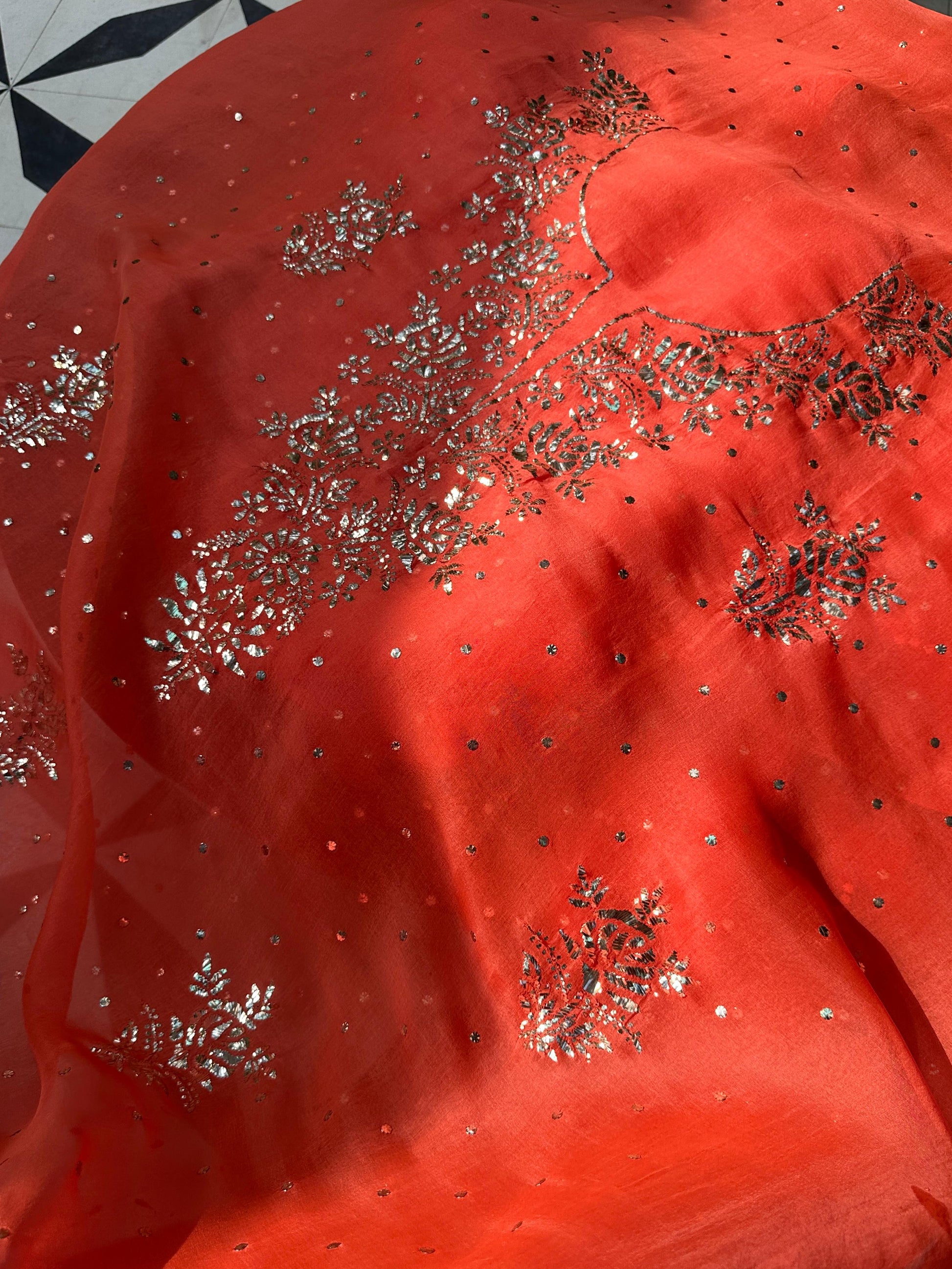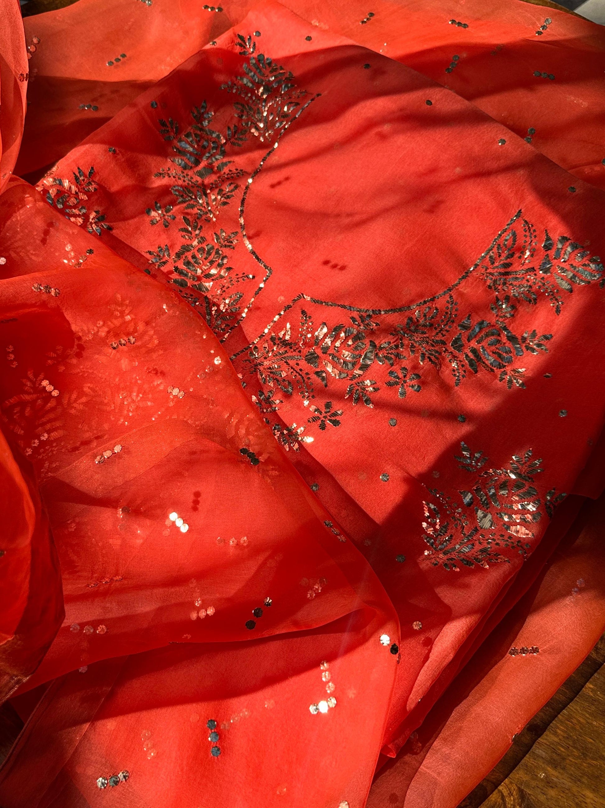 Neon Orange Noor Organza Silk Mukaish Badla Unstitched Kurta Dupatta Set