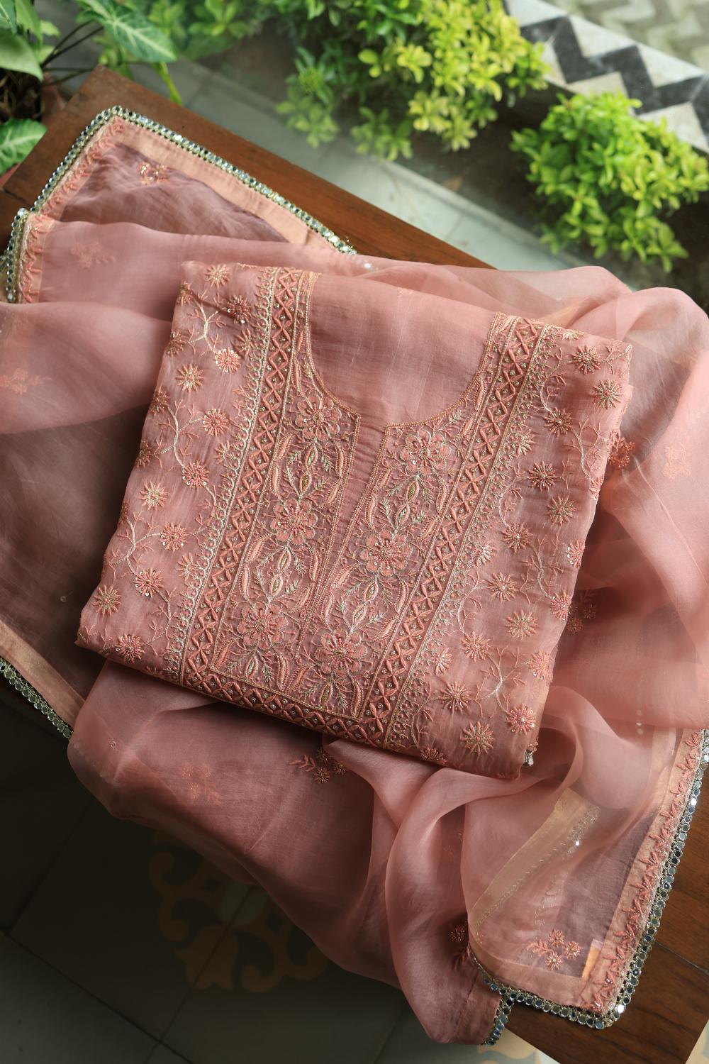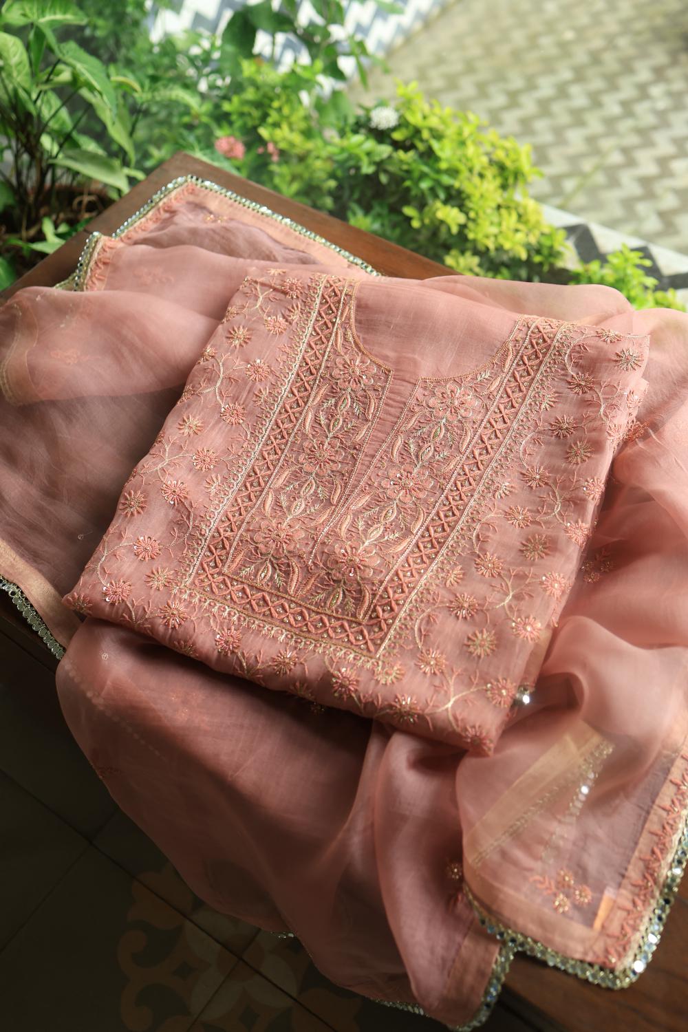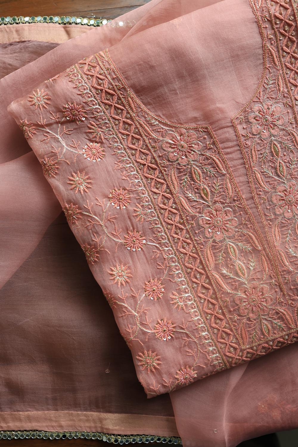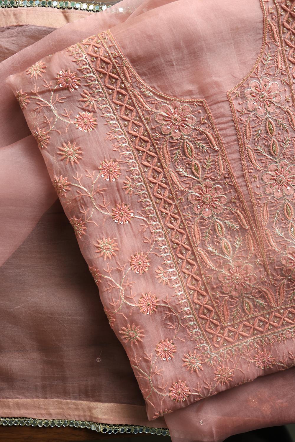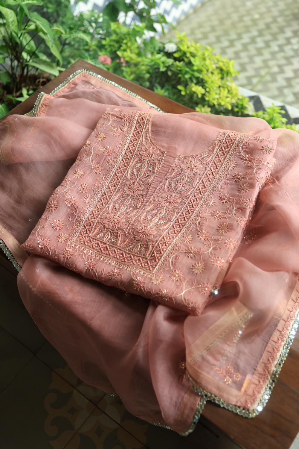 Pastel Peach Noor Organza Silk Chikankari Unstitched Kurta Dupatta Set