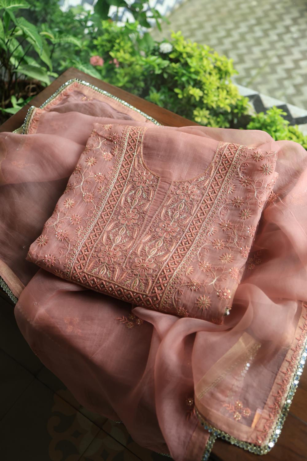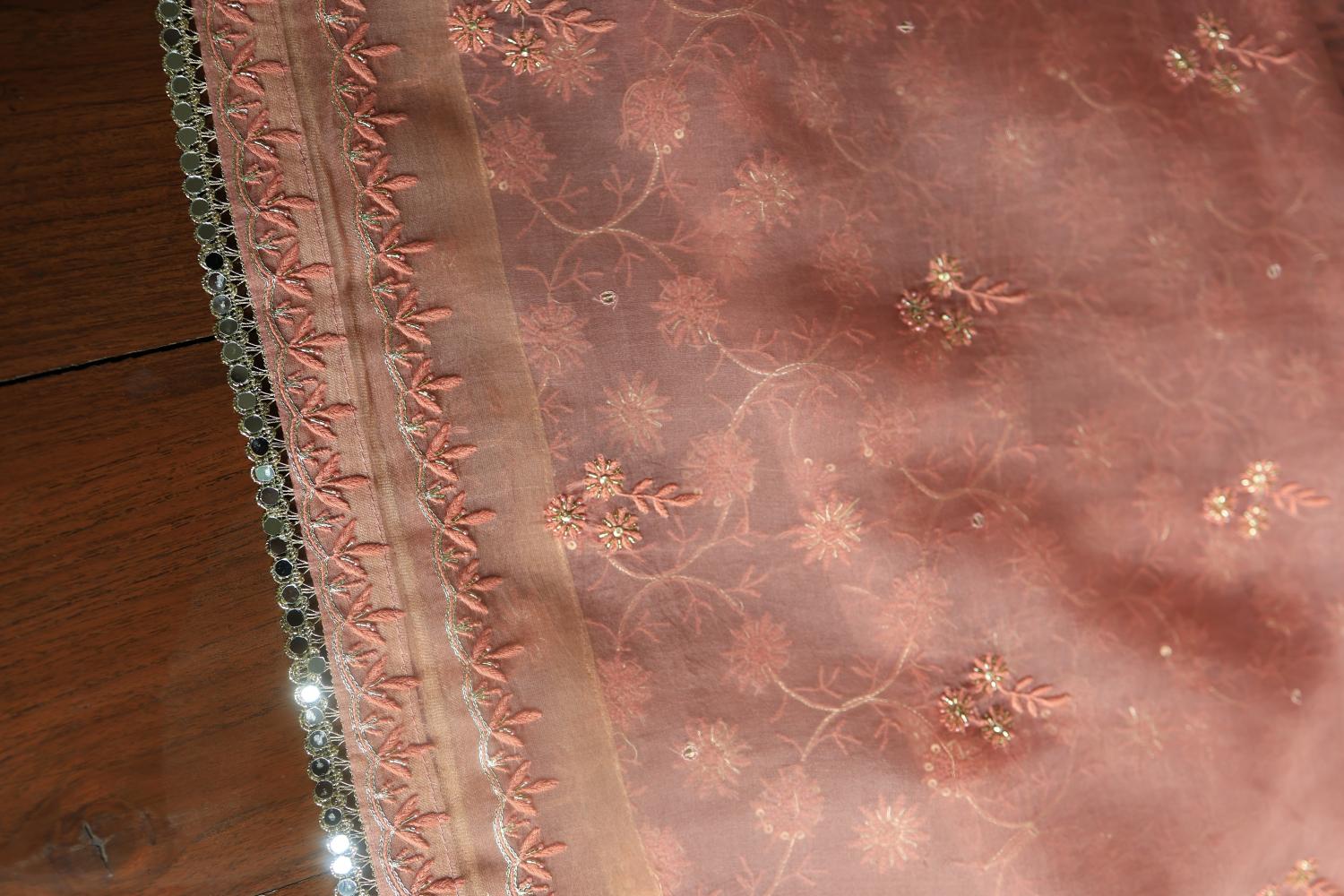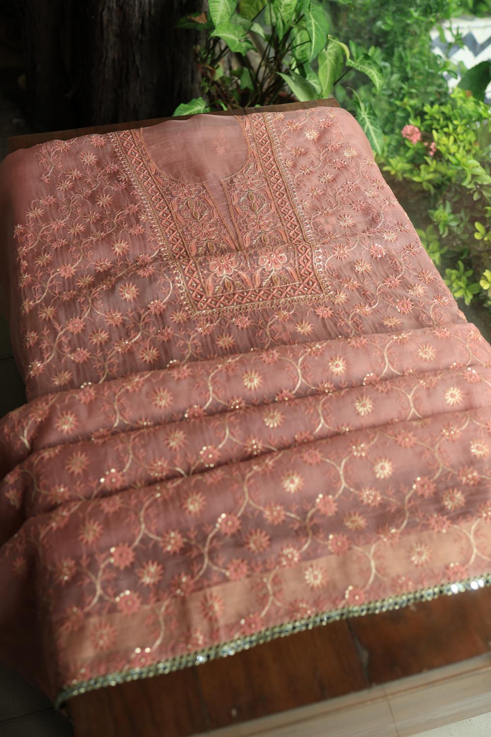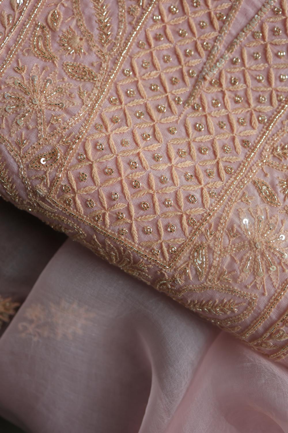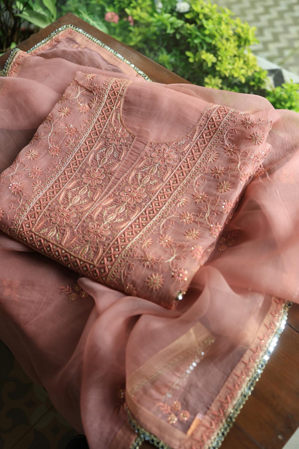 Pastel Peach Noor Organza Silk Chikankari Unstitched Kurta Dupatta Set