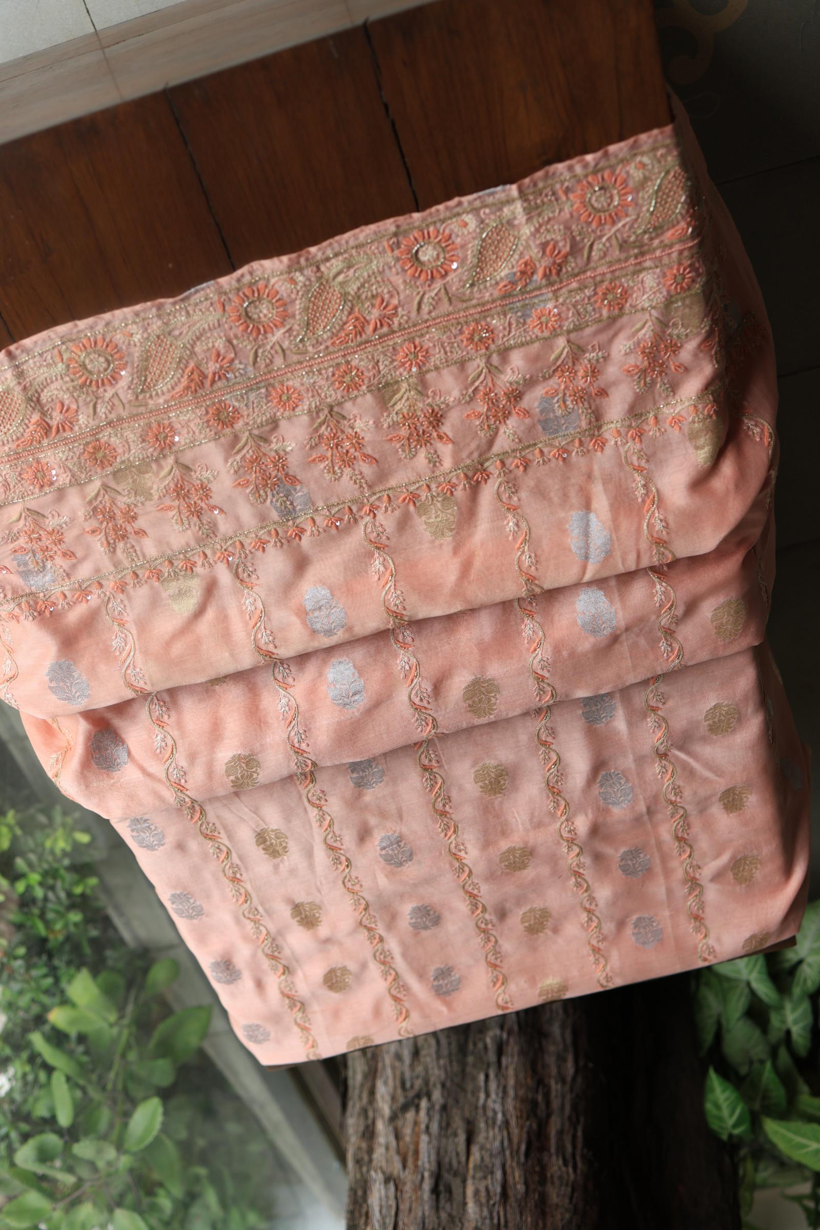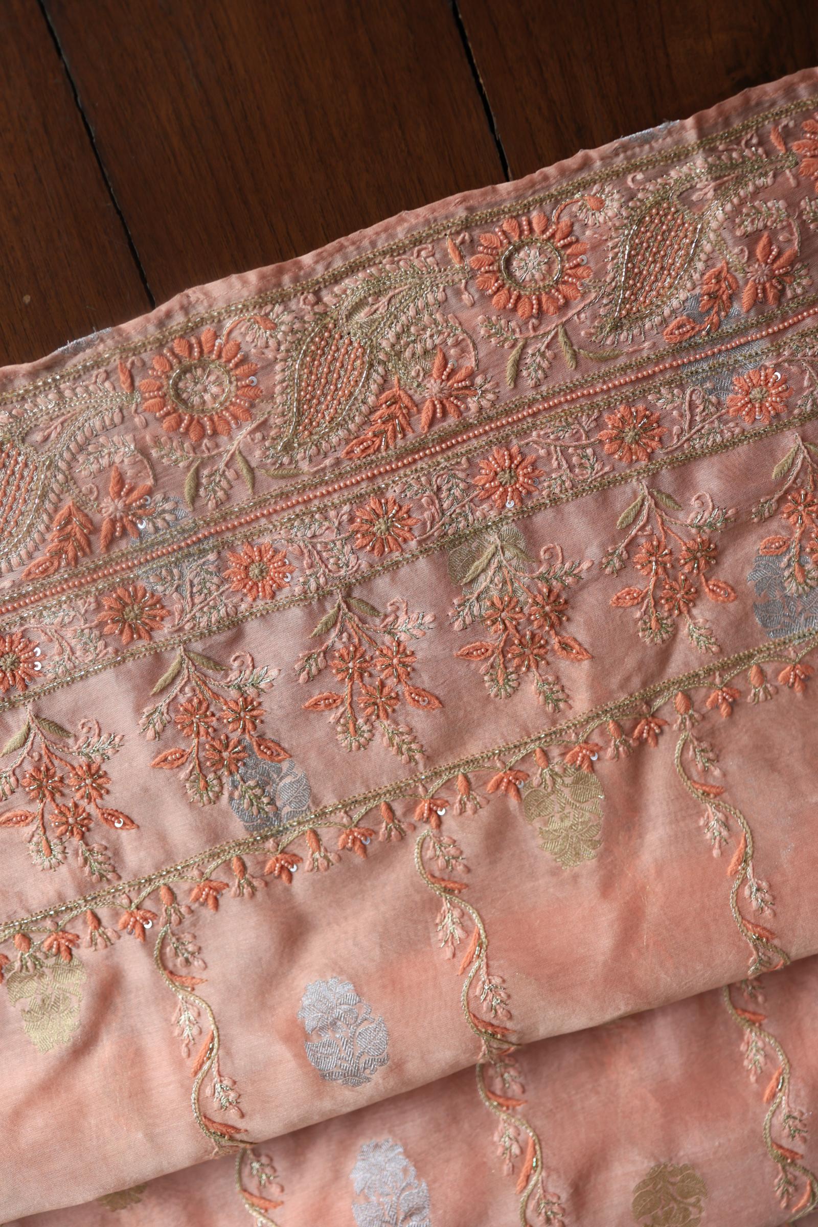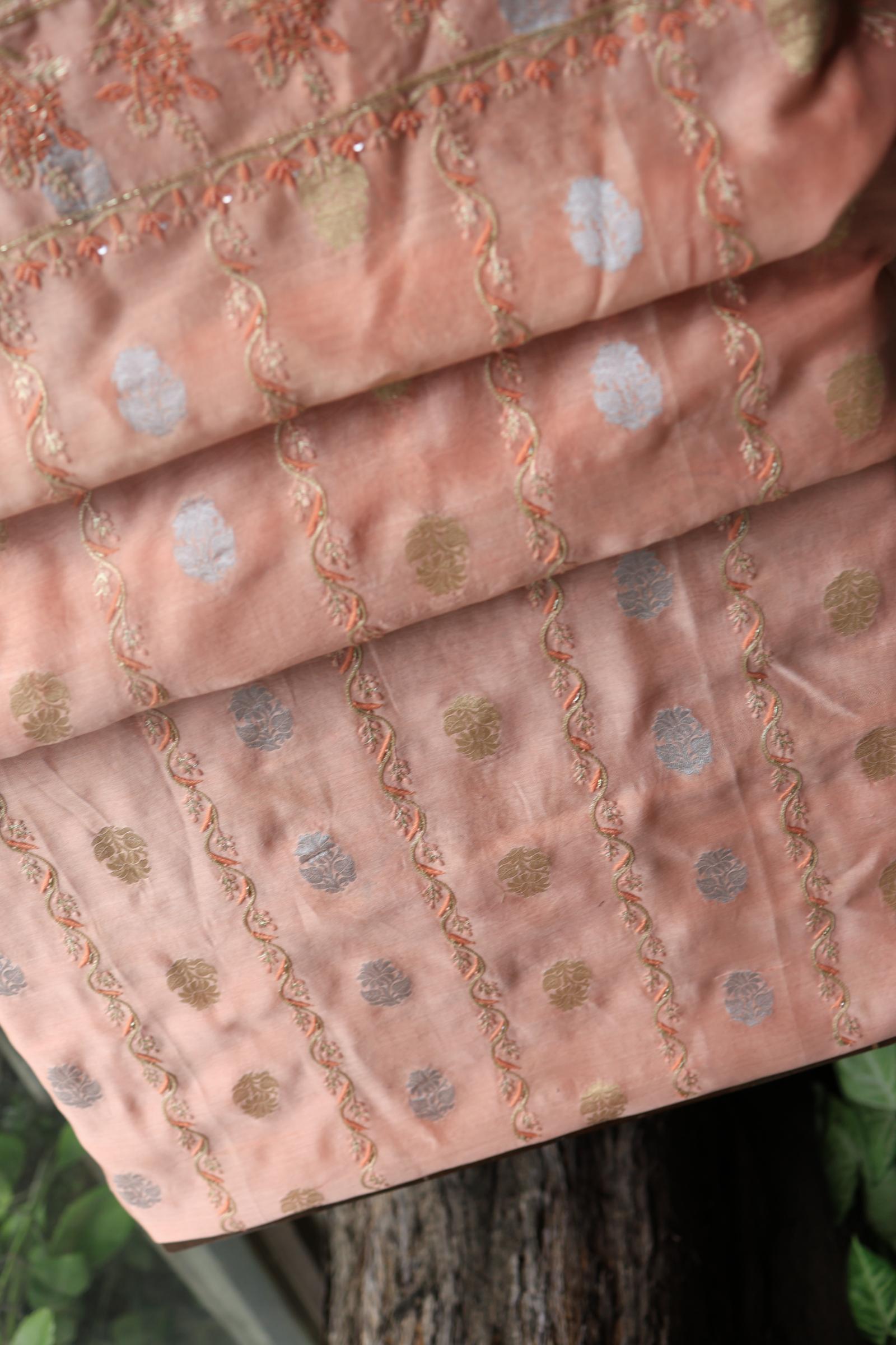 Peach Banarasi Zari Chanderi Unstitched Chikankari Fabric