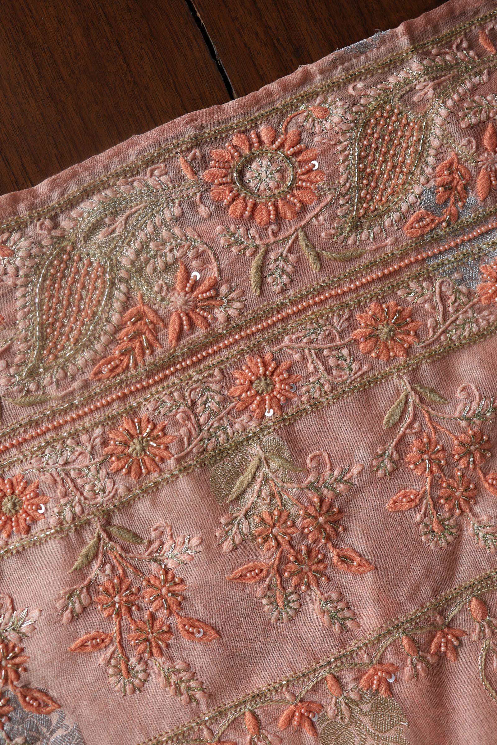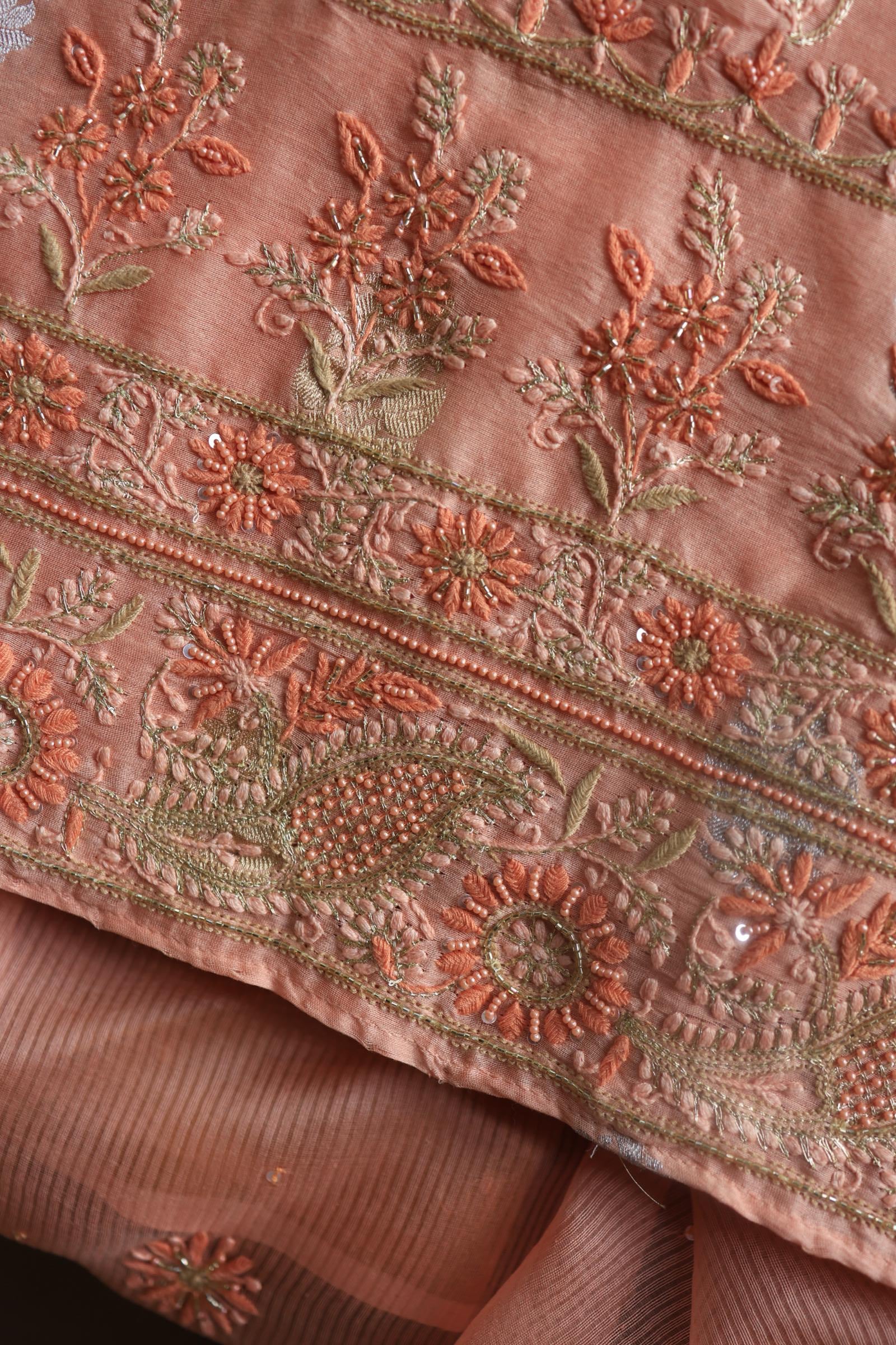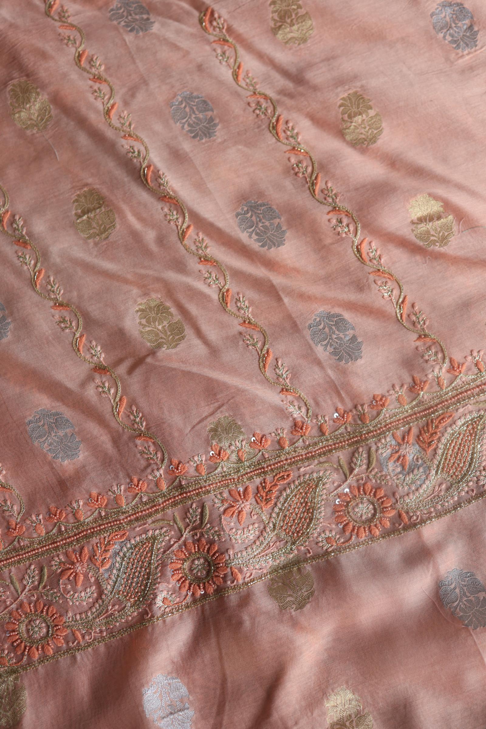 Peach Banarasi Zari Chanderi Unstitched Chikankari Fabric