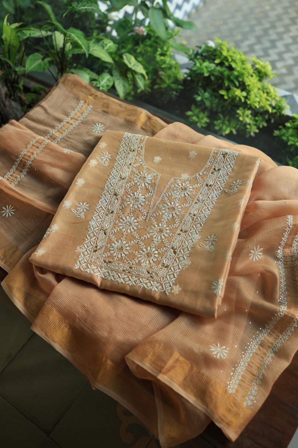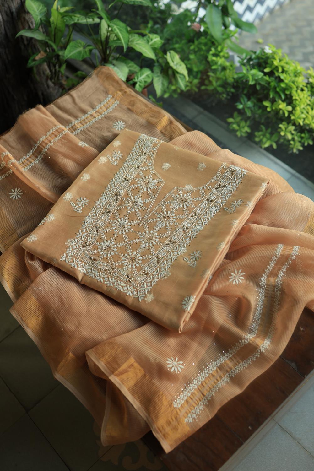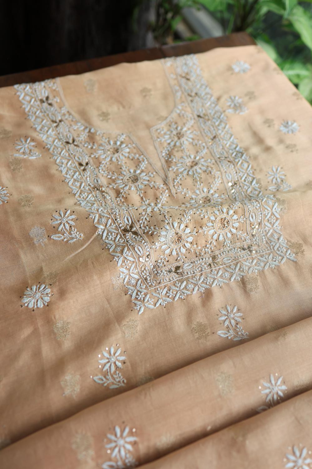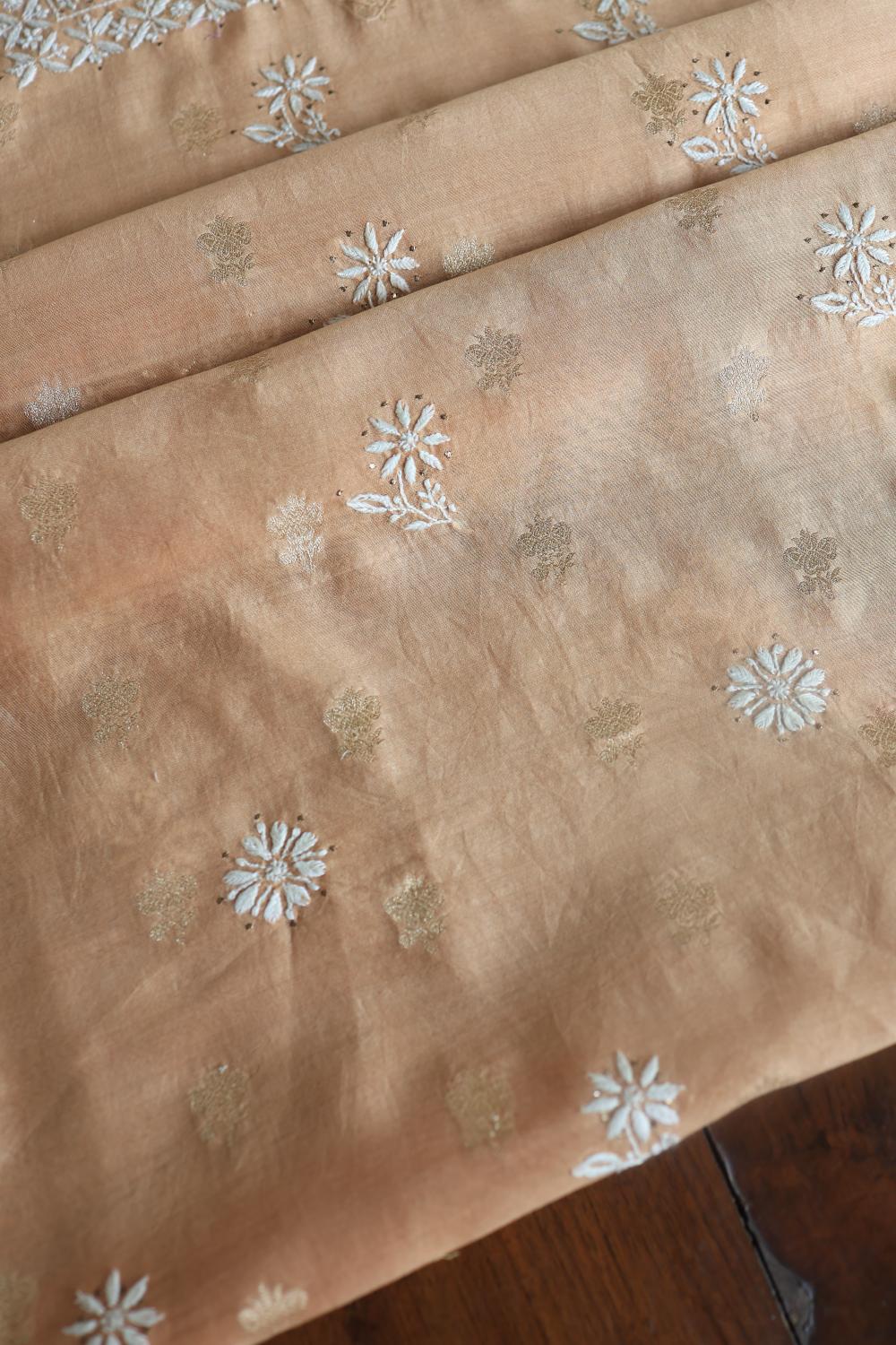 Peach Mal Cotton Fine Chikankari With Kamdani Work Unstitched Fabric