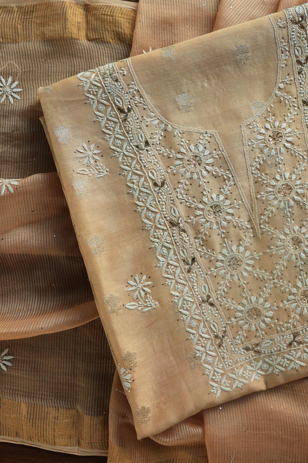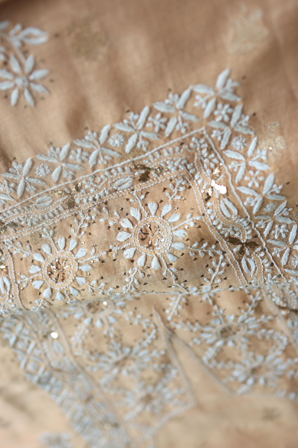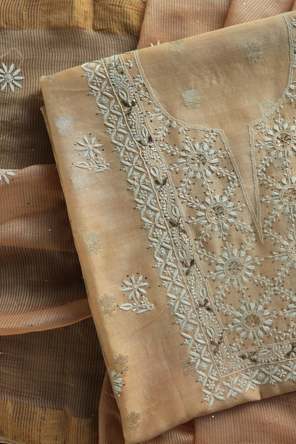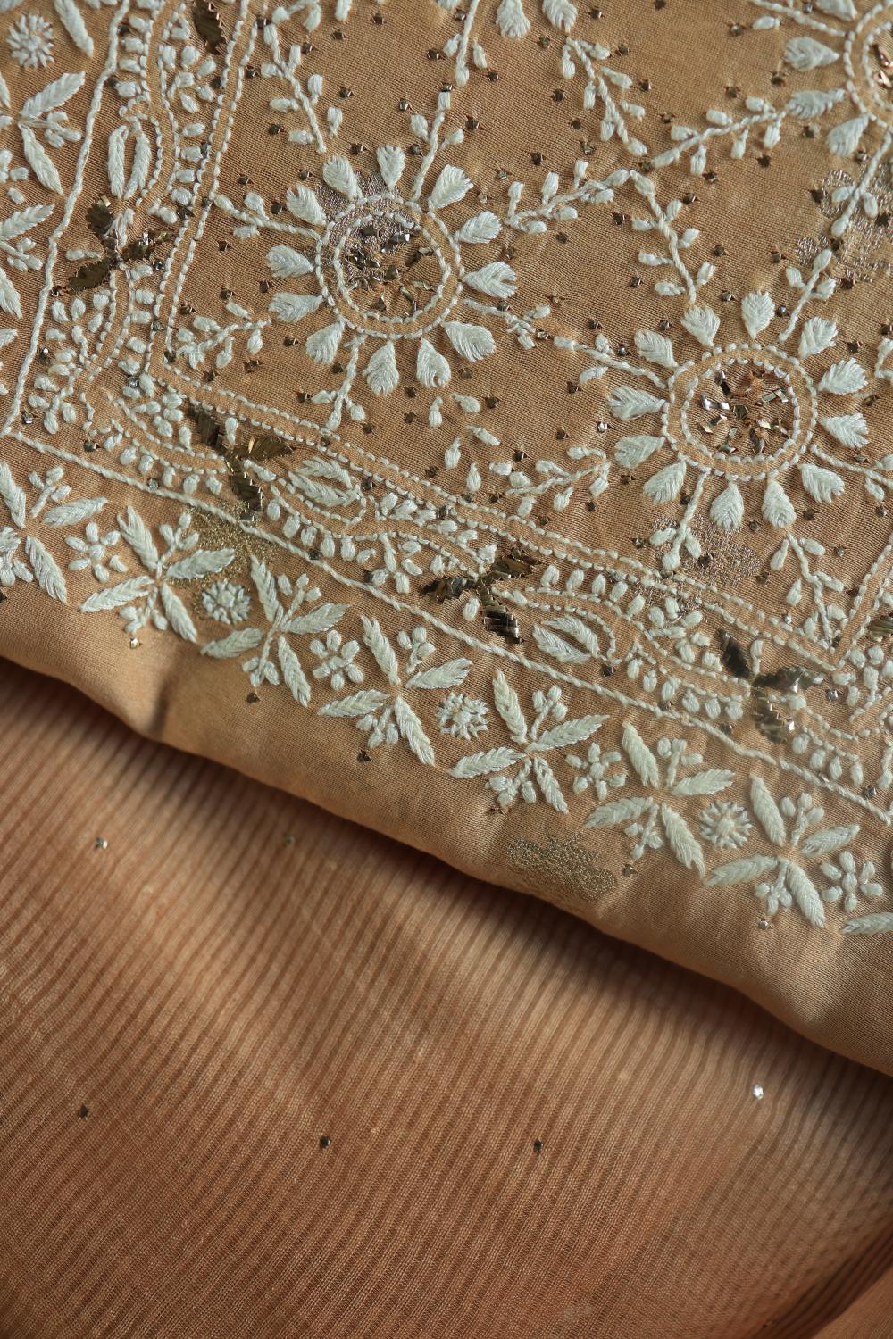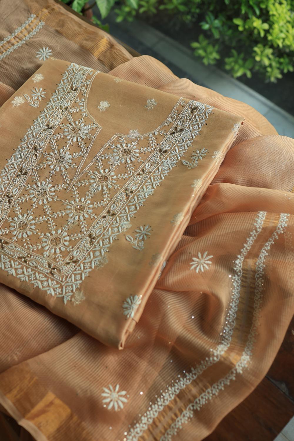 Peach Mal Cotton Fine Chikankari With Kamdani Work Unstitched Fabric