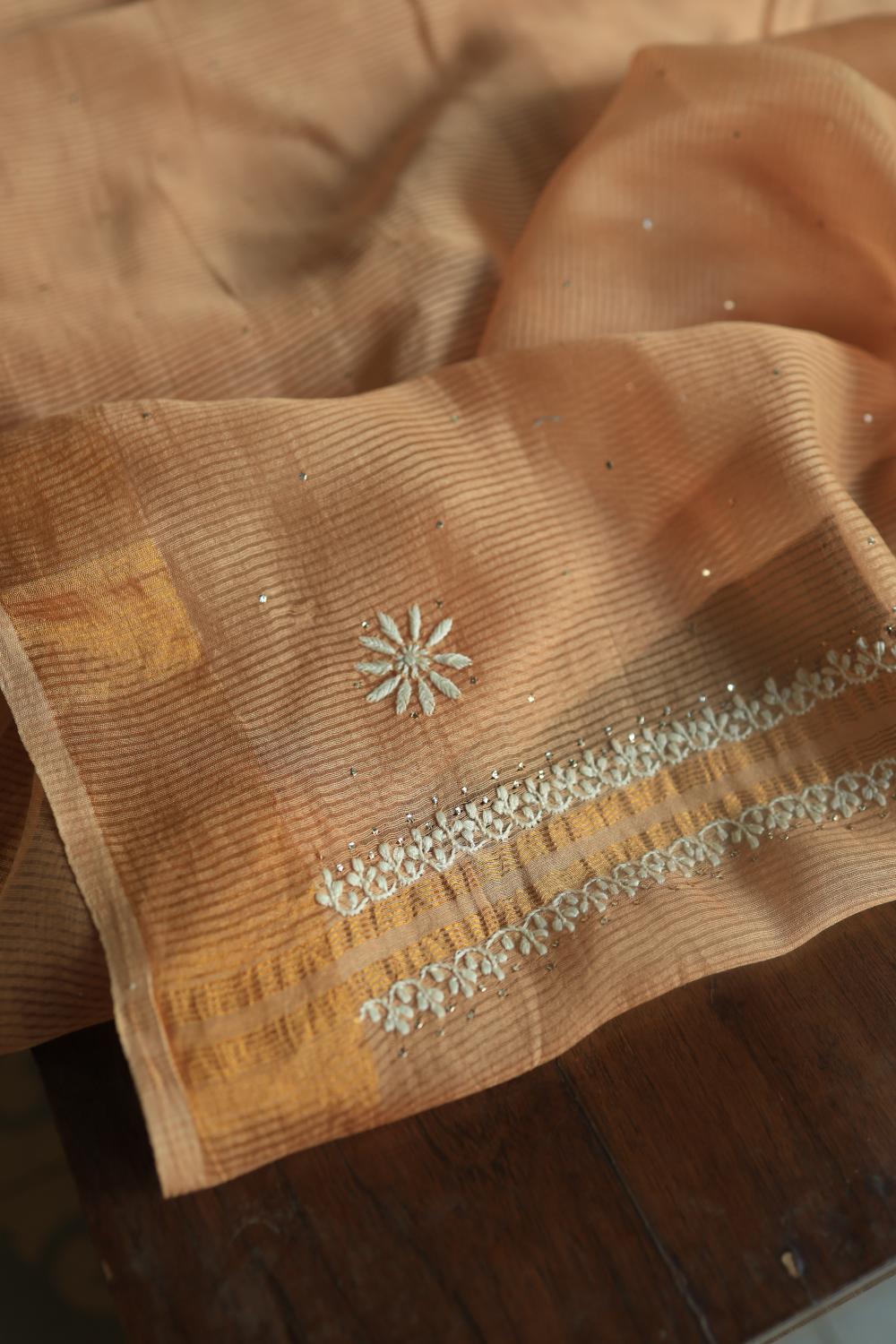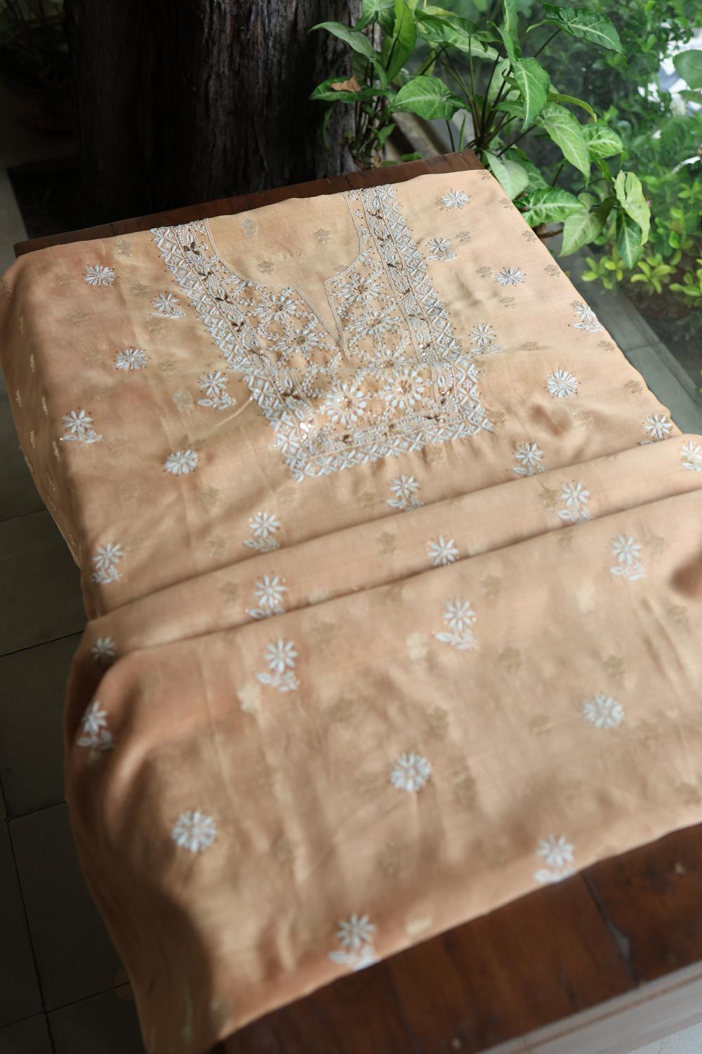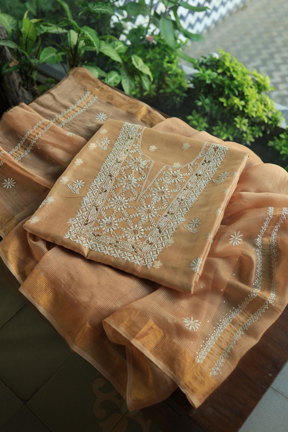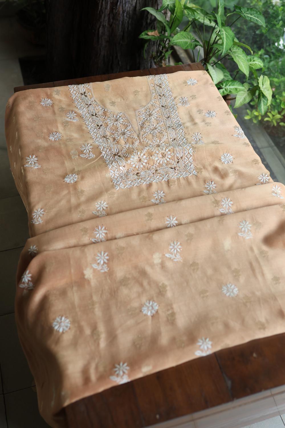 Peach Mal Cotton Fine Chikankari With Kamdani Work Unstitched Fabric