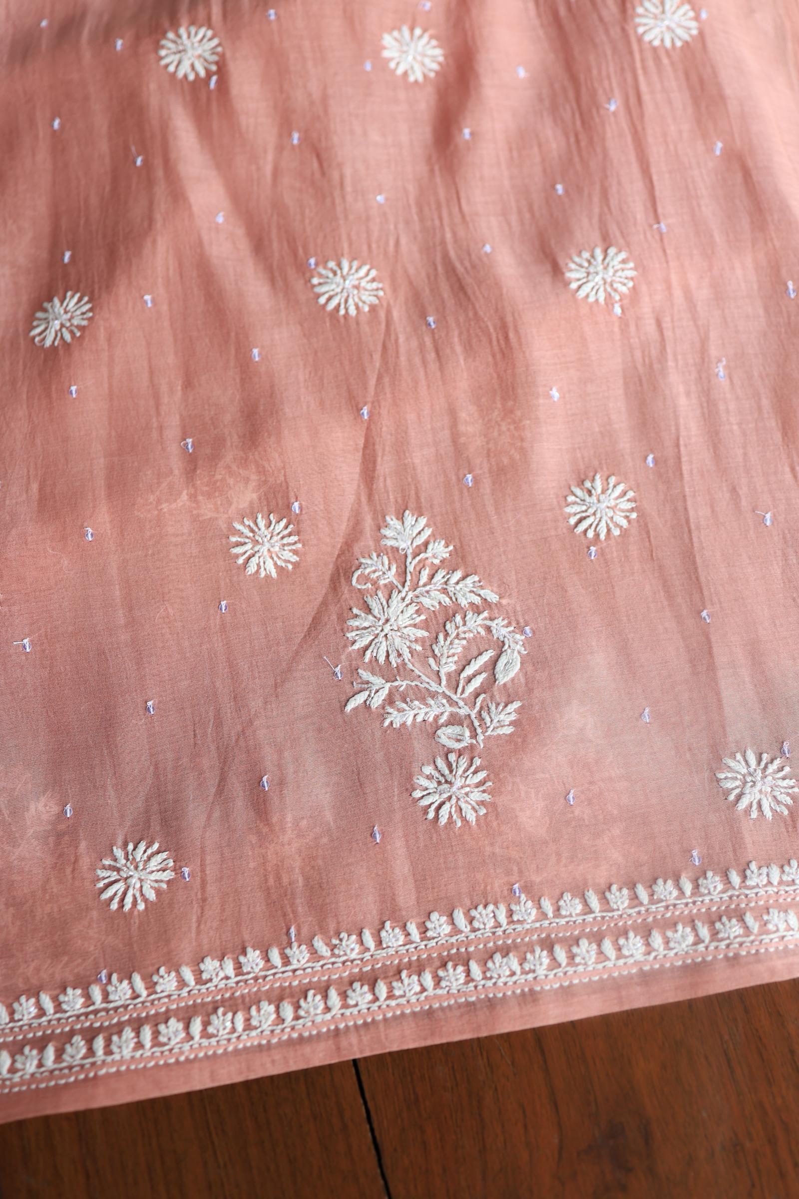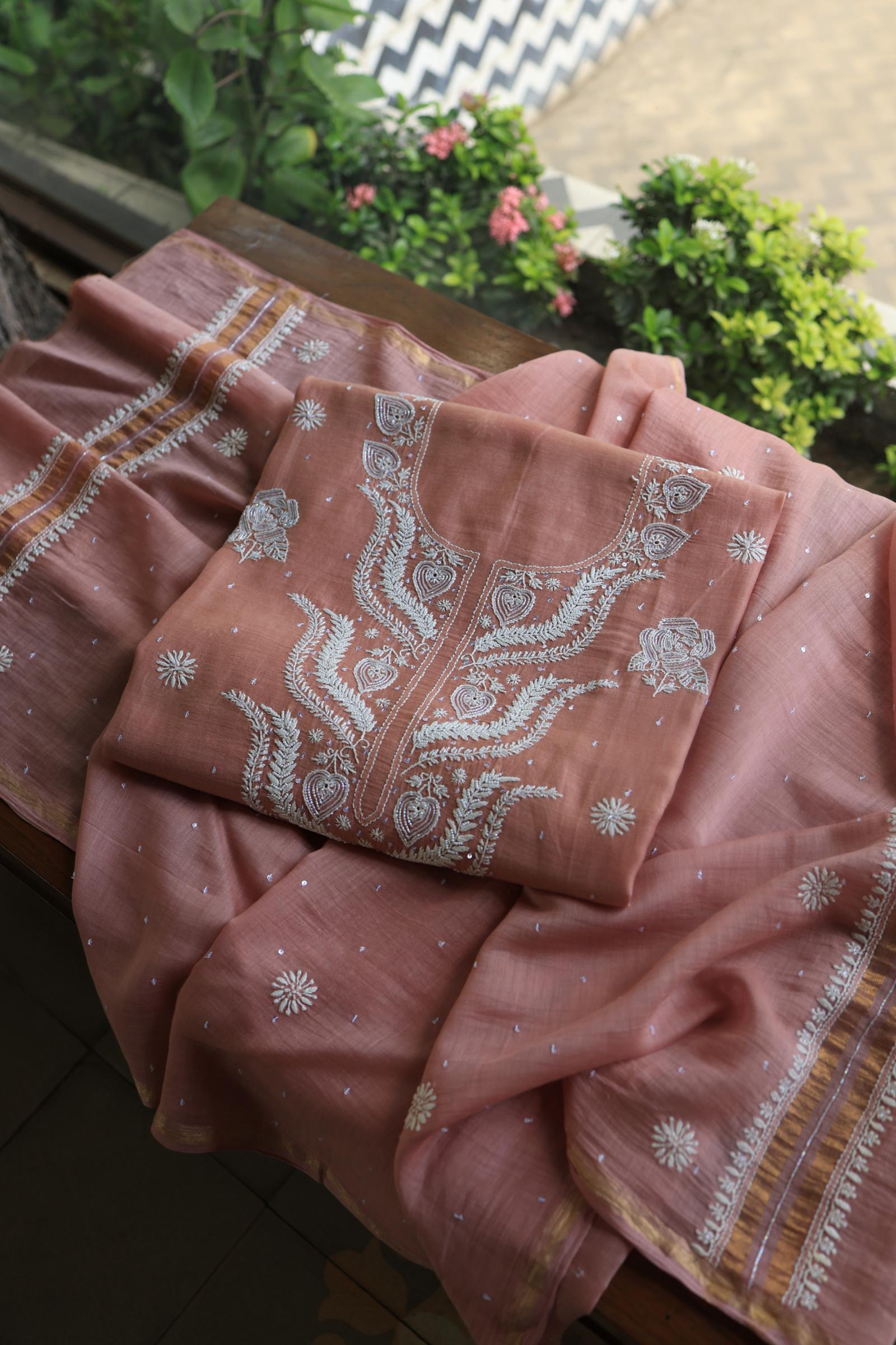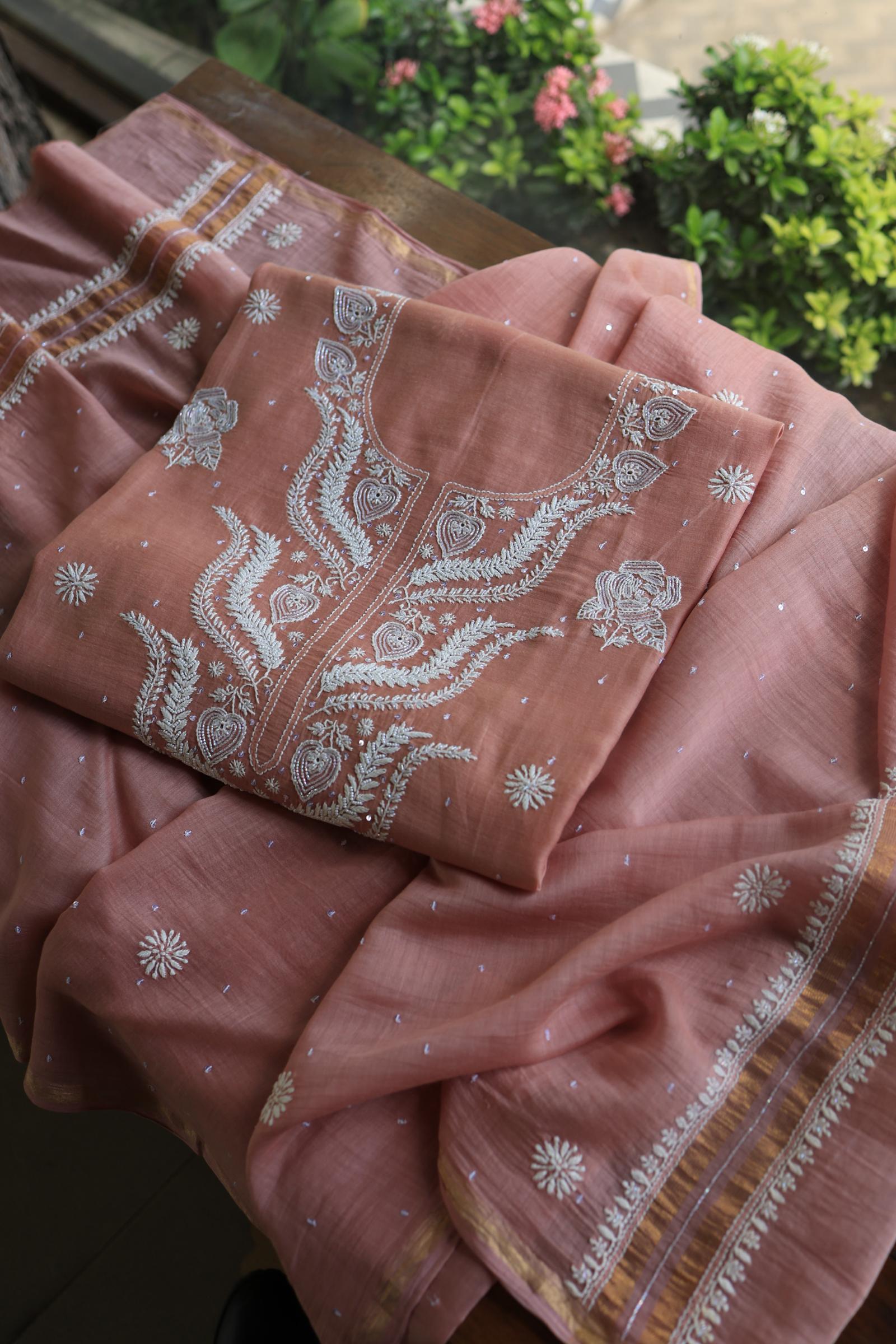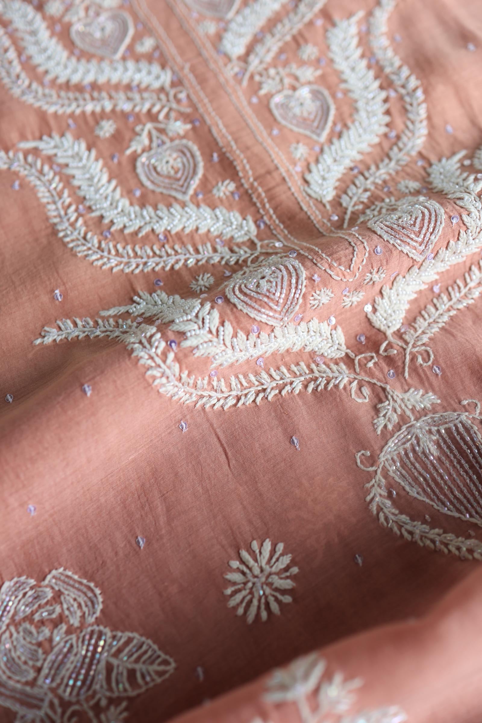 Soft malmal kurta done with neat Chikankari along with pearl and sequins work clubbed with mal chanderi dupatta finished.