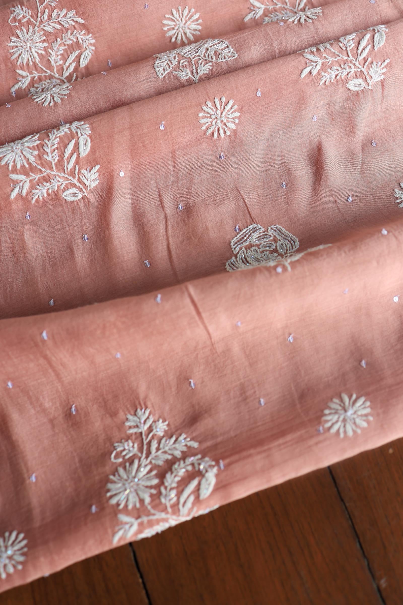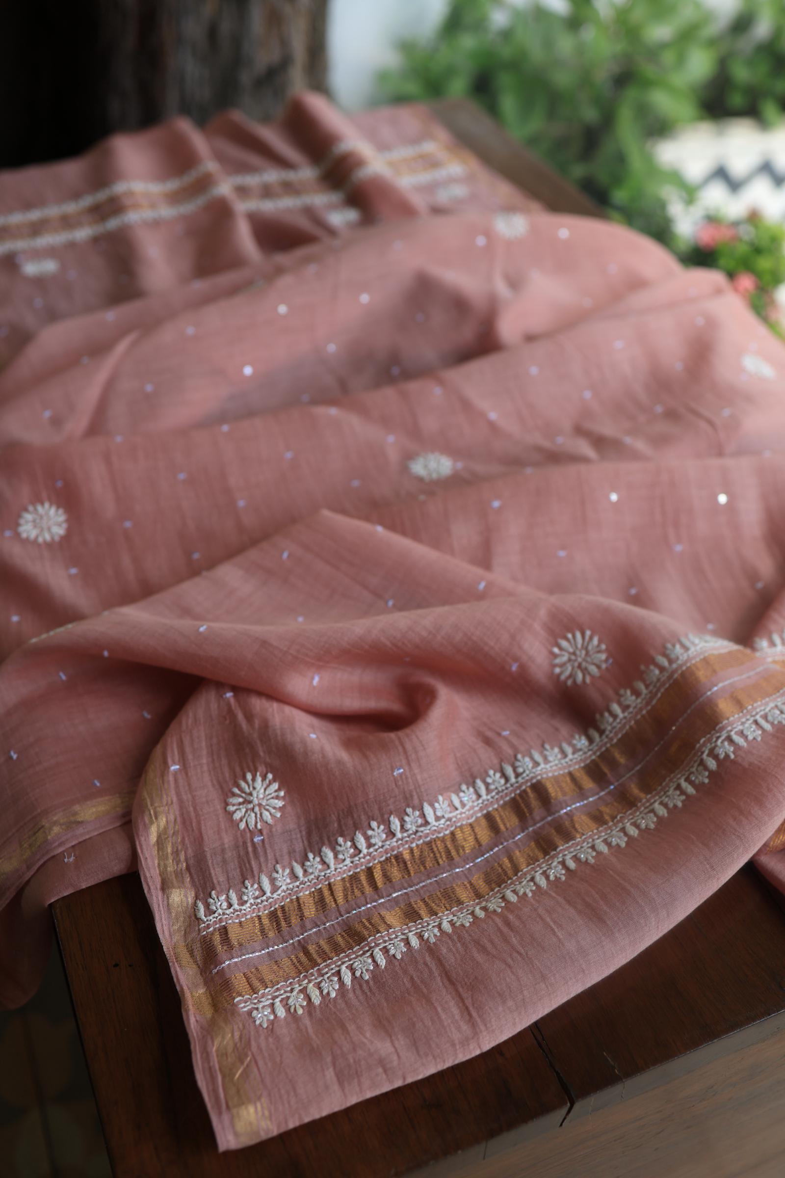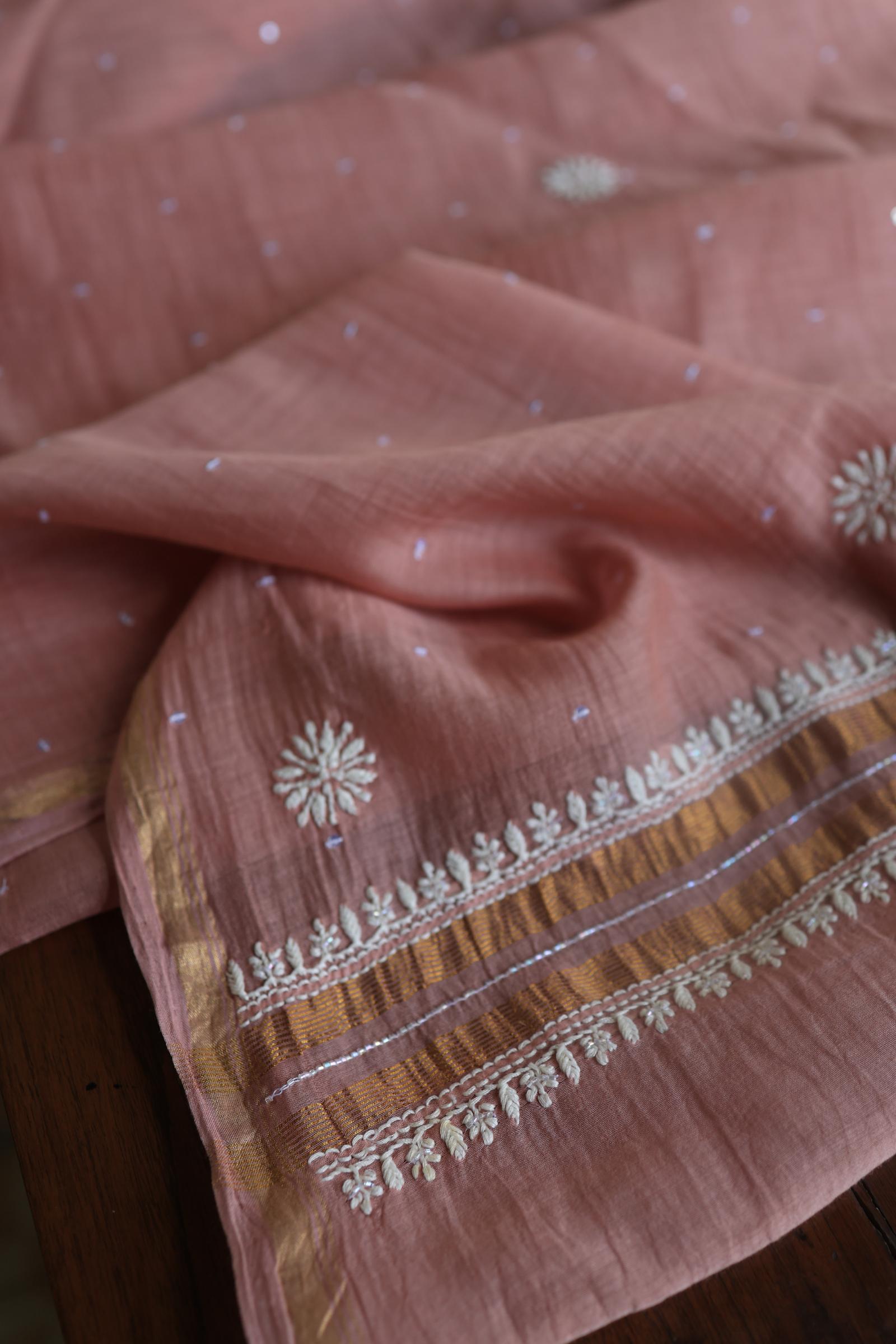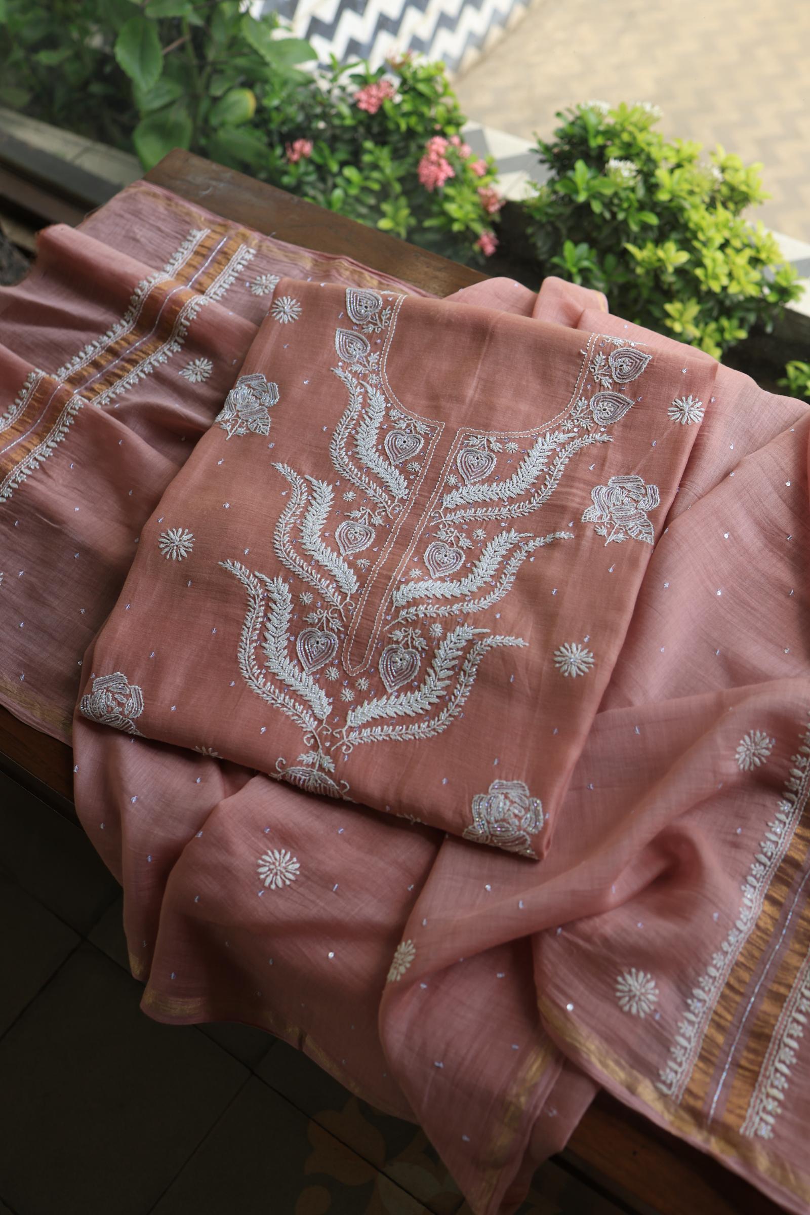 Soft malmal kurta done with neat Chikankari along with pearl and sequins work clubbed with mal chanderi dupatta finished.