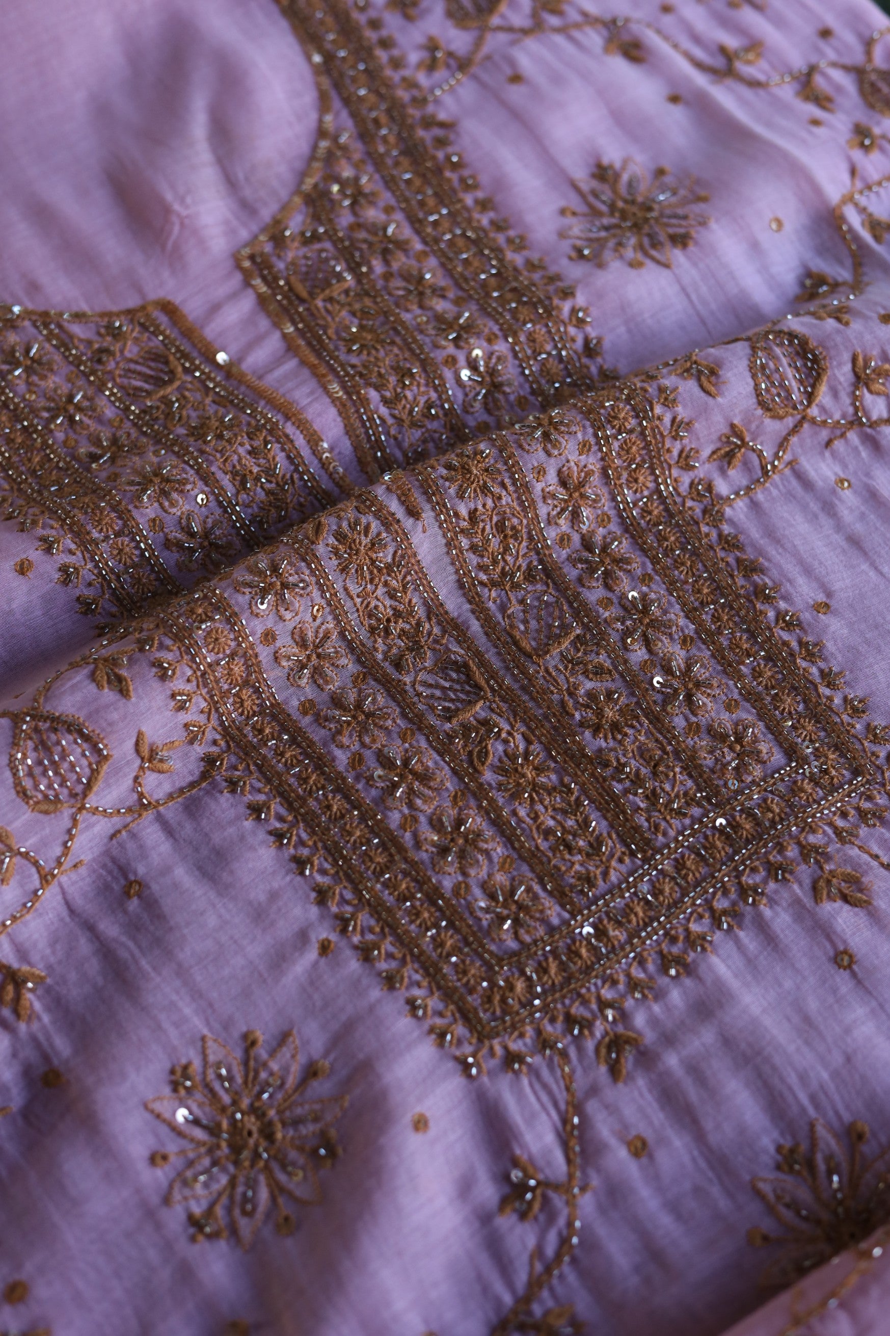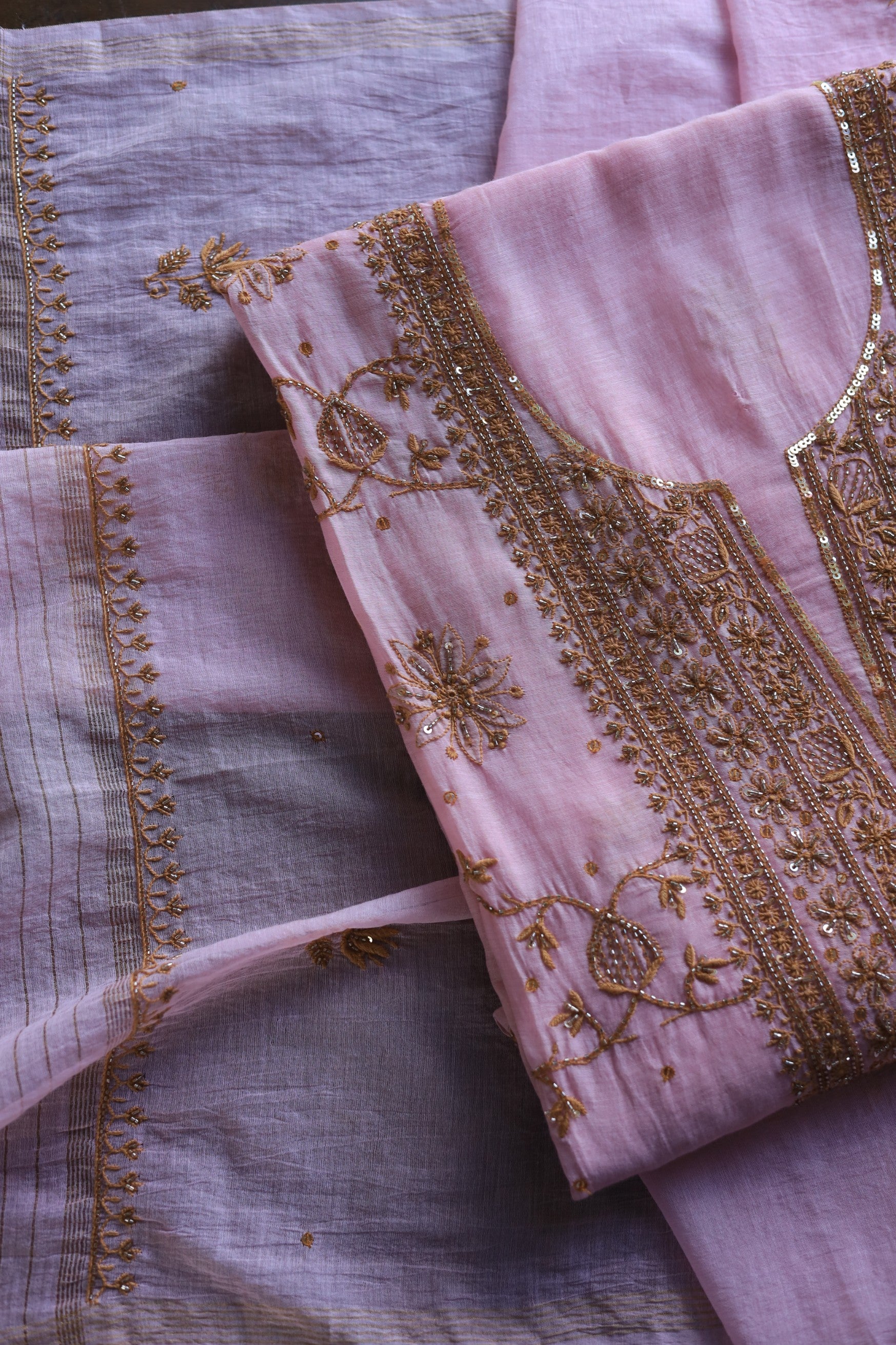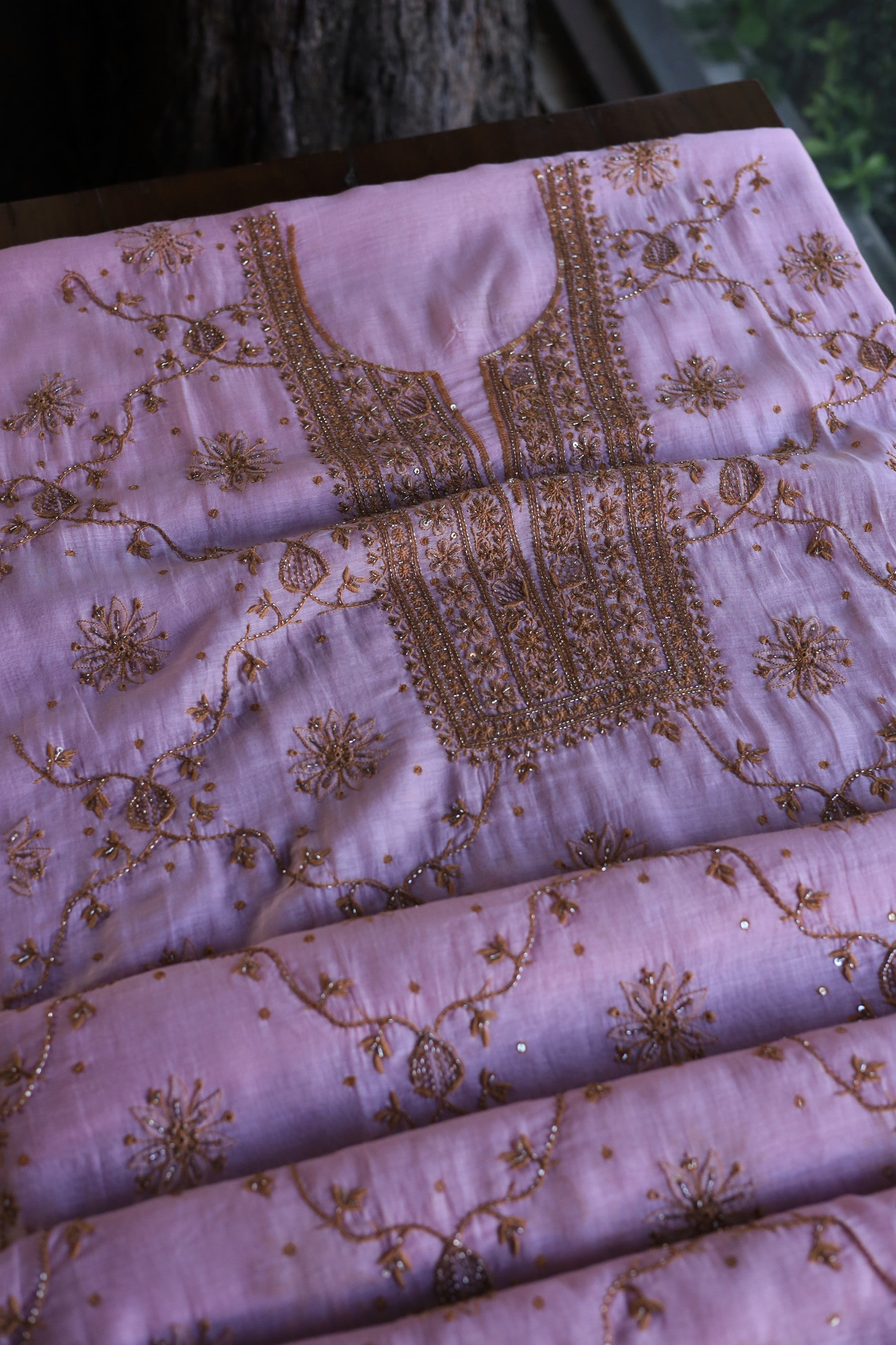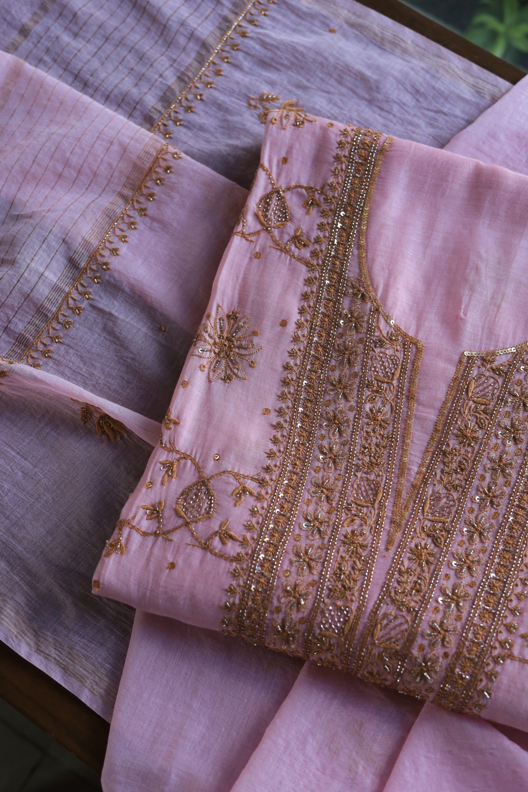 Pink & Mustard Mal Chanderi Silk Chikankari Unstitched Fabric
