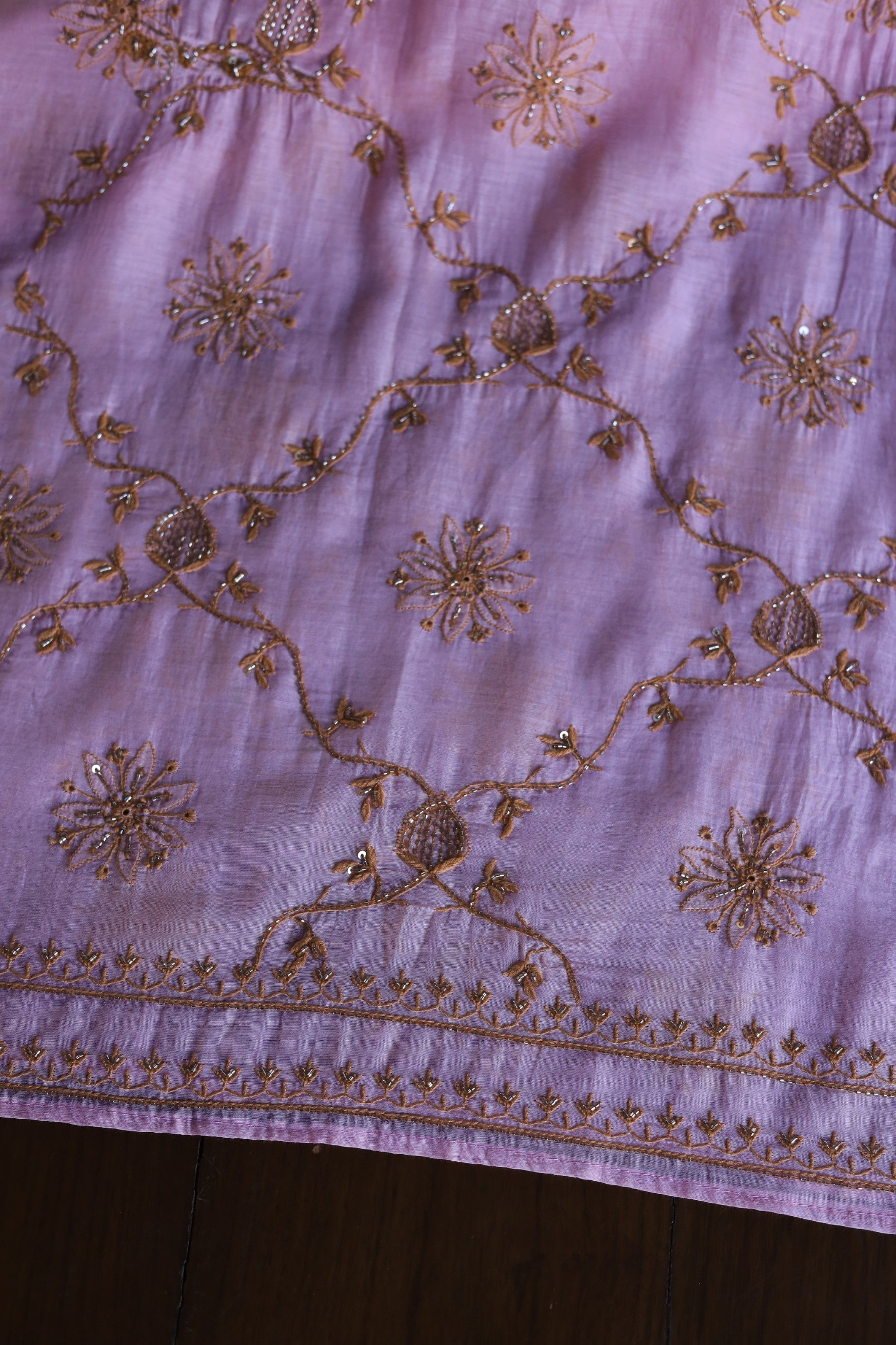 Soft malmal kurta done with neat Chikankari along with pearl and sequins work clubbed with mal chanderi dupatta finished.