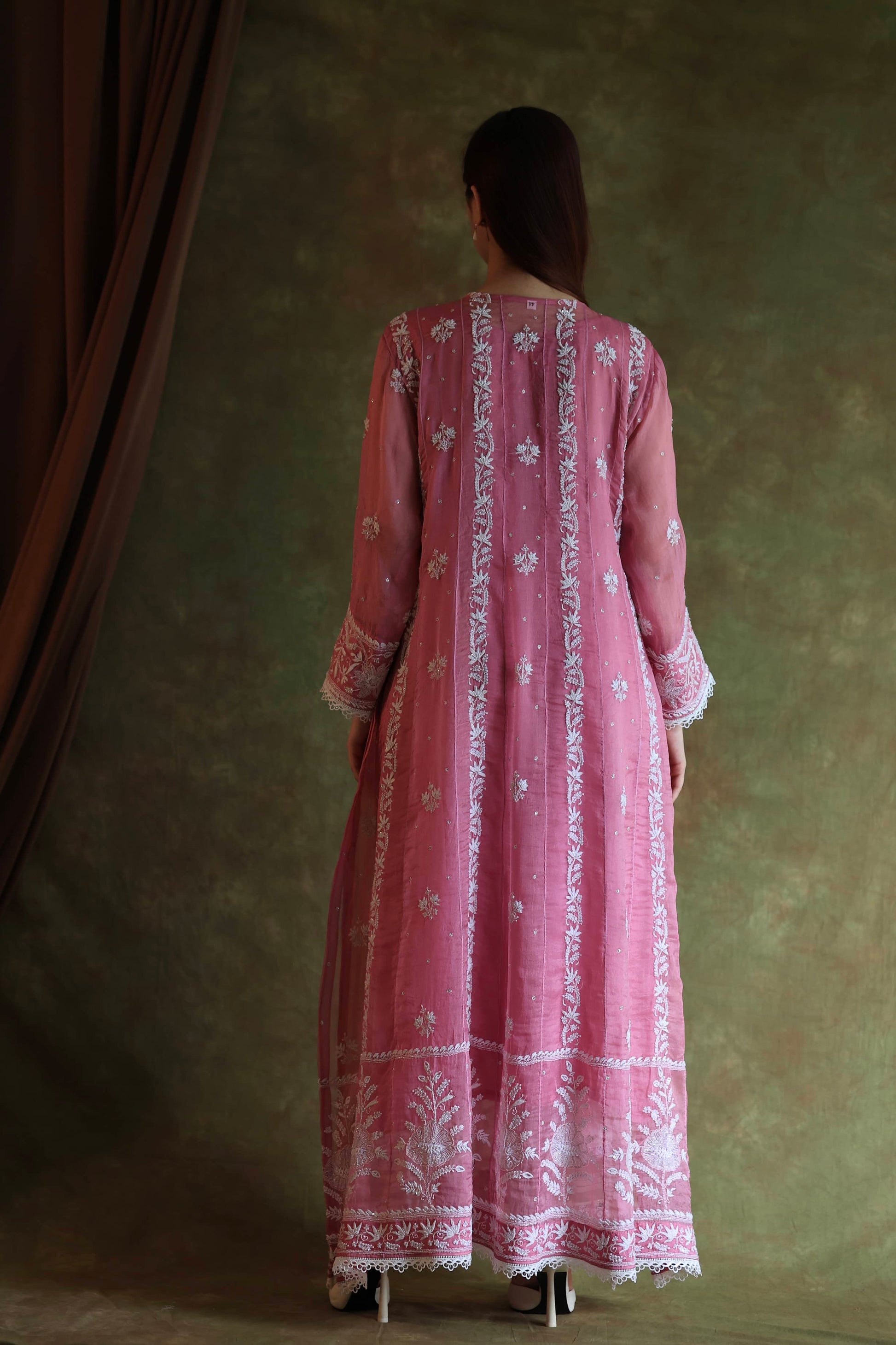 Pink Noor Organza Chikankari Anarkali Kurta With Dupatta
