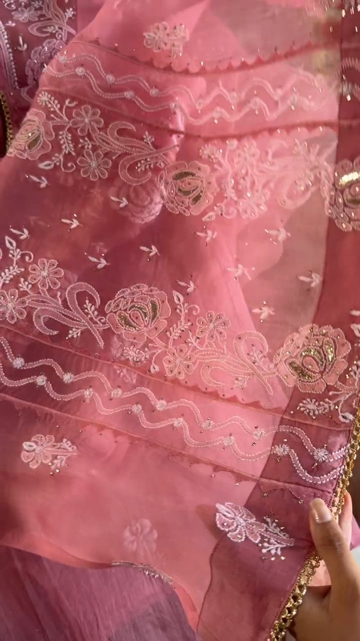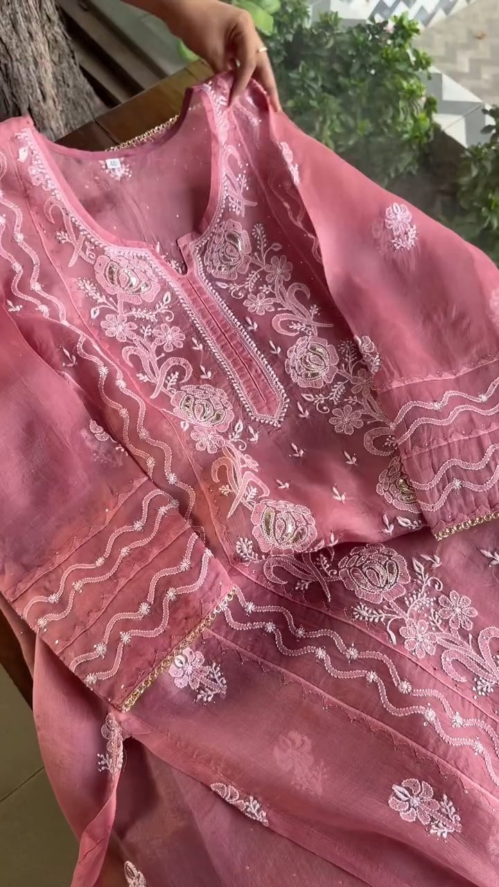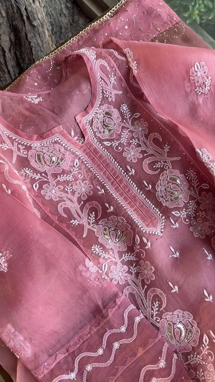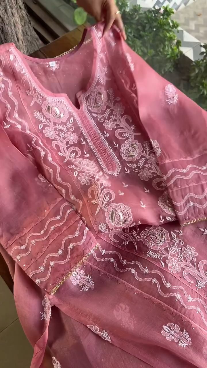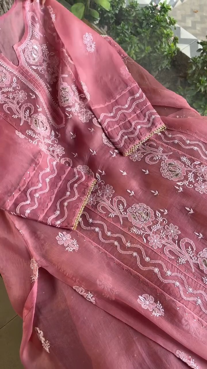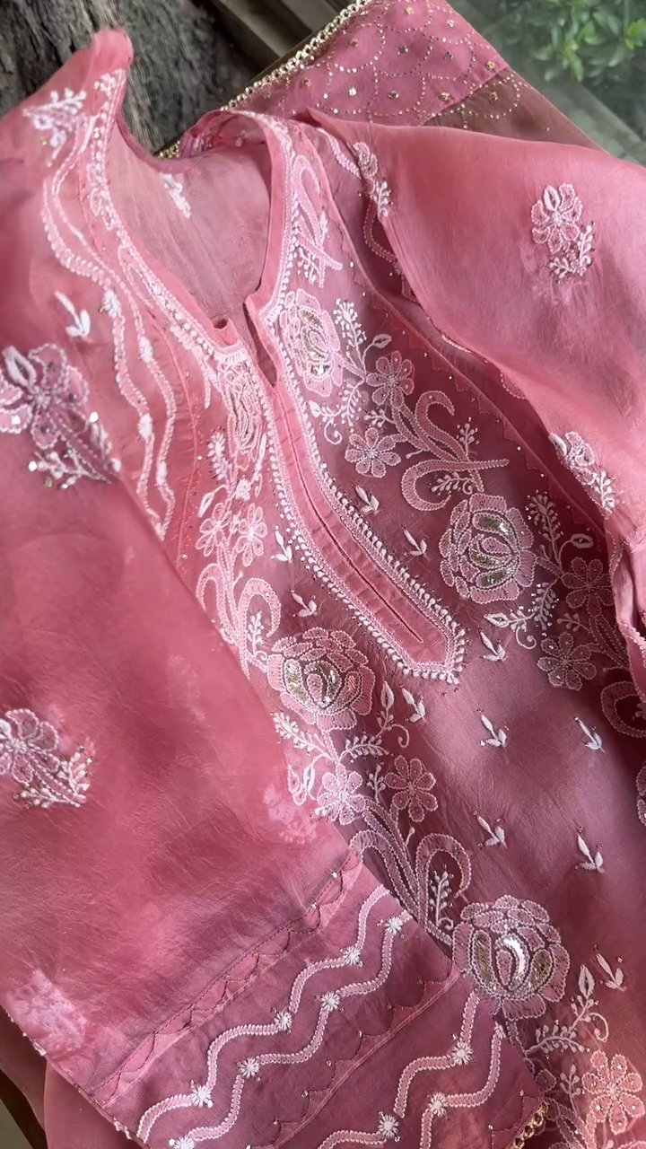 Pink Noor Organza Rose Motifs Applique Chikankari Mukaish Kurta Dupatta Set