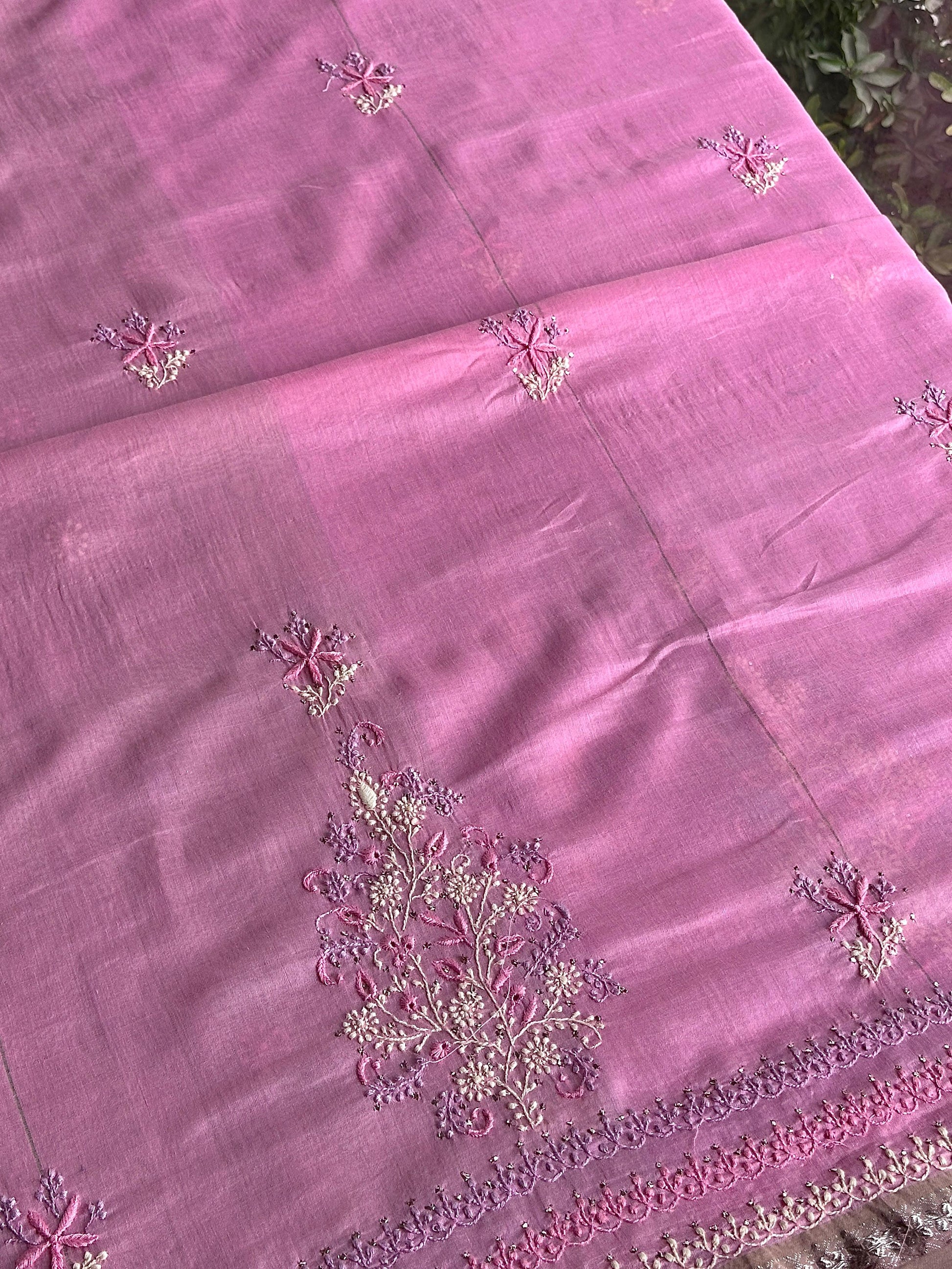 This pink Chanderi saree is all about subtle elegance and timeless charm. The saree is beautifully adorned with hand chikankari embroidery, featuring soft floral patterns spread evenly across the fabric. The delicate white threadwork with light sequin touches adds just the right amount of grace without making it look heavy.