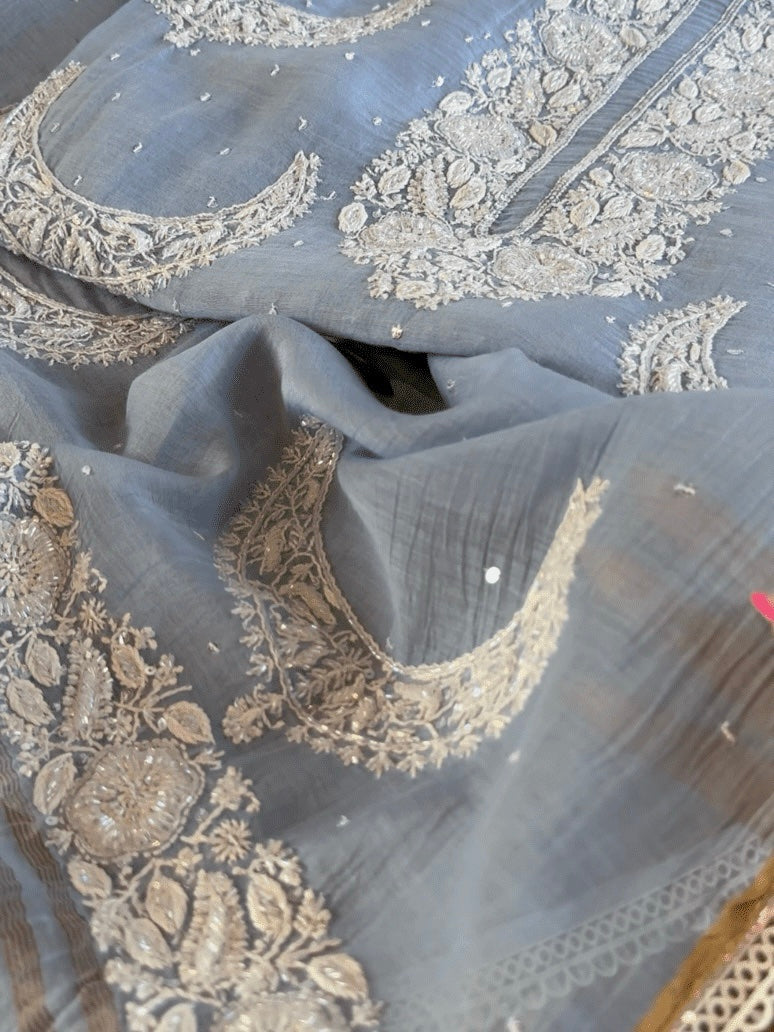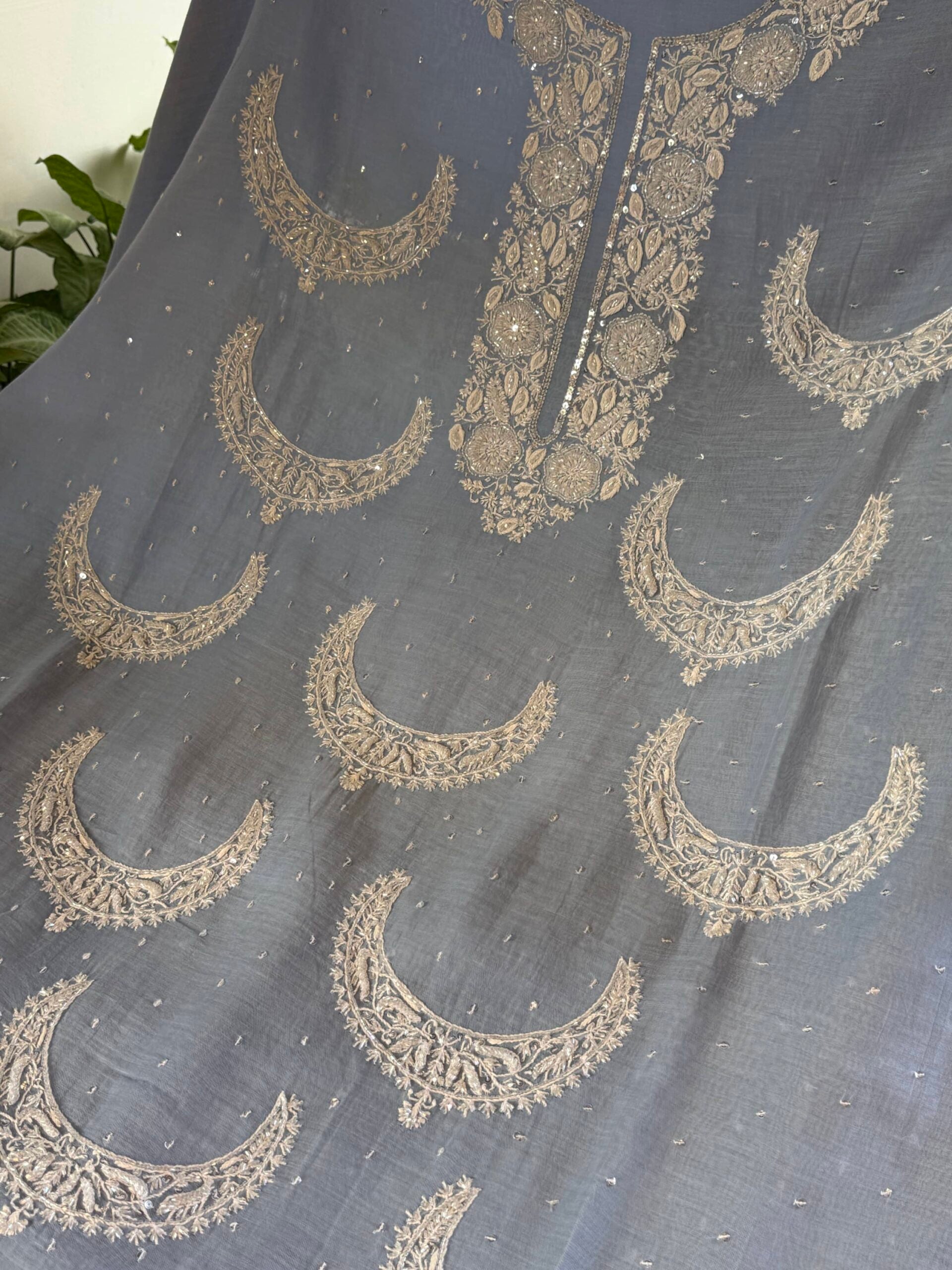 Chikankari on Crush chanderi silk fabric with crescent shaped motif filled with glass sequins for a twist of chikankari & traditional Awadhi crescent pattern on kurta and dupatta.