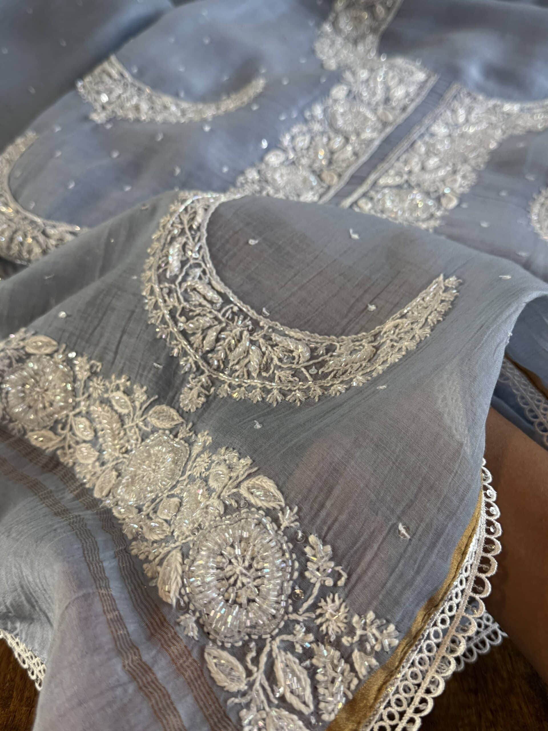 Each piece is crafted with intricate hand-embroidered Chikankari, featuring different traditional embellishments: