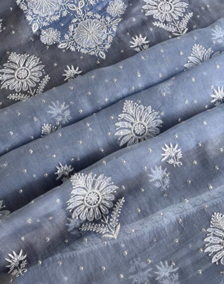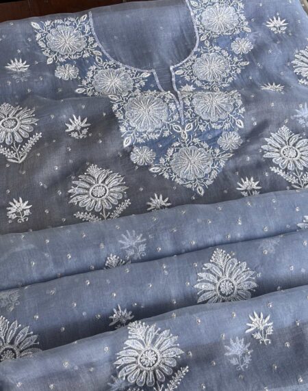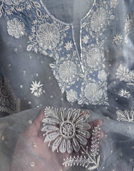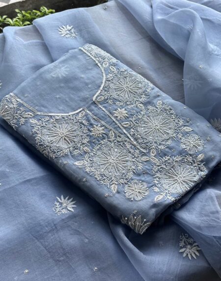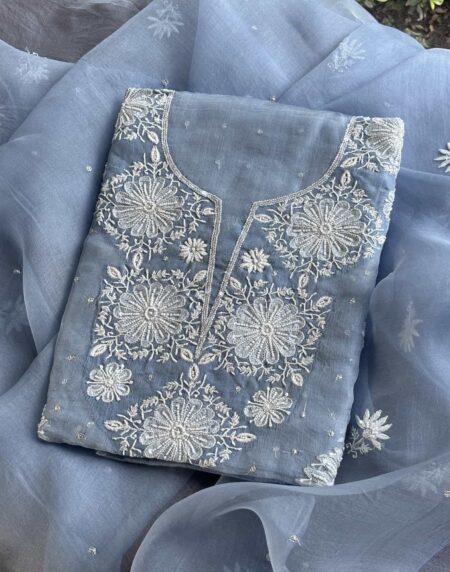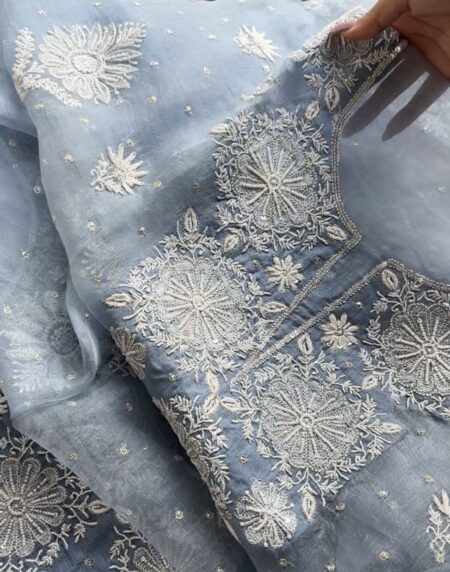 Powder Blue Noor Organza Silk Chikankari Unstitched Kurta Dupatta Set