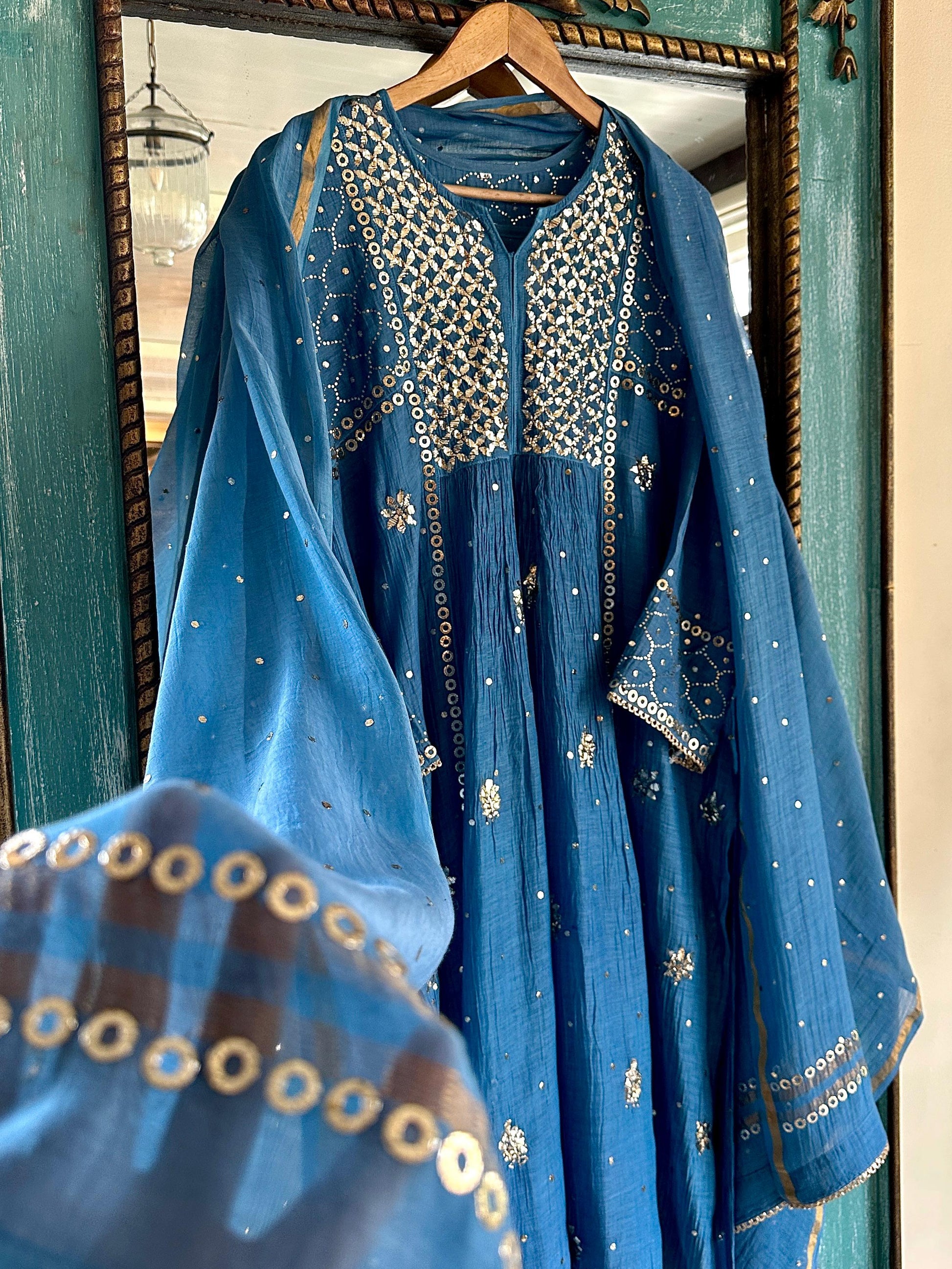 Our signature Pitta Mukaish work on this royal blue shade with heavy Mukaish detailing on the yoke in a tunic dress style. It comes with a matching silk chanderi dupatta adorned with ring Mukaish work.