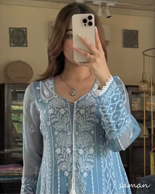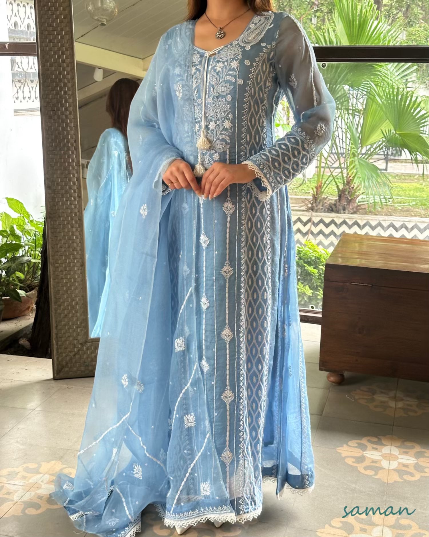 Powder Blue Shade Noor Organza Chikankari Anarkali With Dupatta