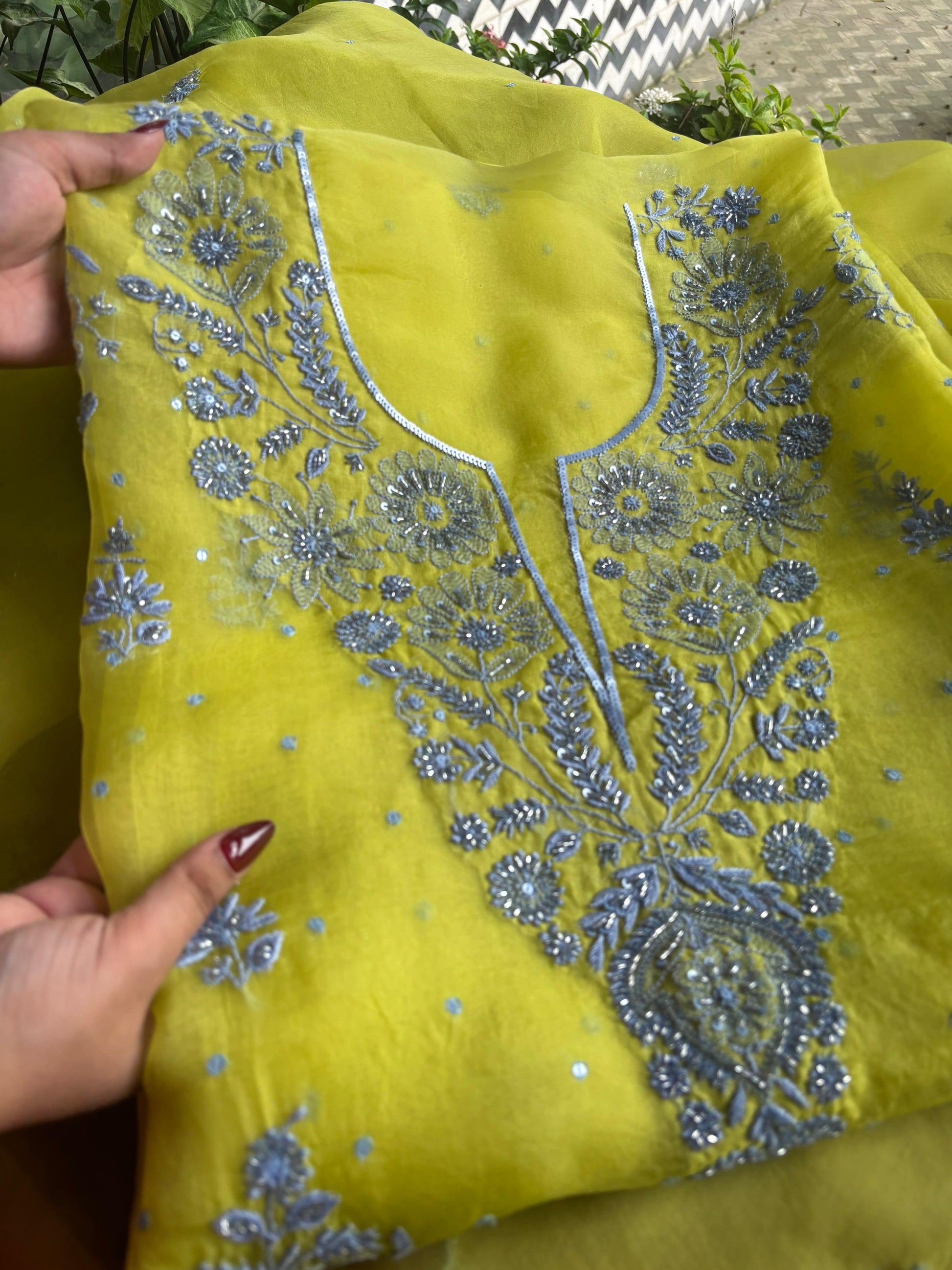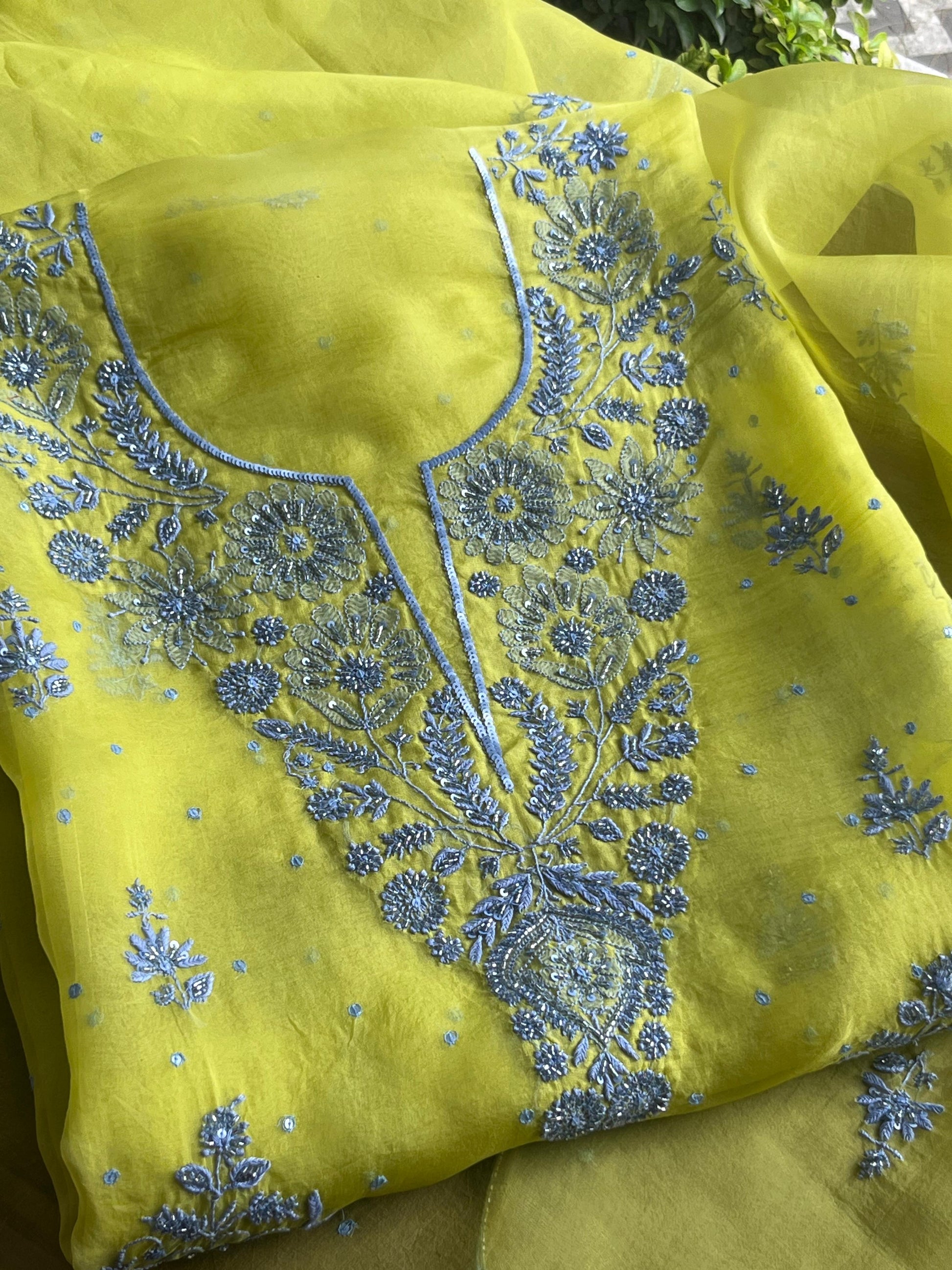 Lime Green & Grey Noor Organza Silk Chikankari Unstitched Fabric