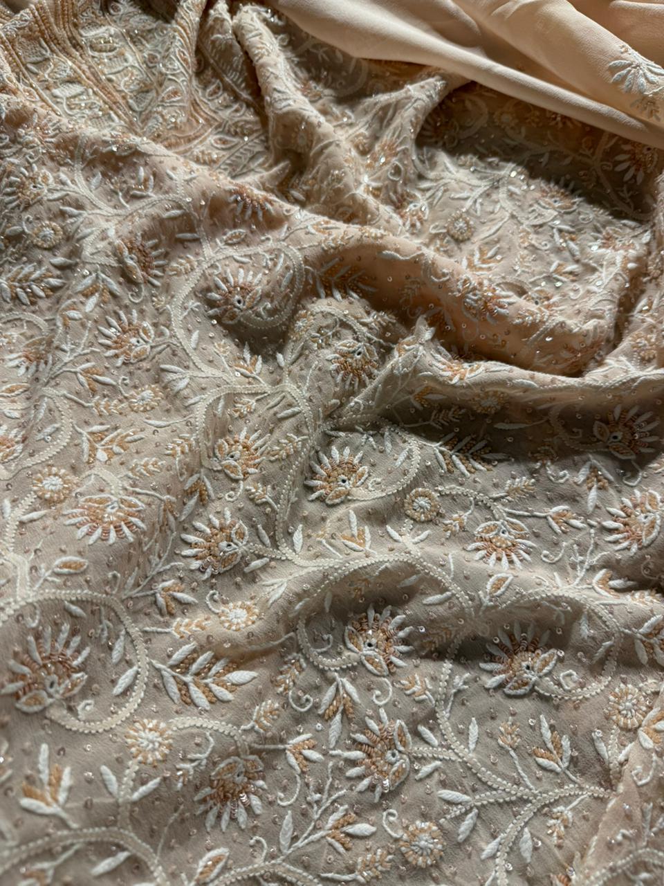 Our signature pure georgette assorted Chikankari kurta dupatta fabrics done with super fine embroidery with ari & sequins work, perfect for upcoming wedding season & people curating for their trousseau.