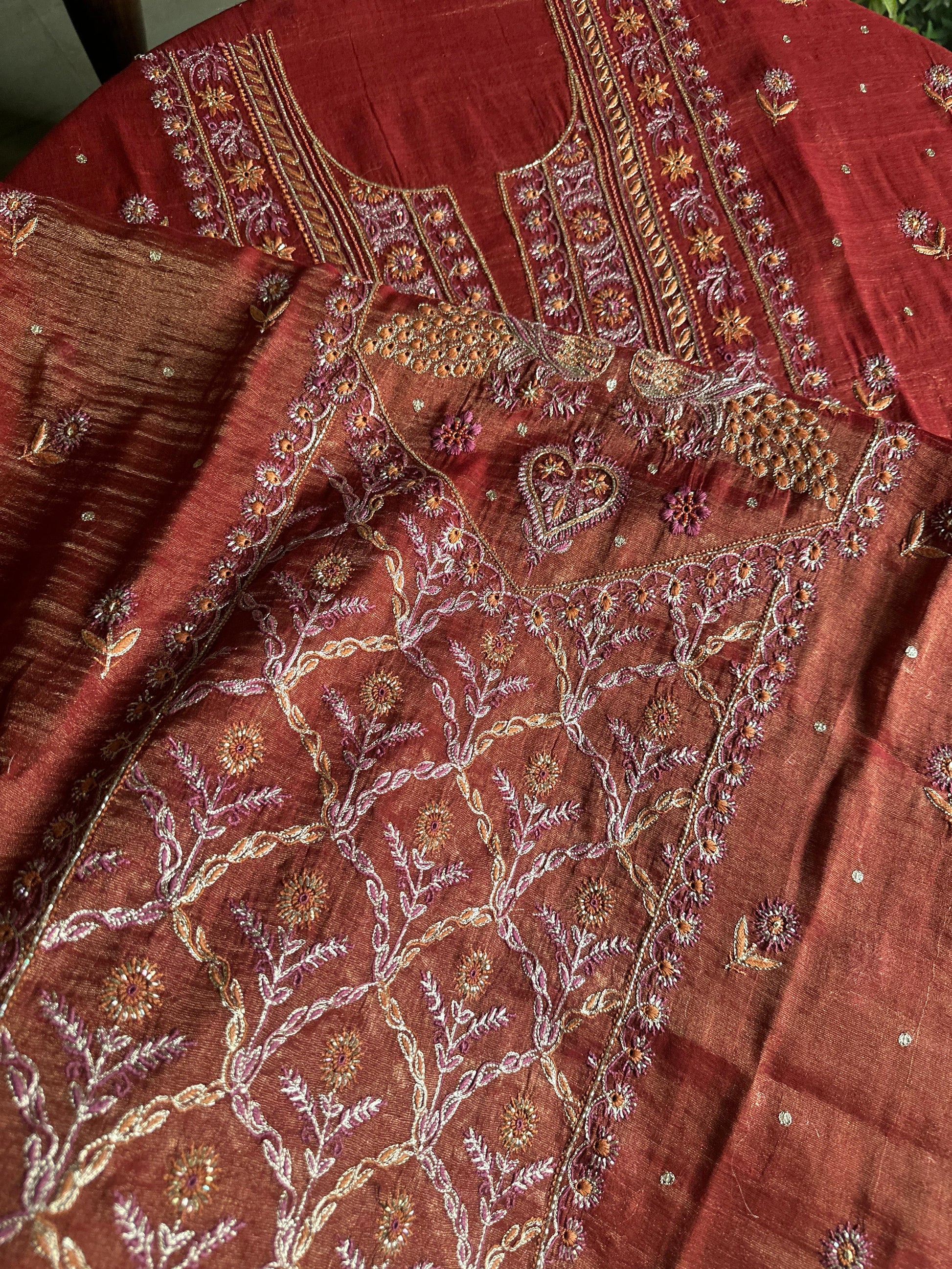 Red Tissue Silk Chikankari Unstitched Fabrics