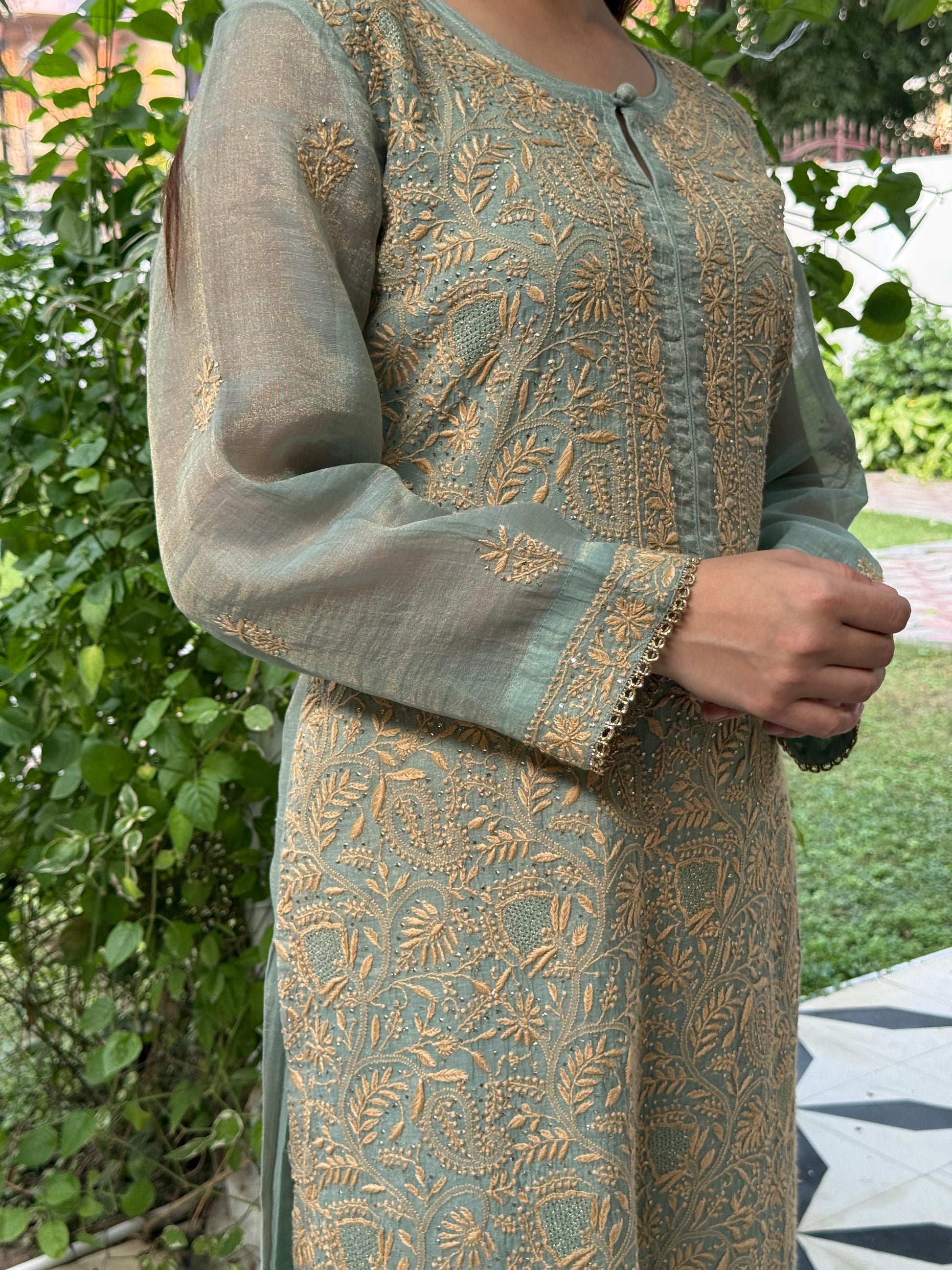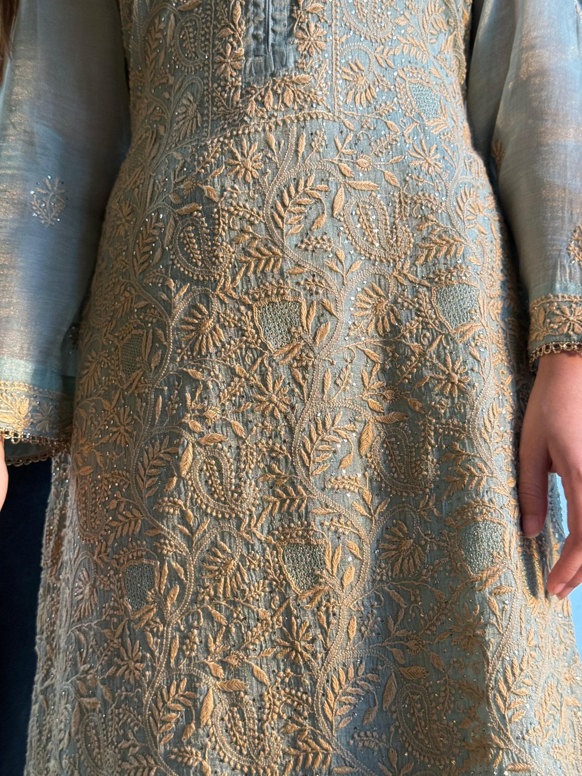 Intricate chikankari jaal kurta set done with fine chikanwork and minimal mukaish kamdani, comes with a similar tissue silk dupatta.