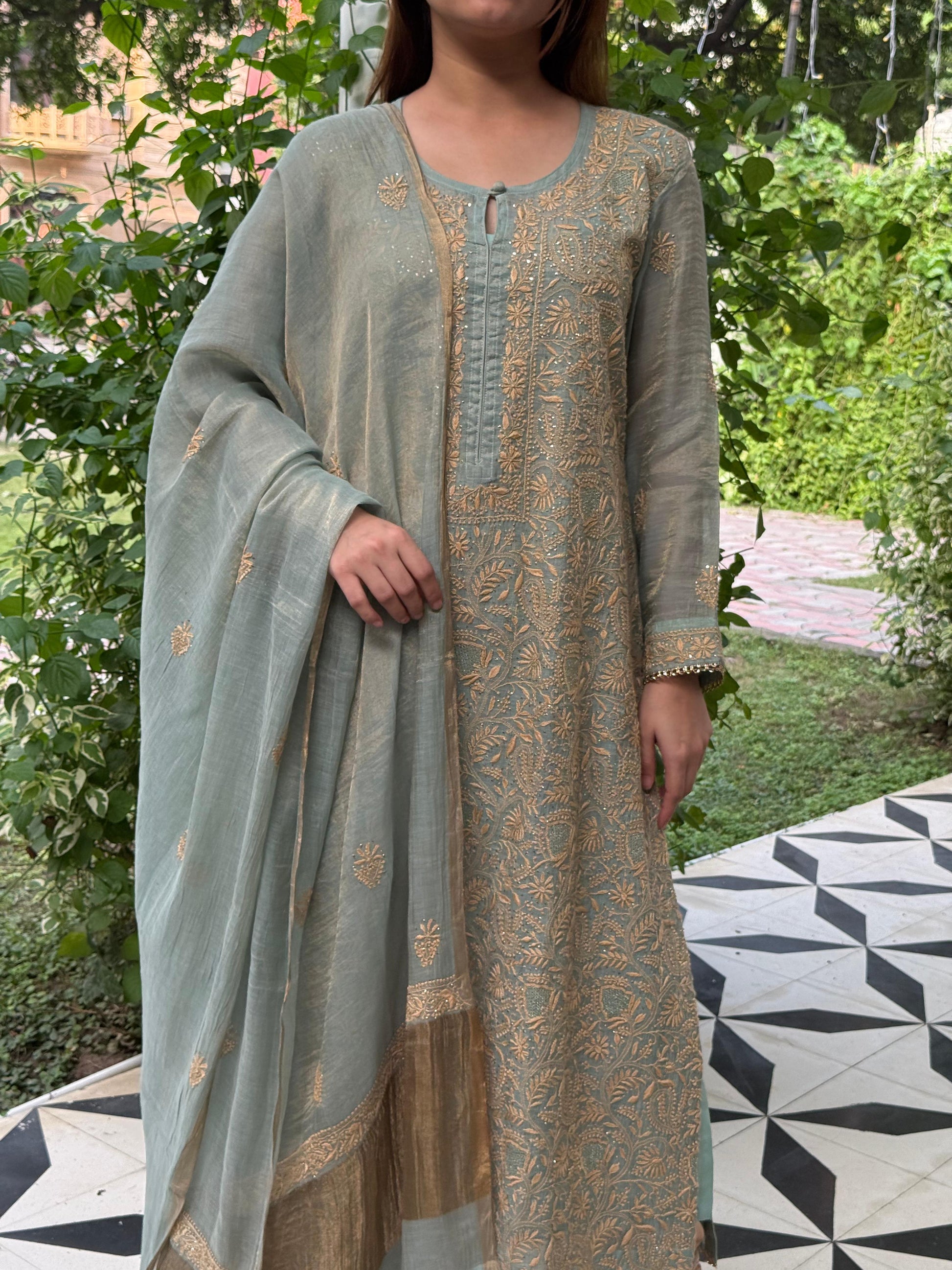 Cement Shade Tissue Silk Chikankari Straight Cut Kurta Dupatta Set