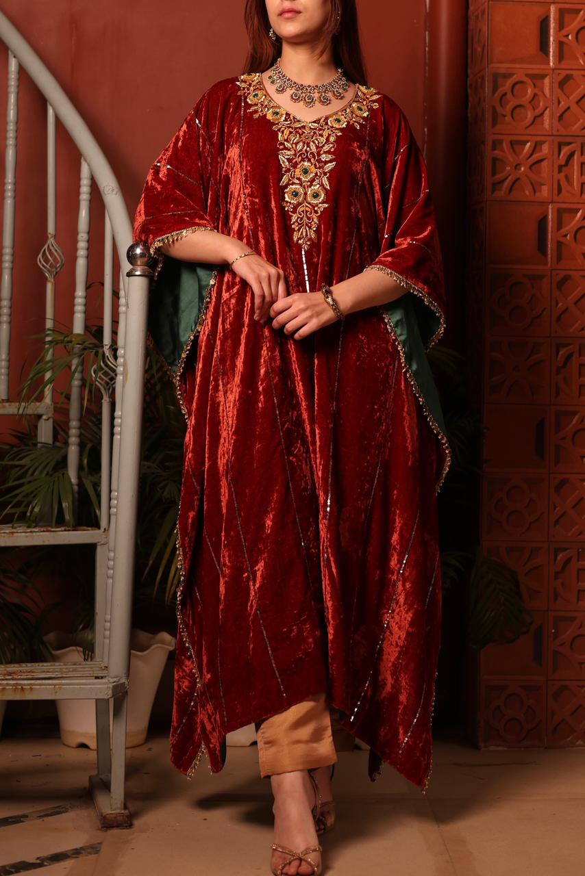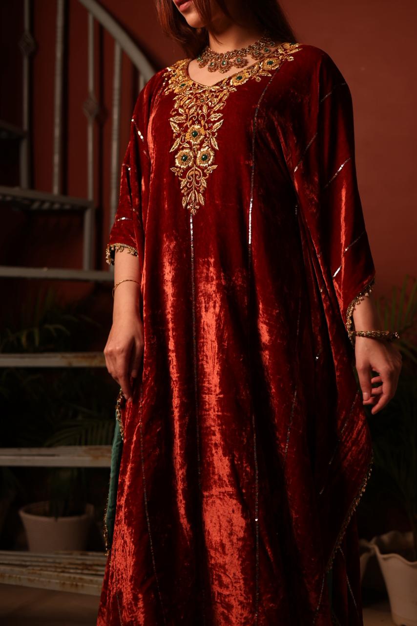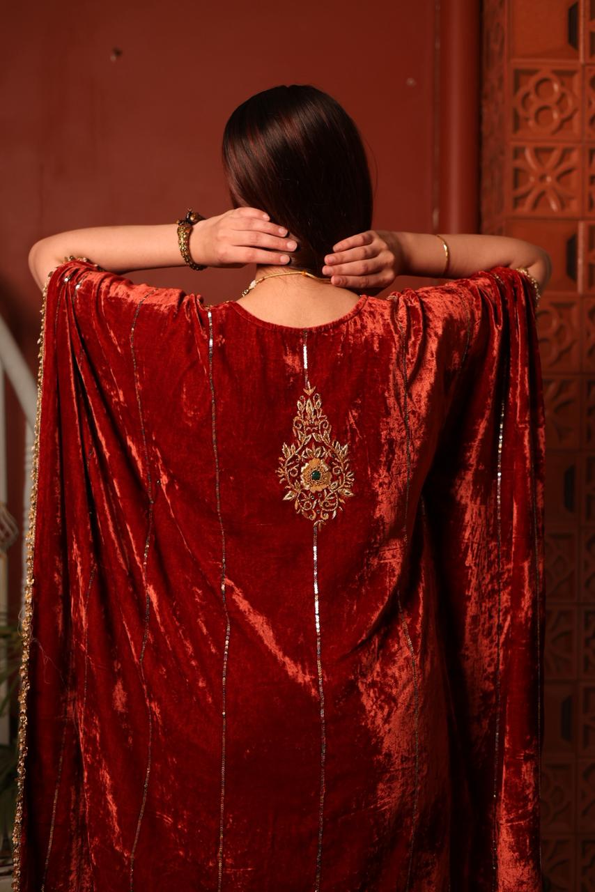 Traditional Awadhi zardozi on silk velvet short kaftan finished with coin lace comes with an inner slip perfect for upcoming sunny winter soirée’s.