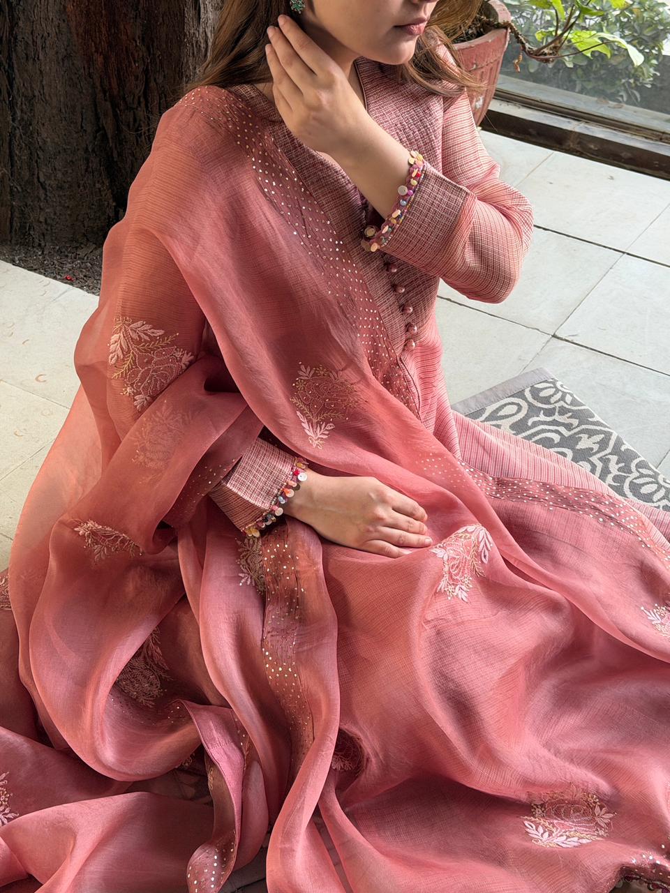 Salmon Pink Tissue Silk Dagla Kurta Set