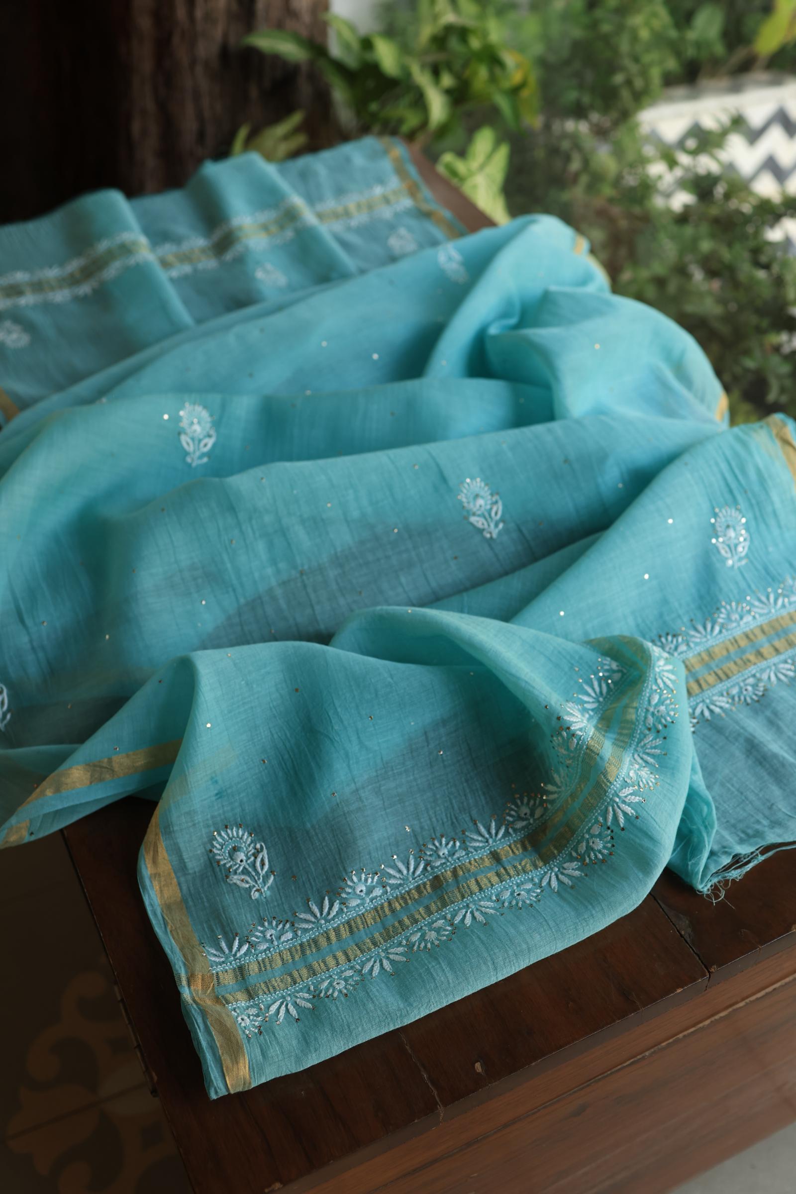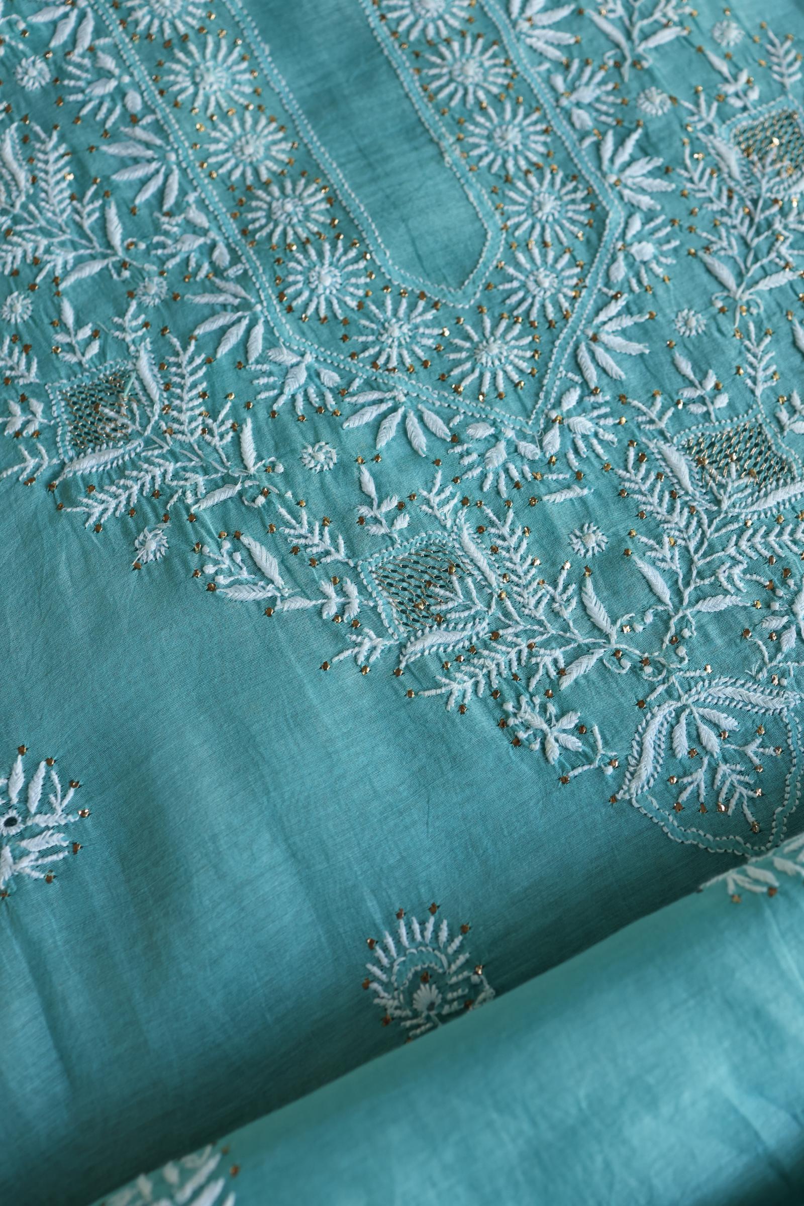 Sea Blue Shade Mal Cotton Fine Chikankari Unstitched Fabric