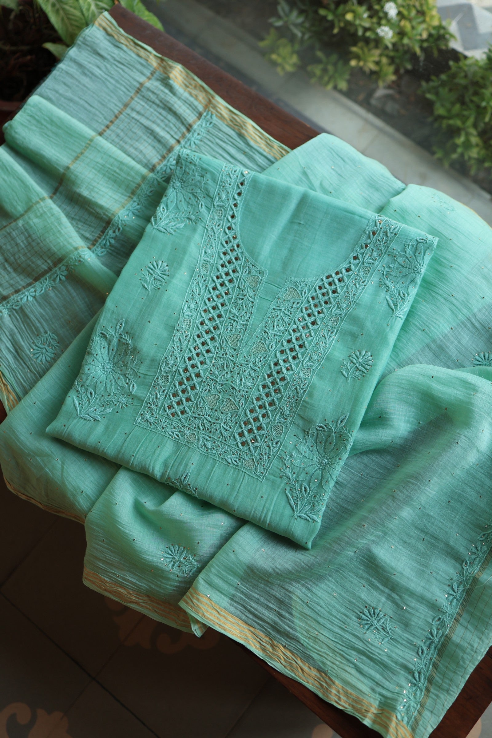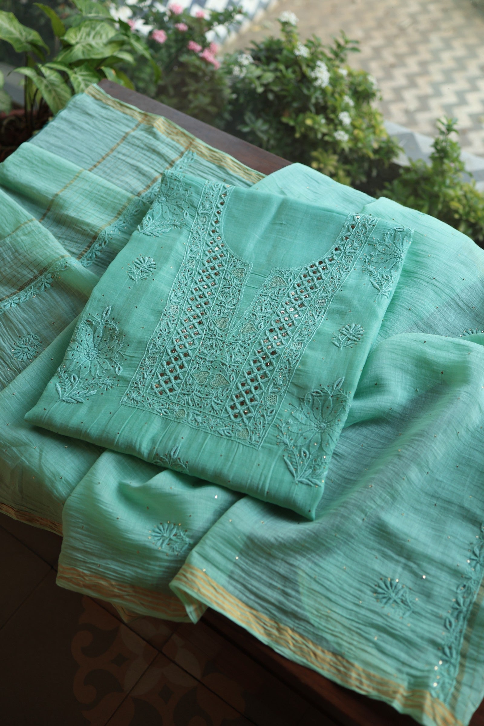 Each piece is crafted with intricate hand-embroidered Chikankari, featuring different traditional embellishments: