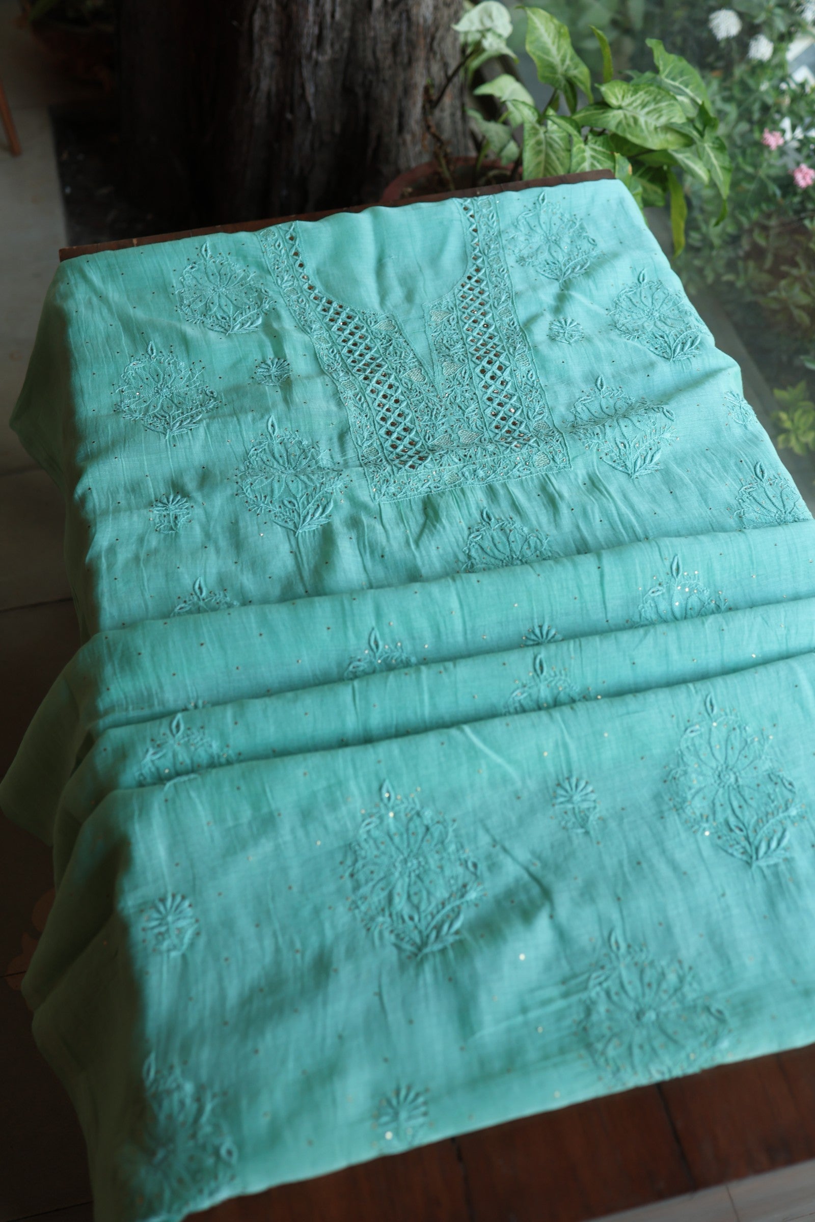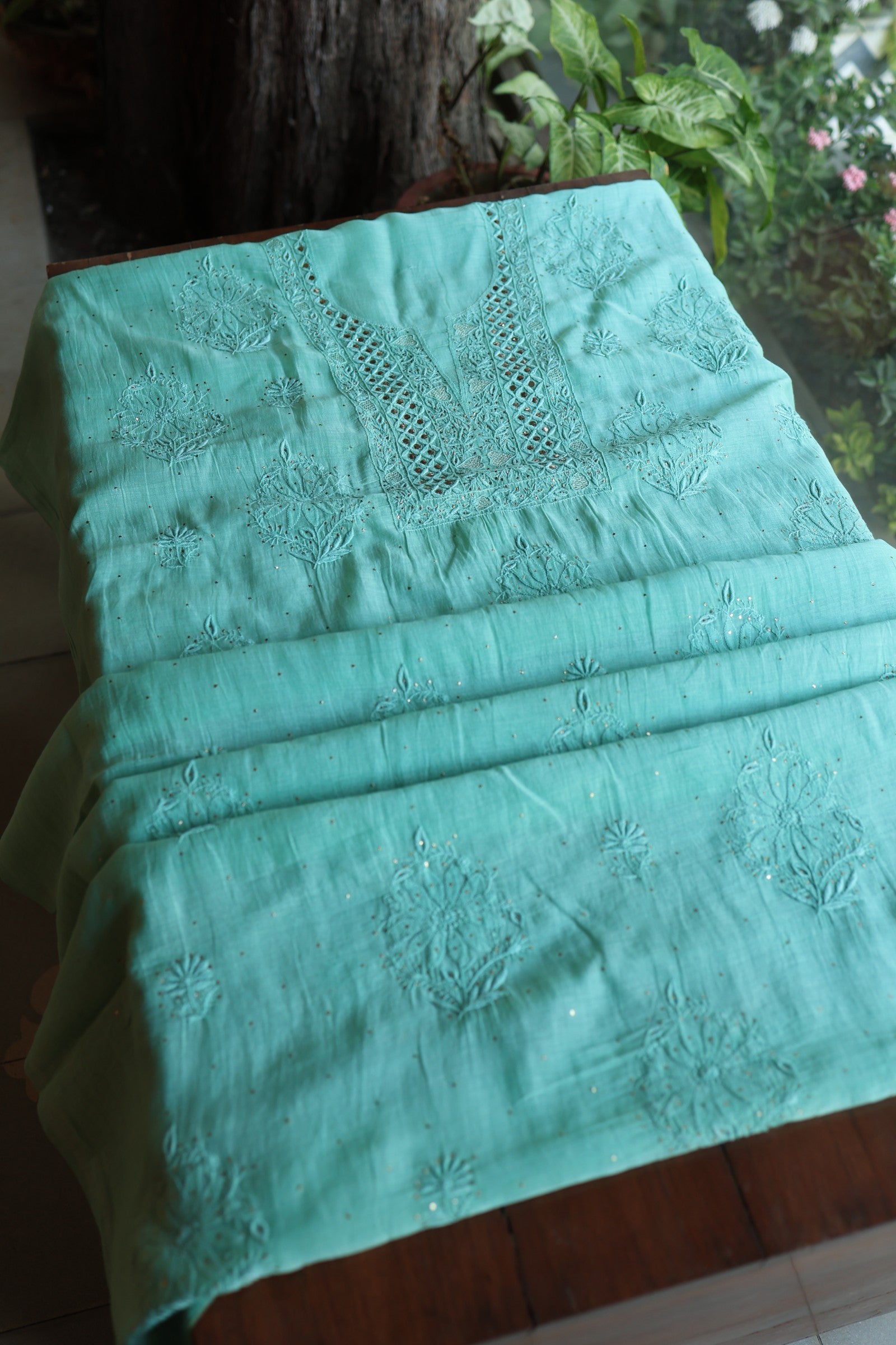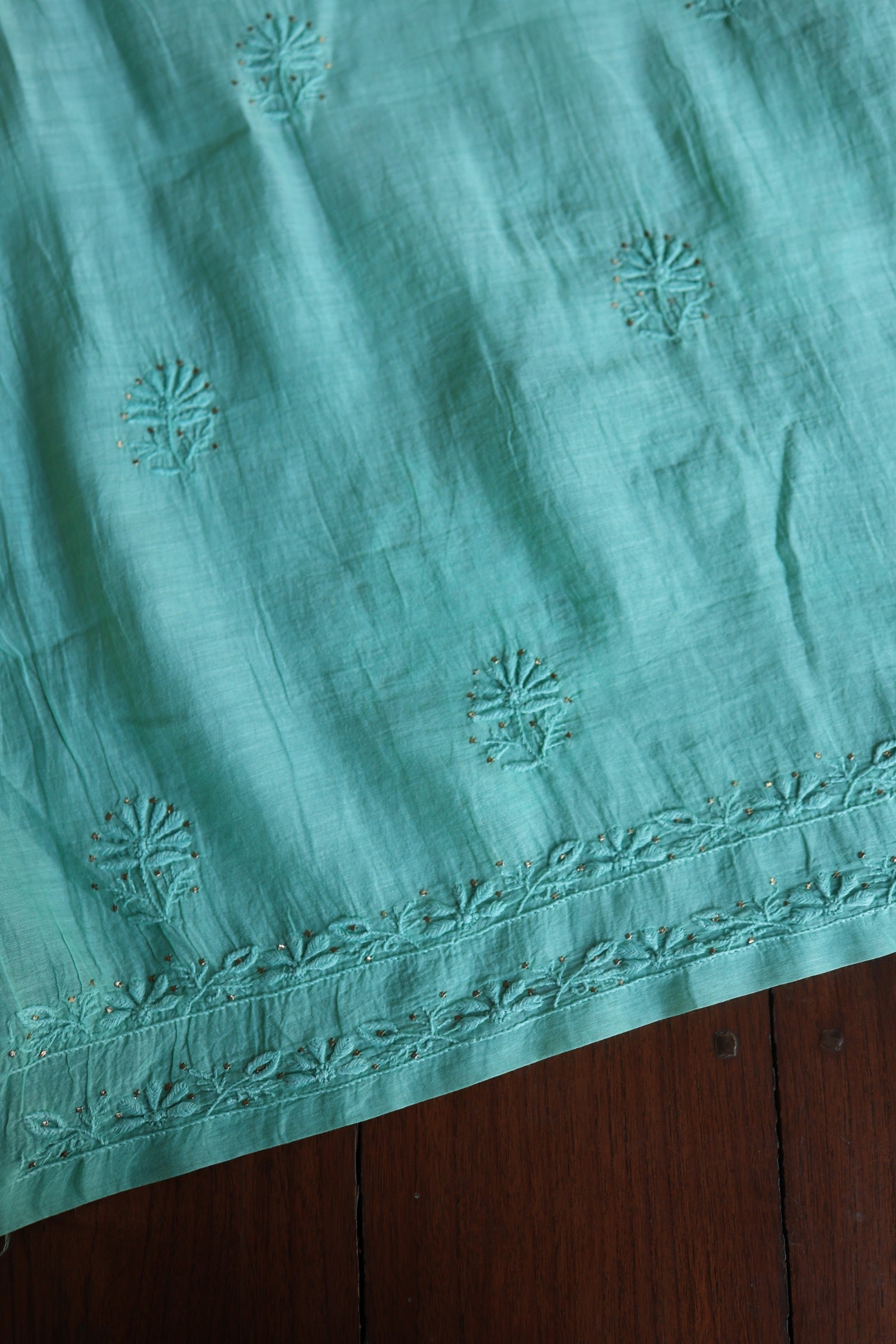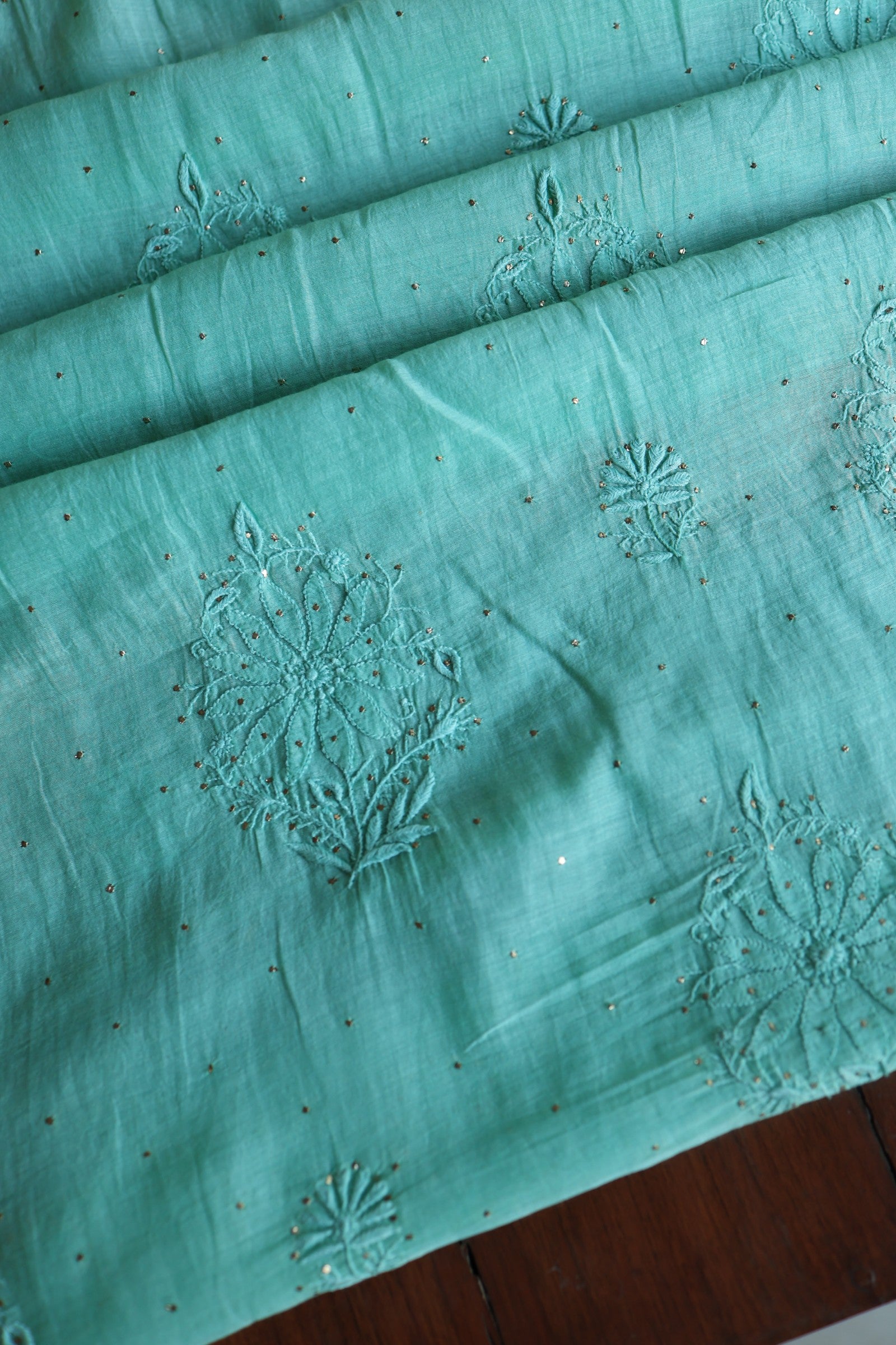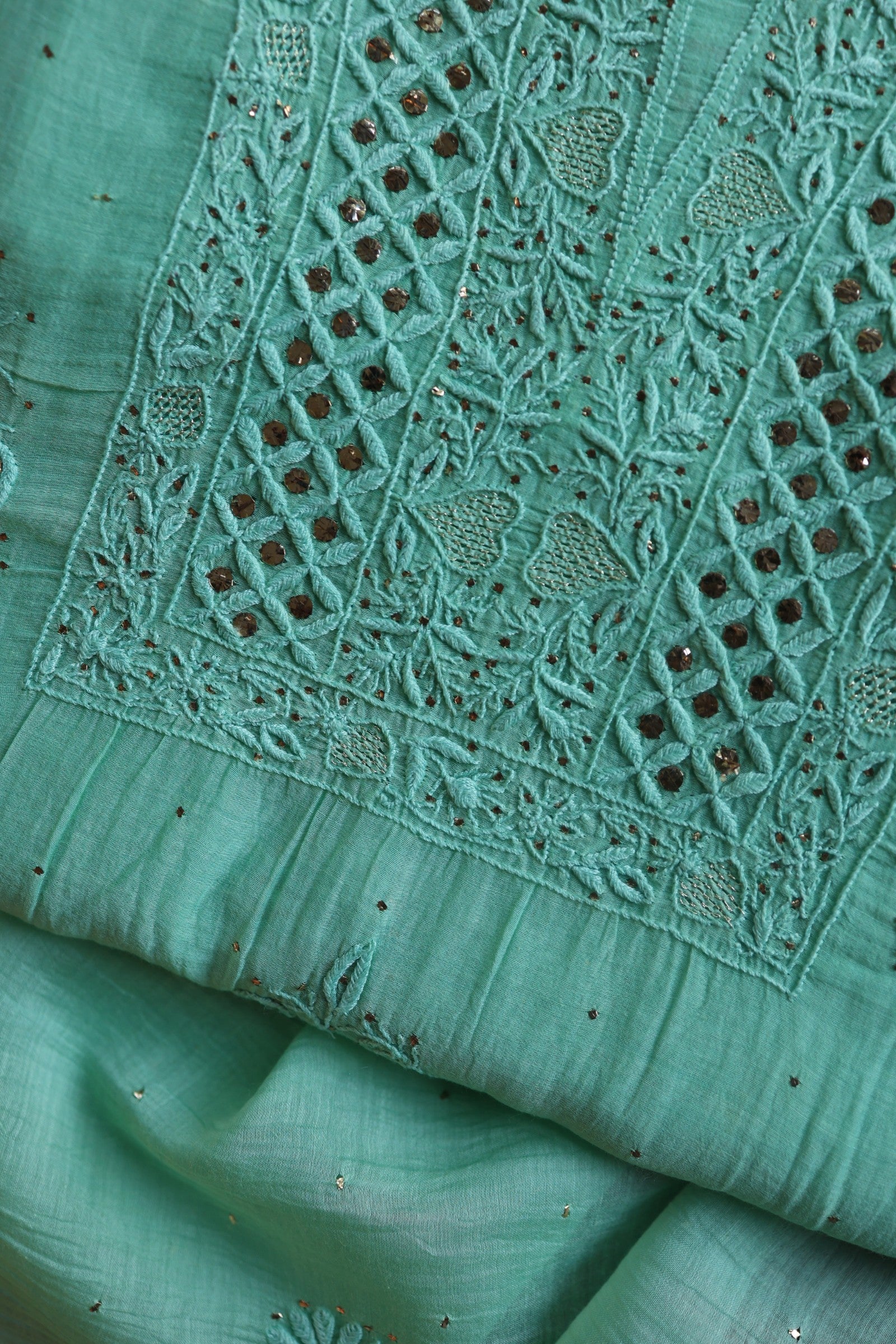Sea Green Mal Cotton Fine Chikankari With Kamdani Work Unstitched Fabric