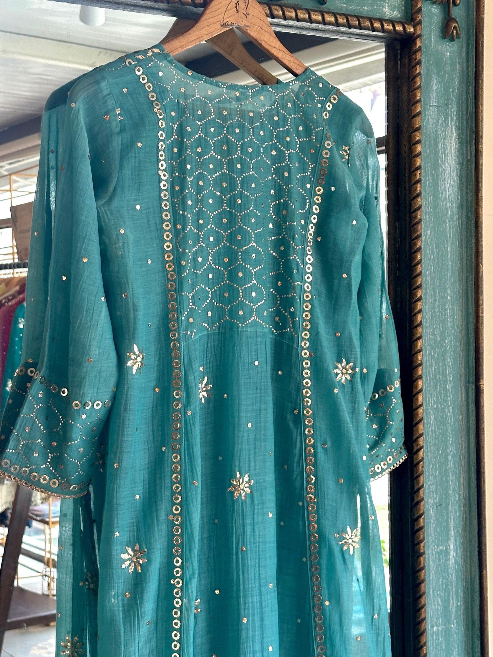 Sea Green Shade Mukaish Mul Chanderi Silk Dress