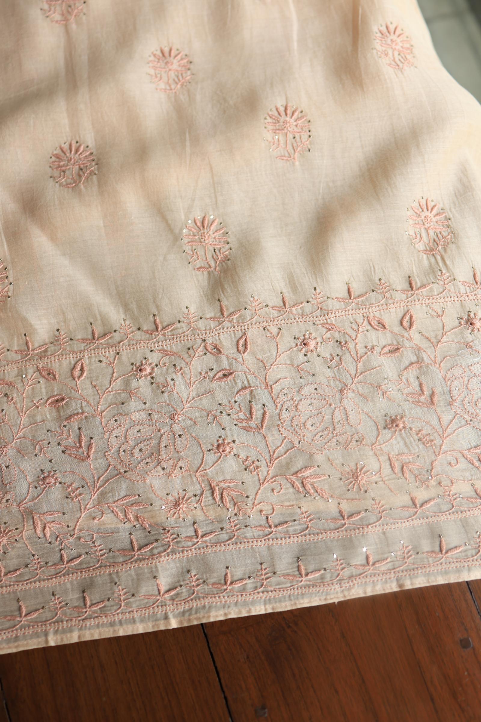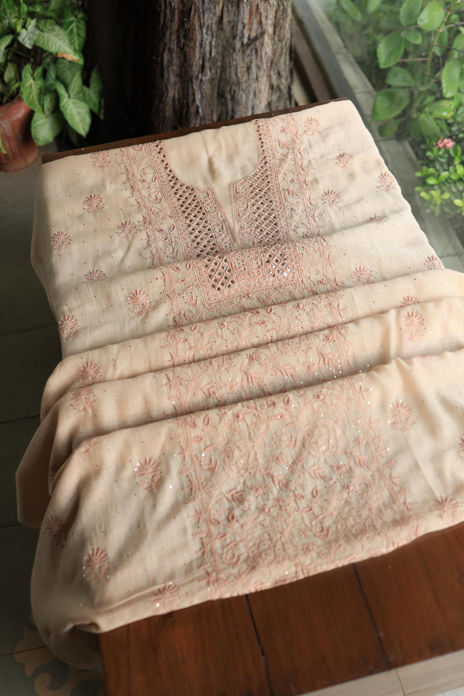 Silk Beige Mal Cotton Fine Chikankari With Kamdani Work Unstitched Fabric