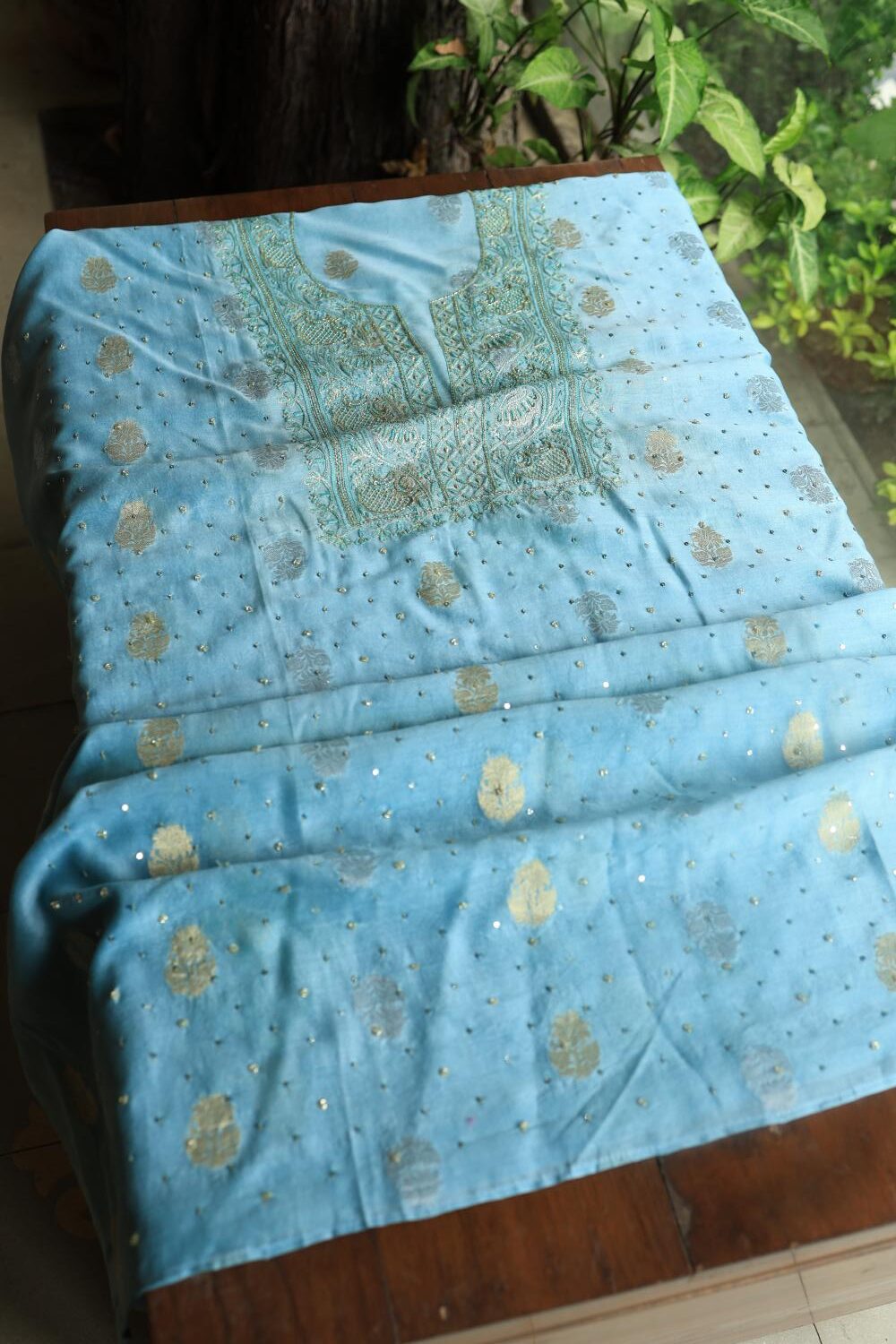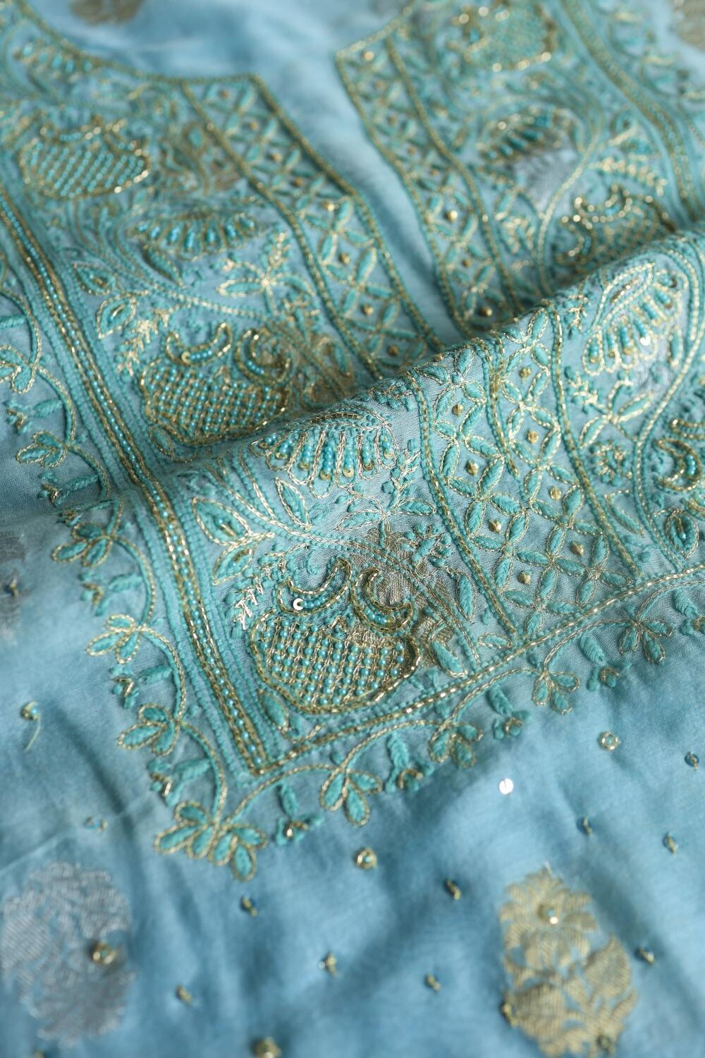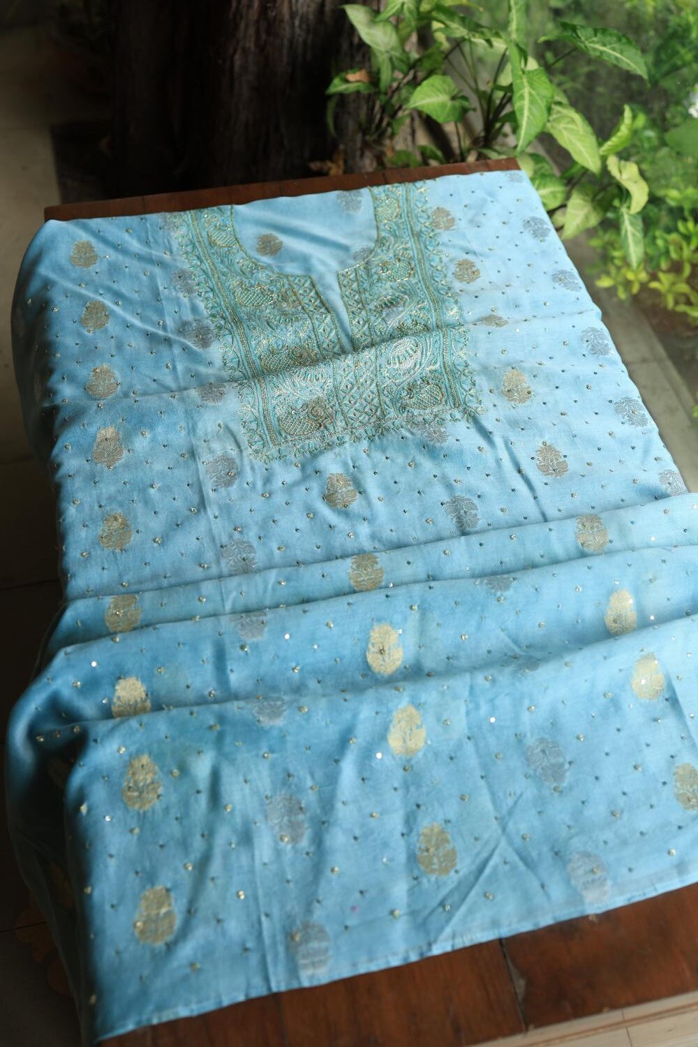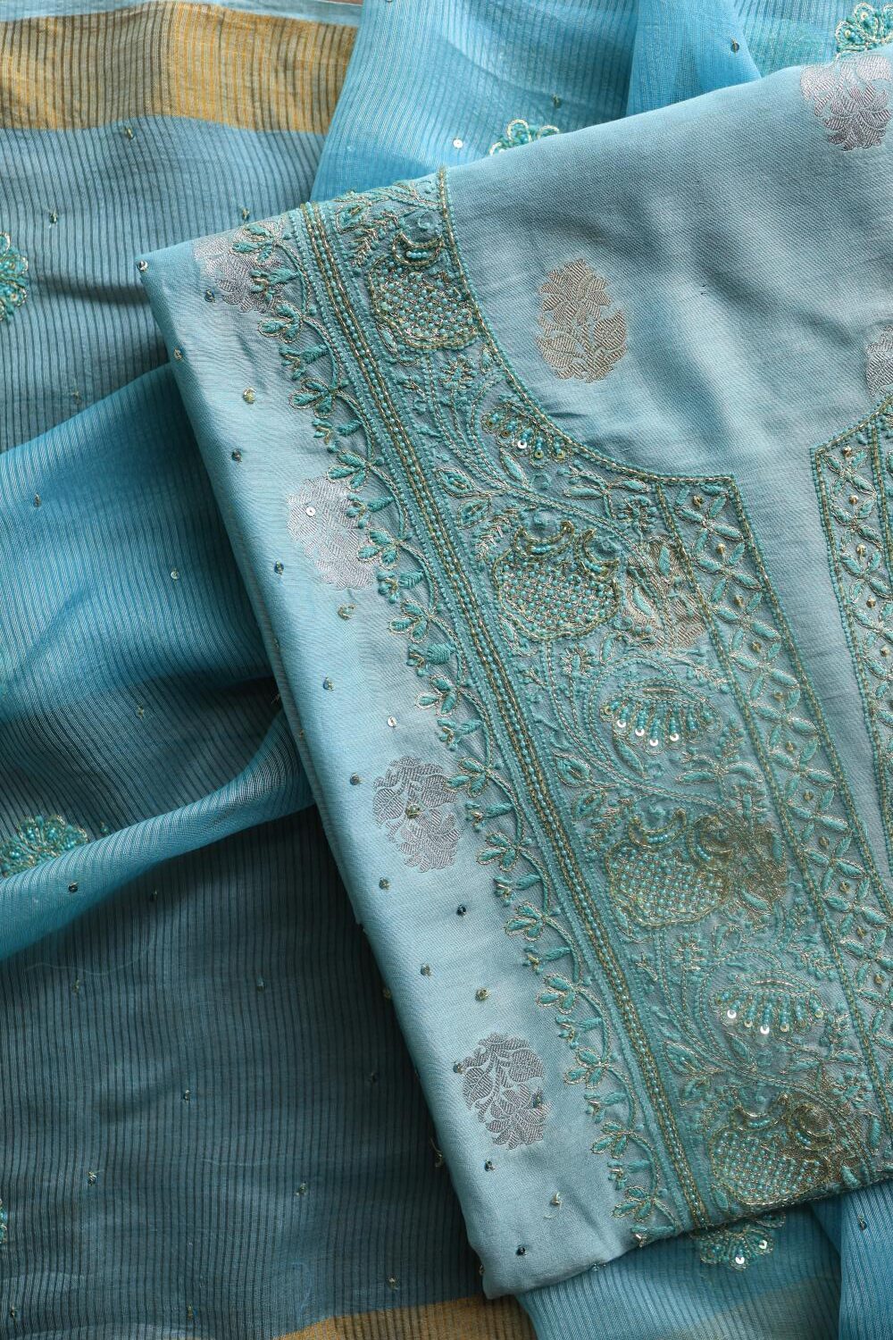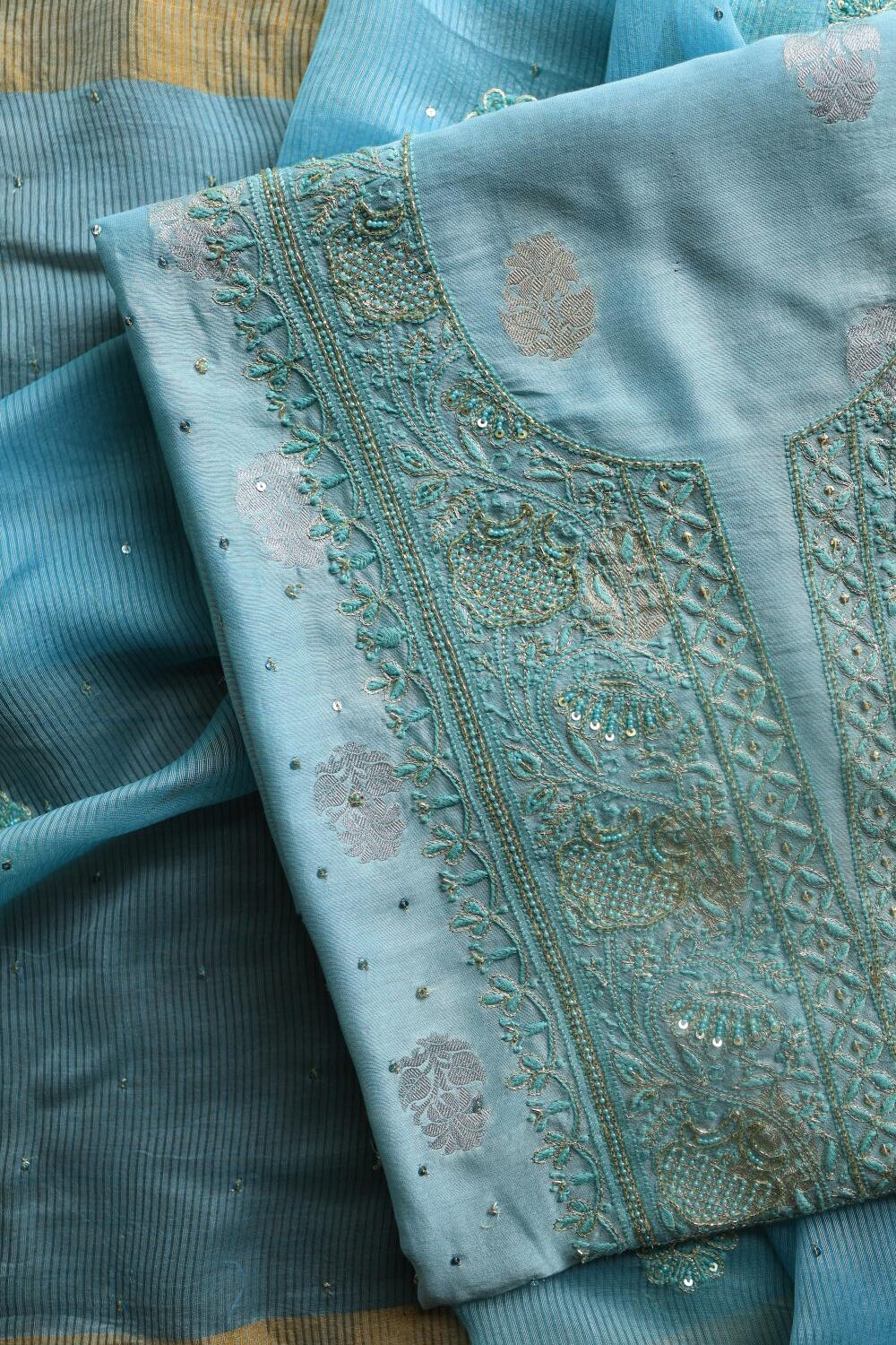 Sky Blue Banarasi Zari Chanderi Unstitched Chikankari Fabrics