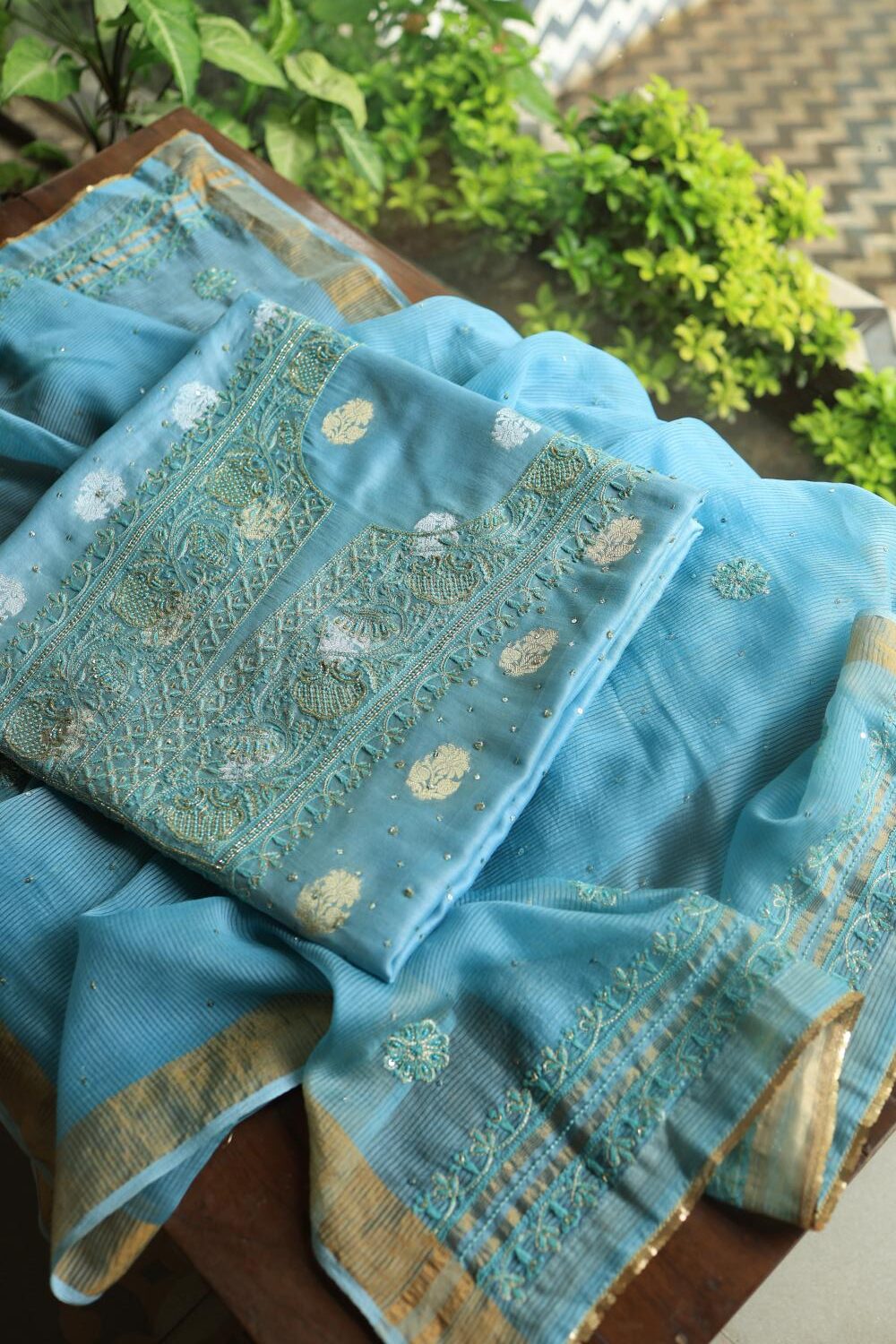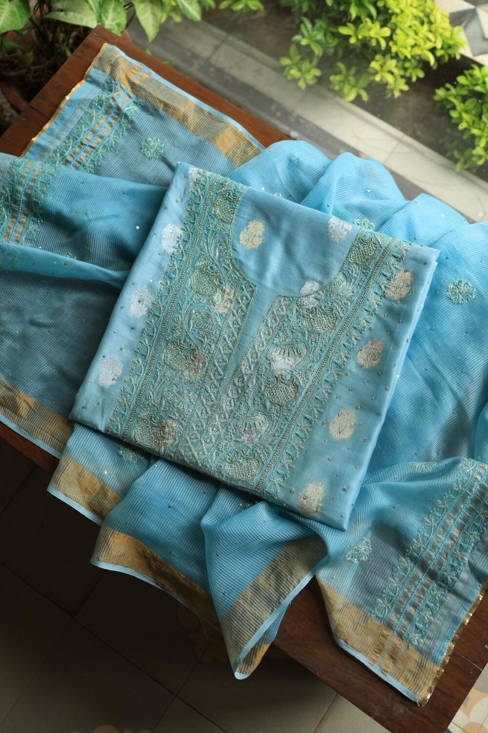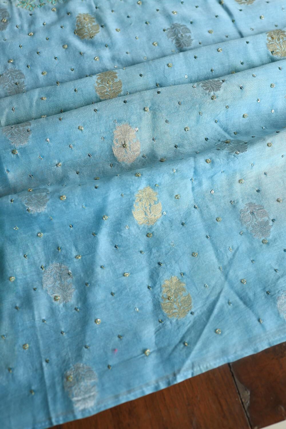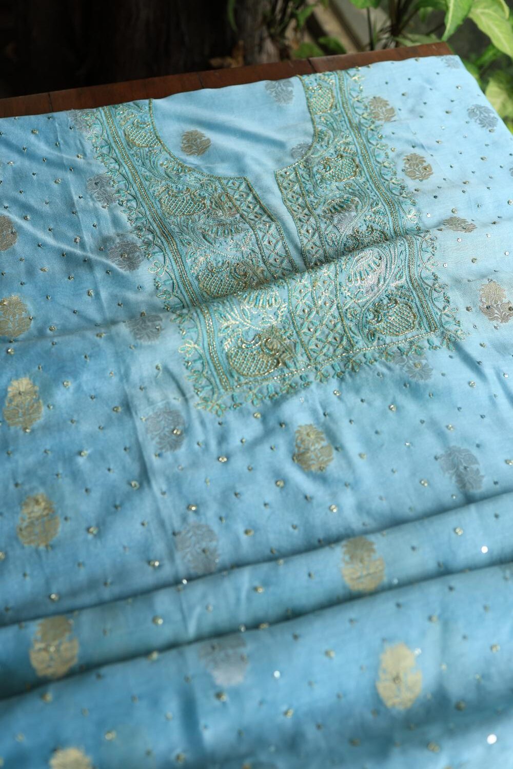 Sky Blue Banarasi Zari Chanderi Unstitched Chikankari Fabrics