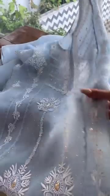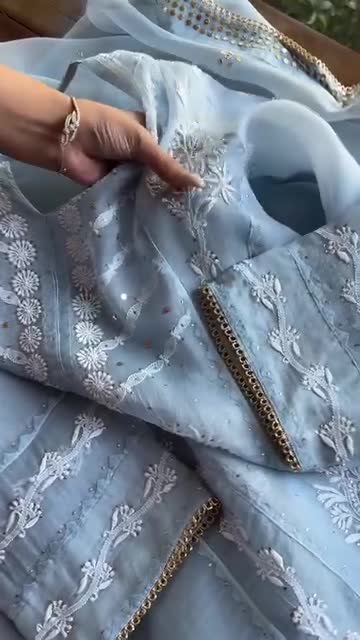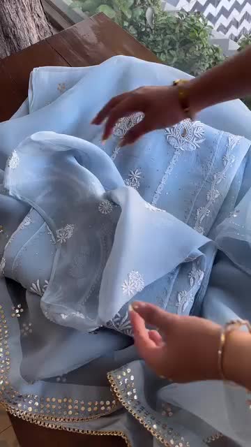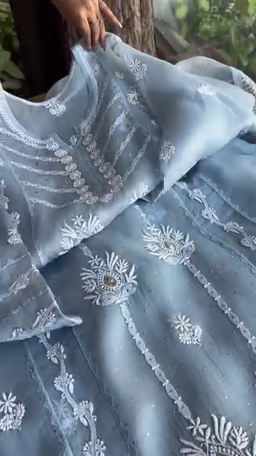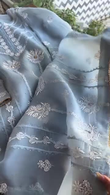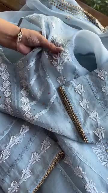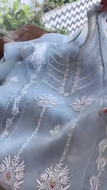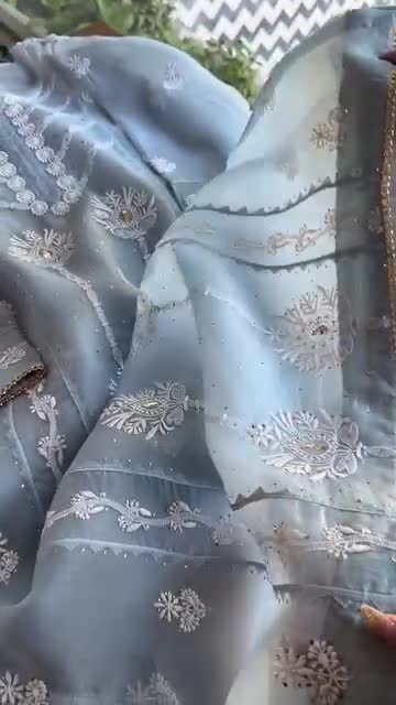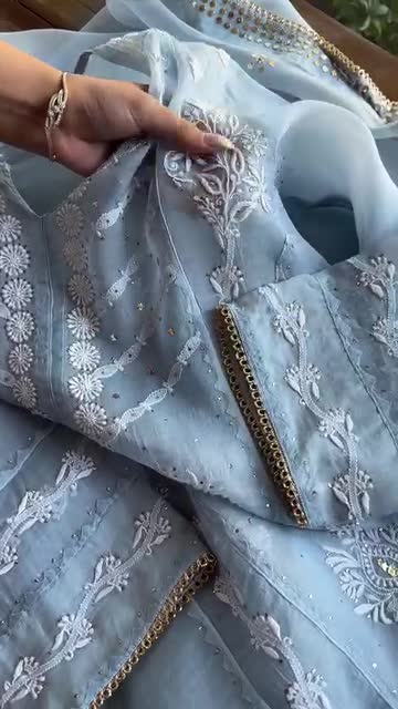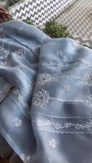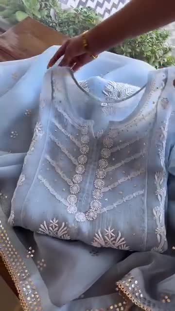 Elegant straight cut organza with intricate Chikankari kamdani embroidery done with the combination of appliqué work clubbed with Organza mahi jaal dupatta.
